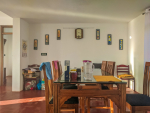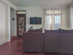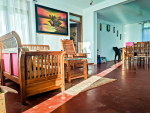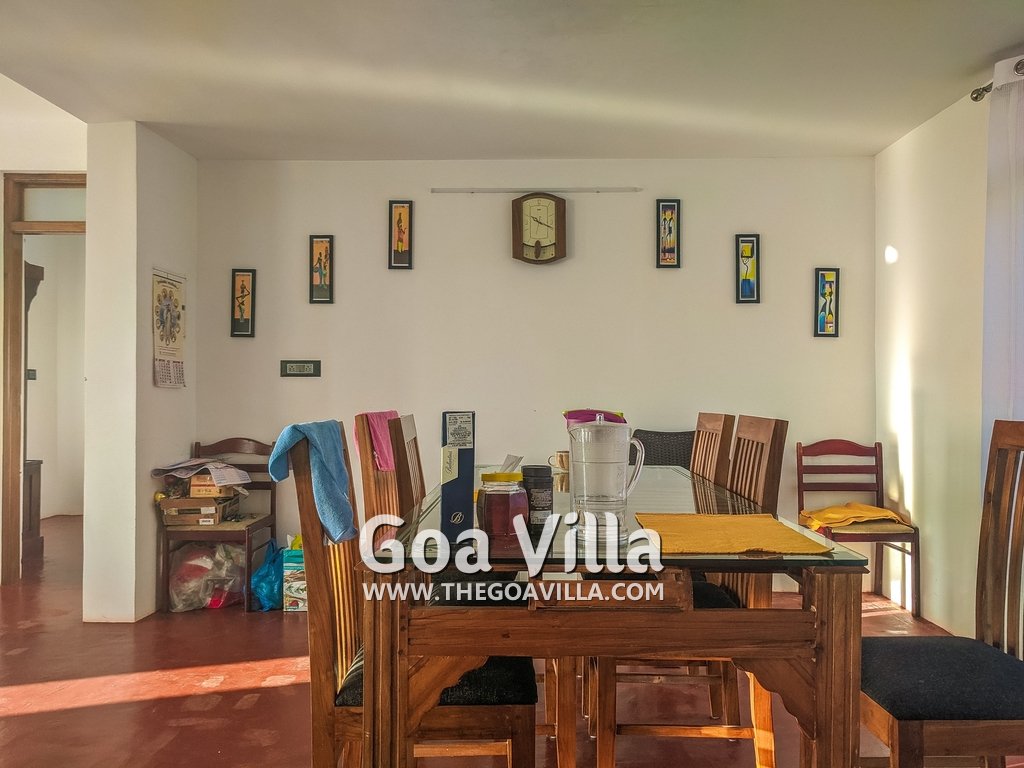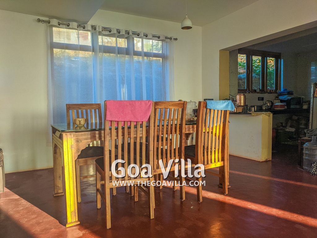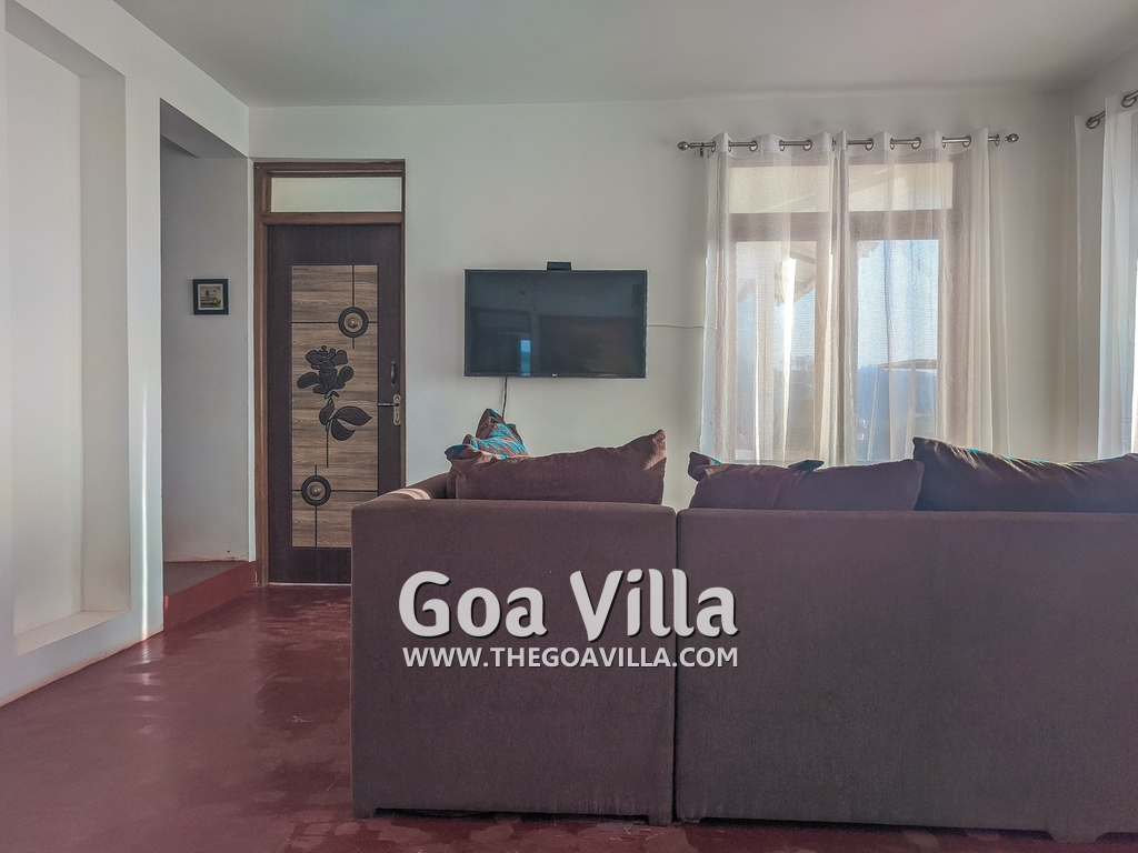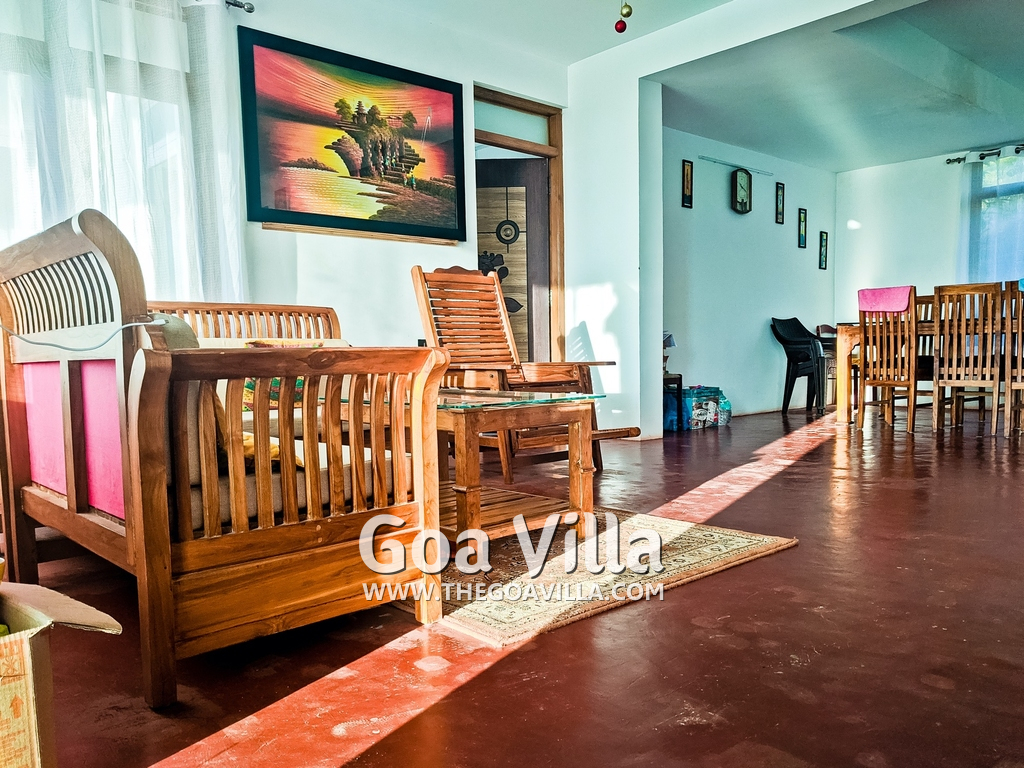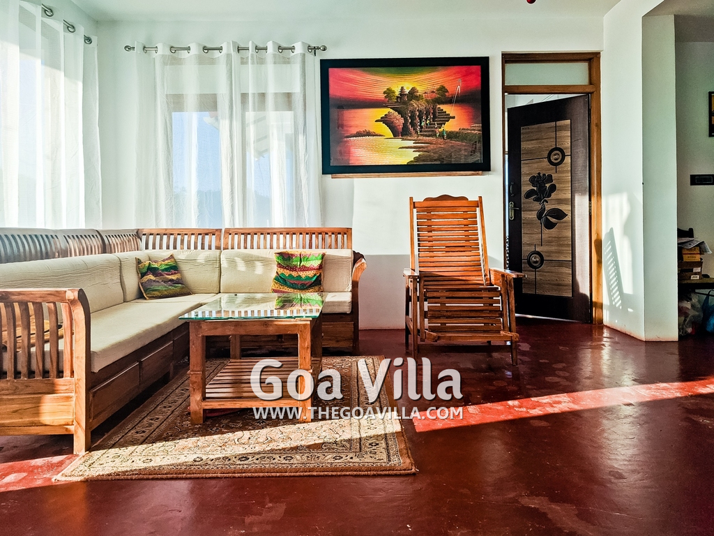 Living Room – This holiday villa has a large living room with 2 sofas – one modern, and the second traditional wooden. They are both comfortable with extra cushions. There is a glass-top center table, carpet, a rocking chair, paintings, and wall-mounted television. You will find large windows in this portion of the house as well.