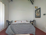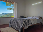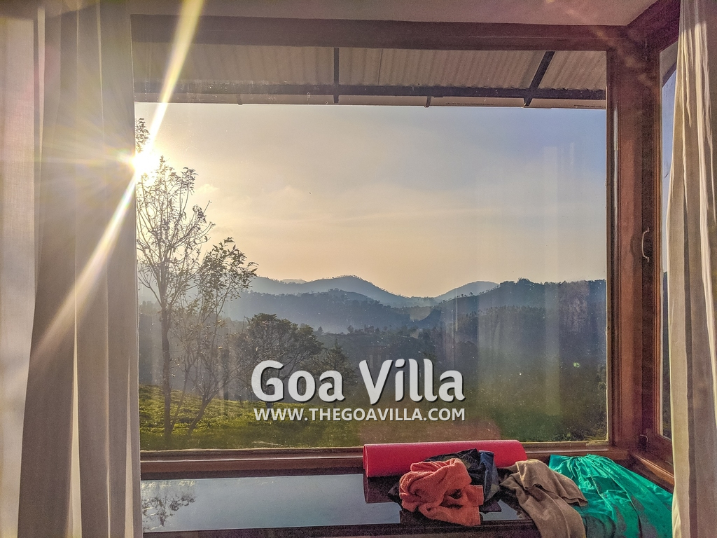 Bedrooms – The villa has 2 bedrooms with minimalist décor. There is a large Queen bed, wardrobe, mattress, dressing table, paintings on the walls, lamp shades, and sitting area. Whitewashed walls. High ceiling. Both the bedrooms have huge French windows offering views of rolling hills, trees, tea gardens. Just remove the drapes and beautiful nature greets you.