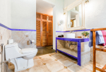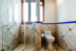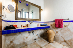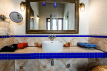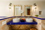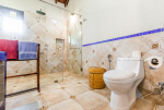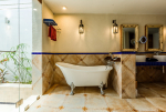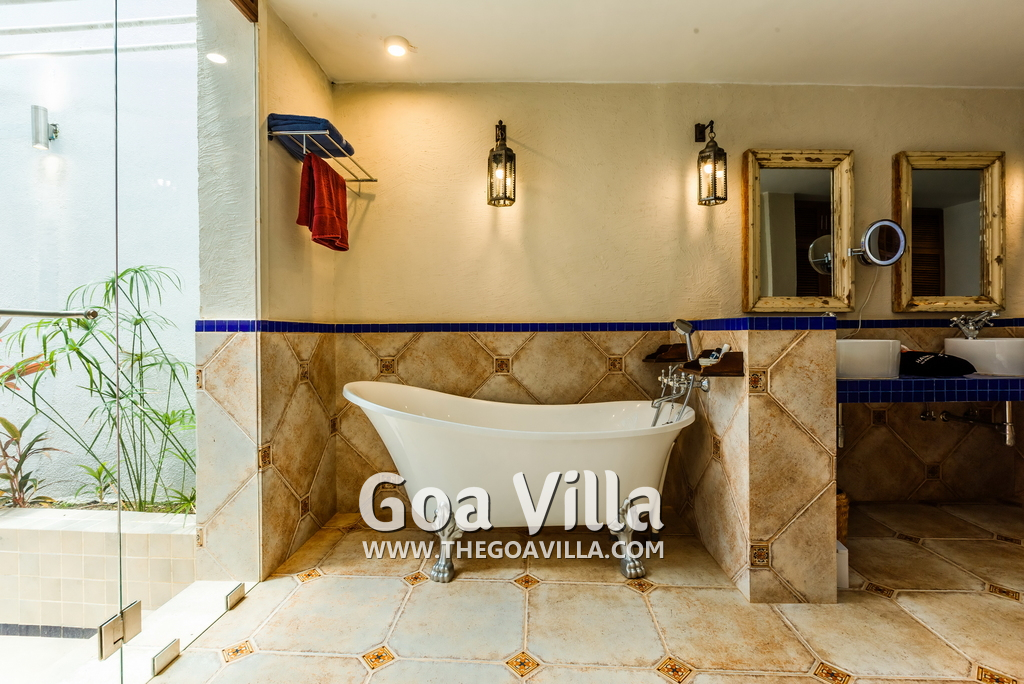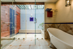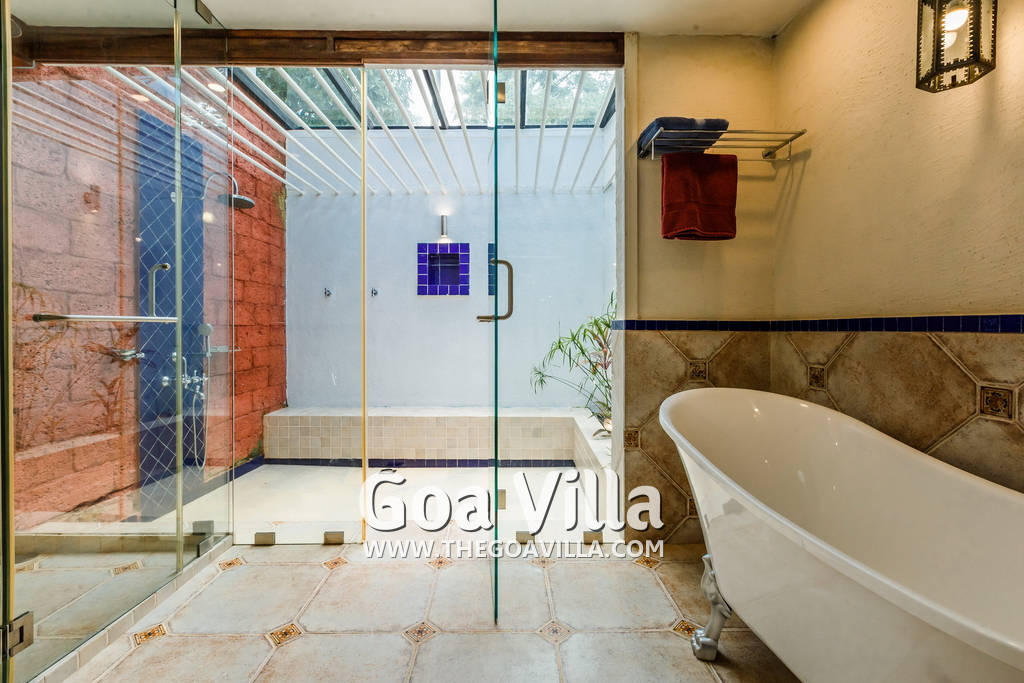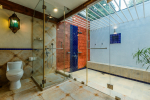 Bathrooms – Modern tiled bathrooms with a large sink, mirror, shower cubicle, and bathtub. The en-suite bathrooms have partially open roof allowing natural sunlight.