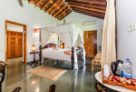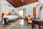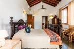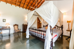 Bedrooms – All 4 bedrooms are en-suite and air-conditioned. They have antique furniture. Large comfortable beds, wardrobe, bedside table, lamp shade, sitting area, study table, and rug. The bedrooms have tea/coffee maker and other amenities. Traditional Indian thatched roof high ceiling allows plenty of air and wind flow. Bedroom 2 has a second bed for additional sleeping.