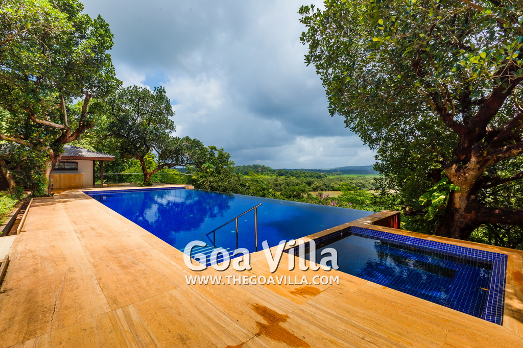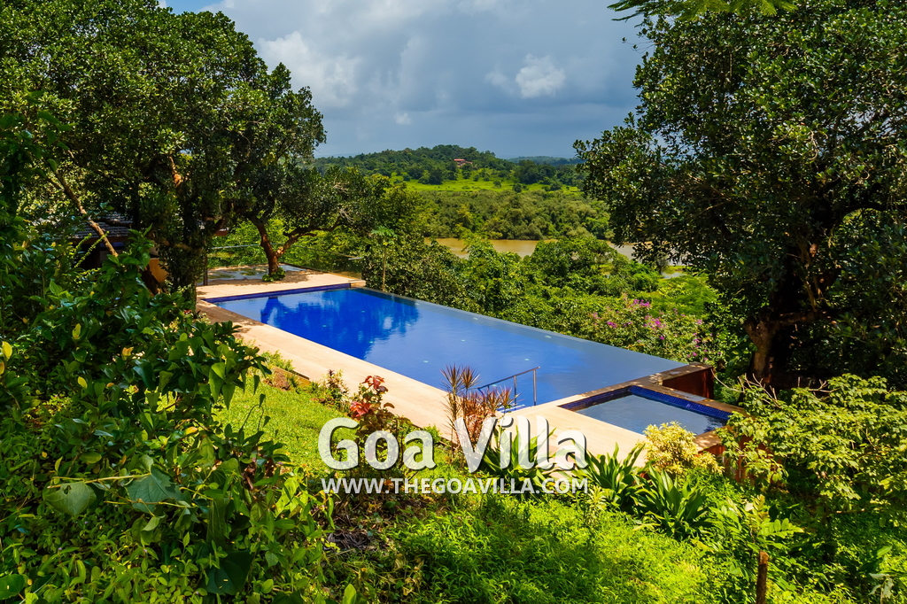 Jungle Villa 3 is a 4-bedroom luxury house for rent at Aldona in North Goa. It is part of a complex of three villas, all close to each other, with a total room capacity of 11. Located on top of a small hill, Jungle Villa 3 offers stunning views of the Mapusa River. It is a modern house with contemporary architecture. There is an infinity pool at the edge with a Jacuzzi. Traditional, well-decorated interiors with antique furniture.