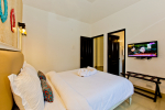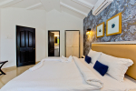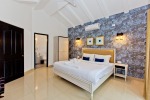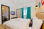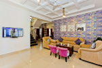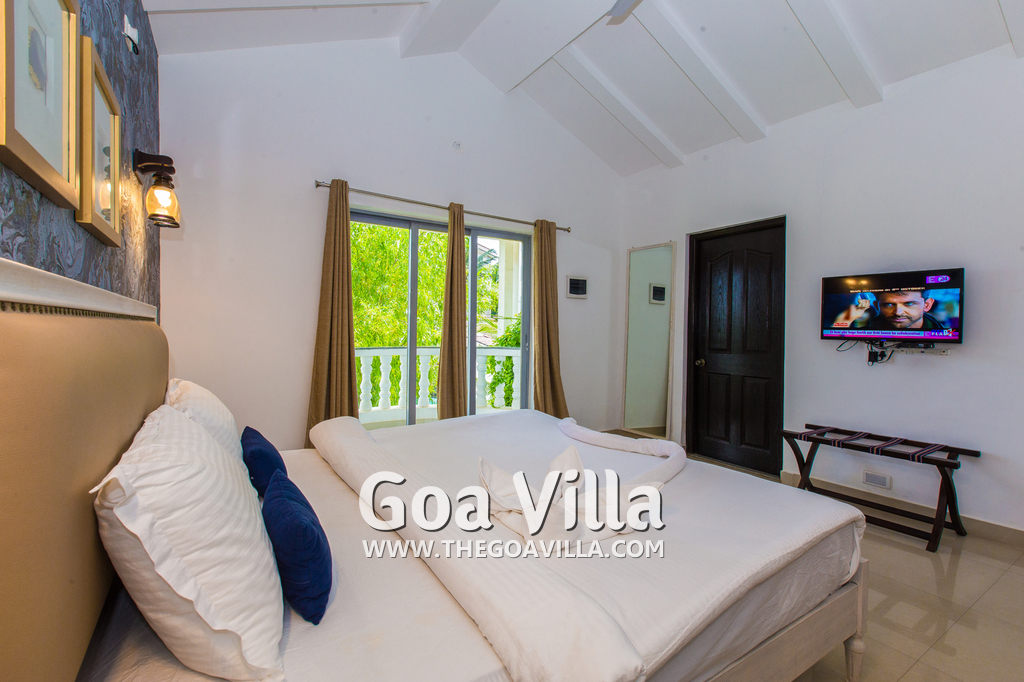 Bedrooms – Ground floor has 1 bedroom. The 2 others are on the 1st floor and are en-suite. One of them has a small attached balcony. There are 2 other huge balconies on the 1st floor. All the bedrooms are air-conditioned. The bedrooms have large comfortable beds with extra cushions, side tables, wardrobe, wall-mounted television, paintings on the wall, and a large mirror. One wall has textured painting.