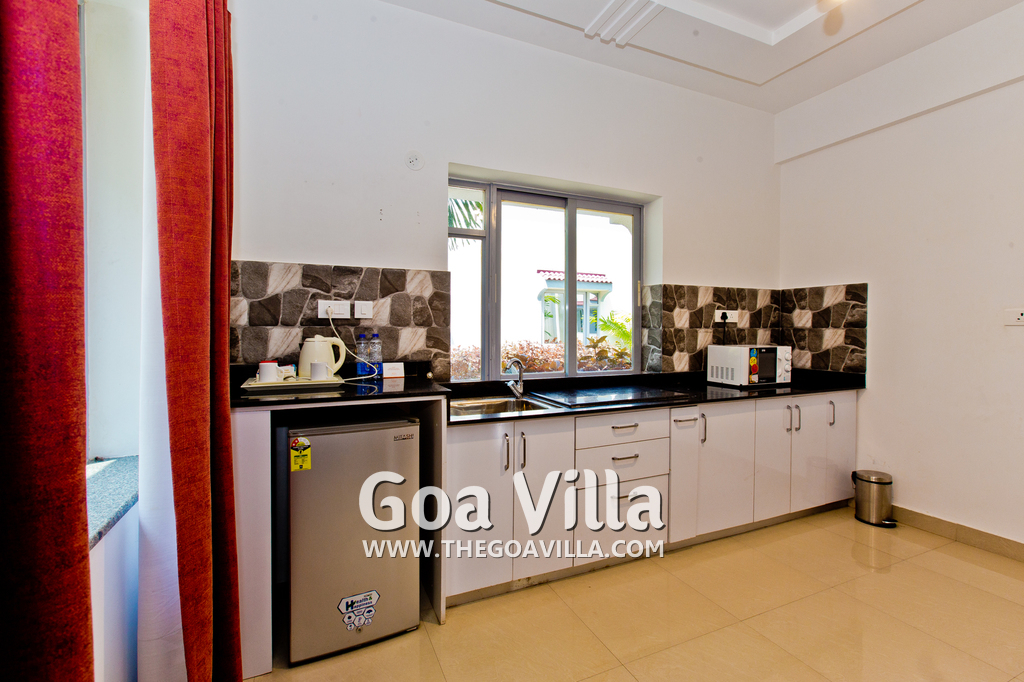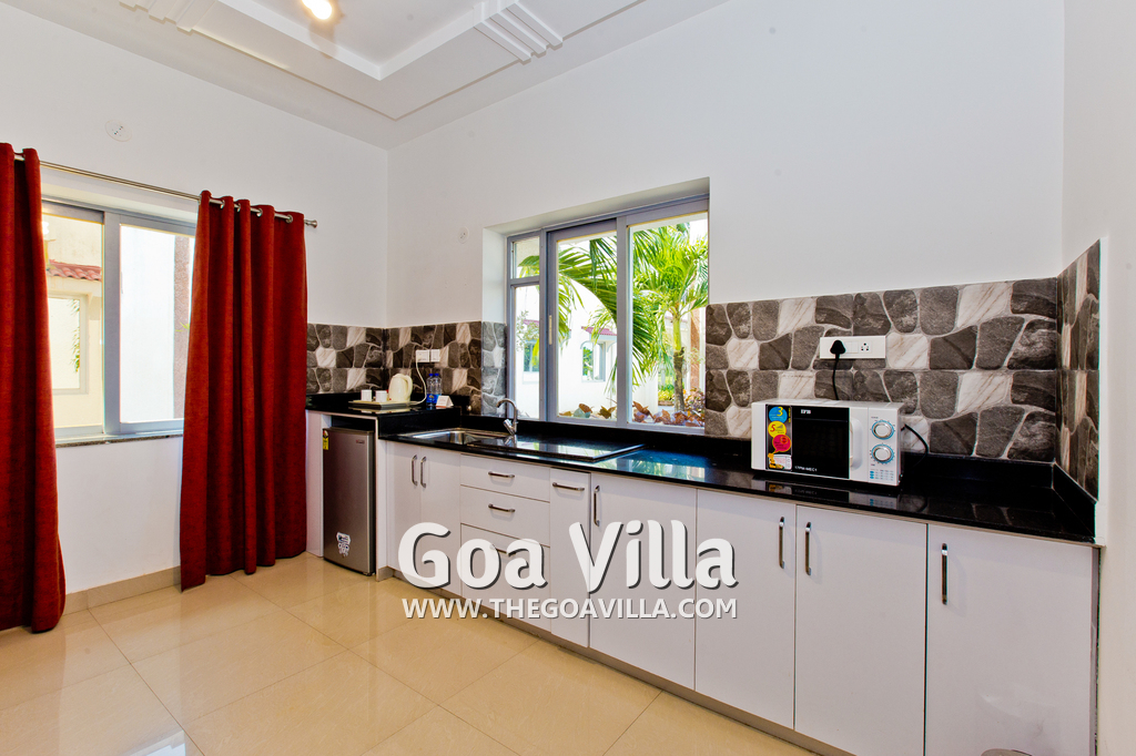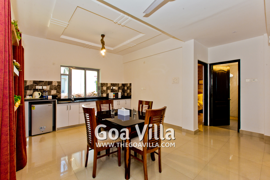 Kitchen, Dining – Astoria Villa has a fully-equipped open kitchen with a microwave, kettle, cooking station and small refrigerator. It is a modular kitchen. All utensils are provided. The dining space is between the kitchen and the living room. There is a small glass-top table with sitting for 4 guests.