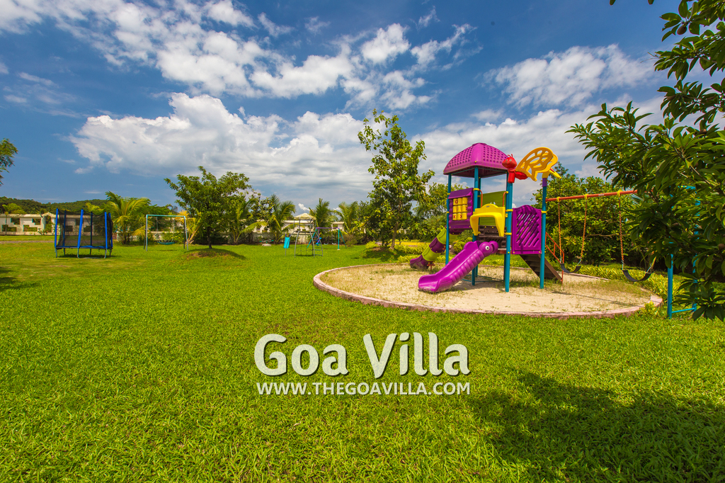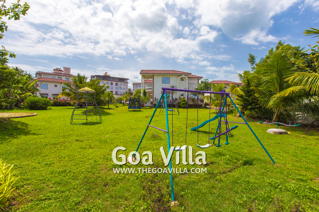 Astoria Villa is a 3-bedroom luxury property for rent at Morjim in North Goa. It is part of a complex with several villas, suites, and apartments. On the Chapora riverfront, there is a huge manicured lawn, children’s playground, gym and activity center, parking space, 24-hours security, and paved internal roads. The gated community has a beautiful swimming pool shared by all the guests. 2 of the 3 bedrooms are en-suite. The villa also has a fully-equipped kitchen, a living room, and dining space.