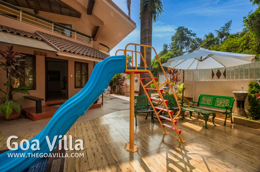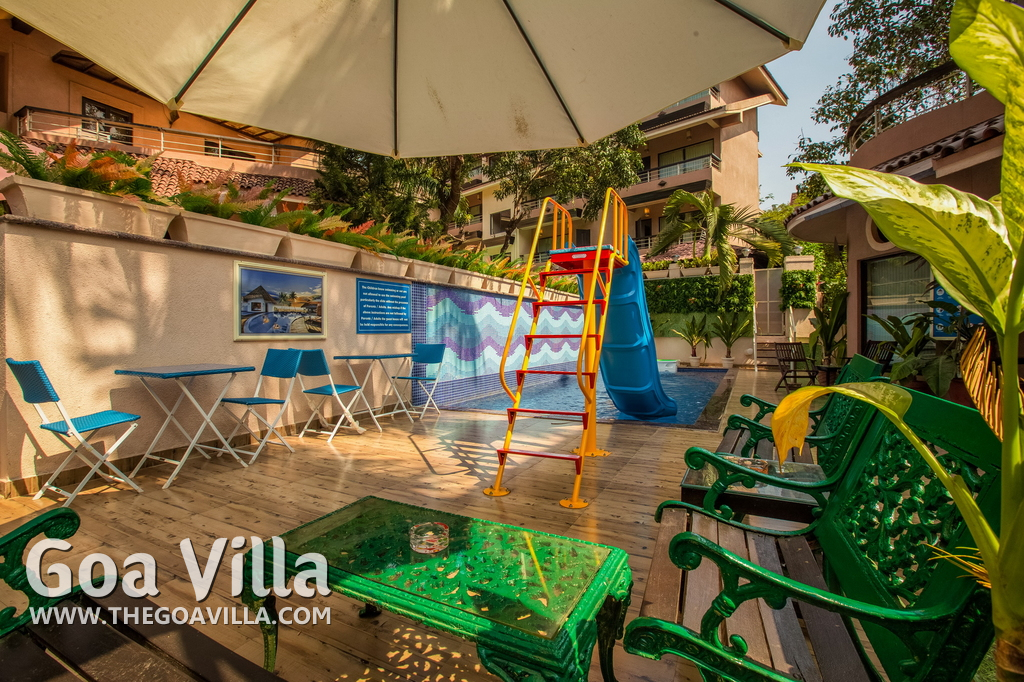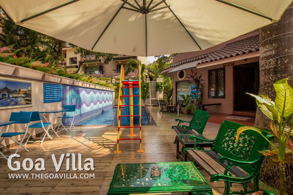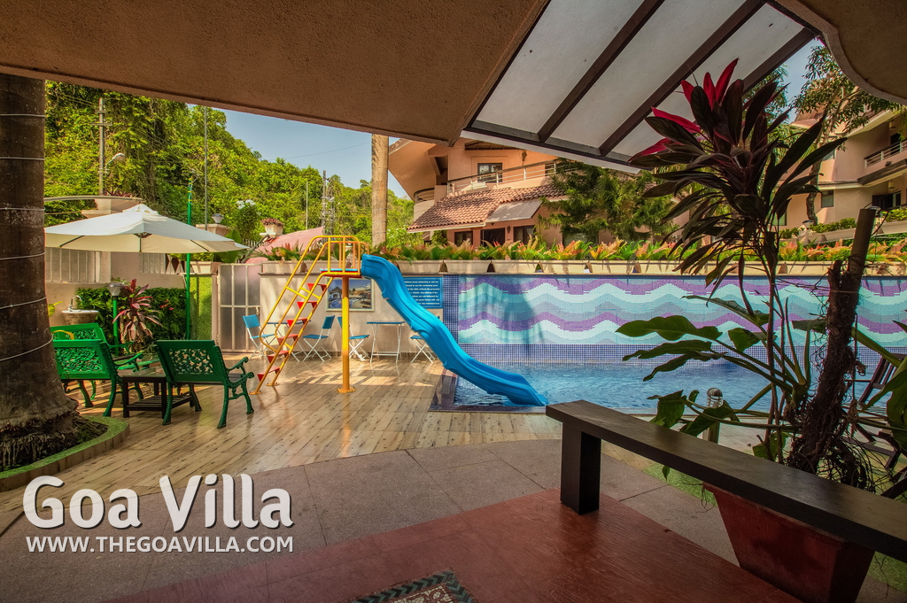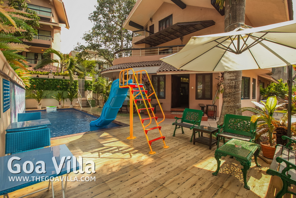 Swimming Pool – Stay in this villa and use its private swimming pool. The 32-feet pool has a shallow end with steps going into it gently. There is also a water slide that the kids will love. Garden benches with umbrellas are placed on the sundeck. There are a few tables as well where you can enjoy snacks or drinks after a splash in the pool. There is a lot of greenery in this part of the villa.