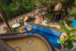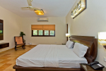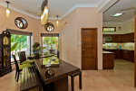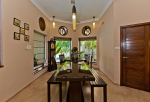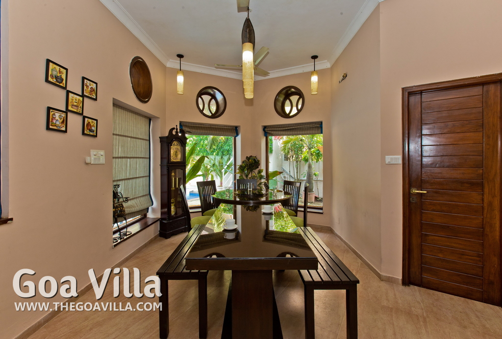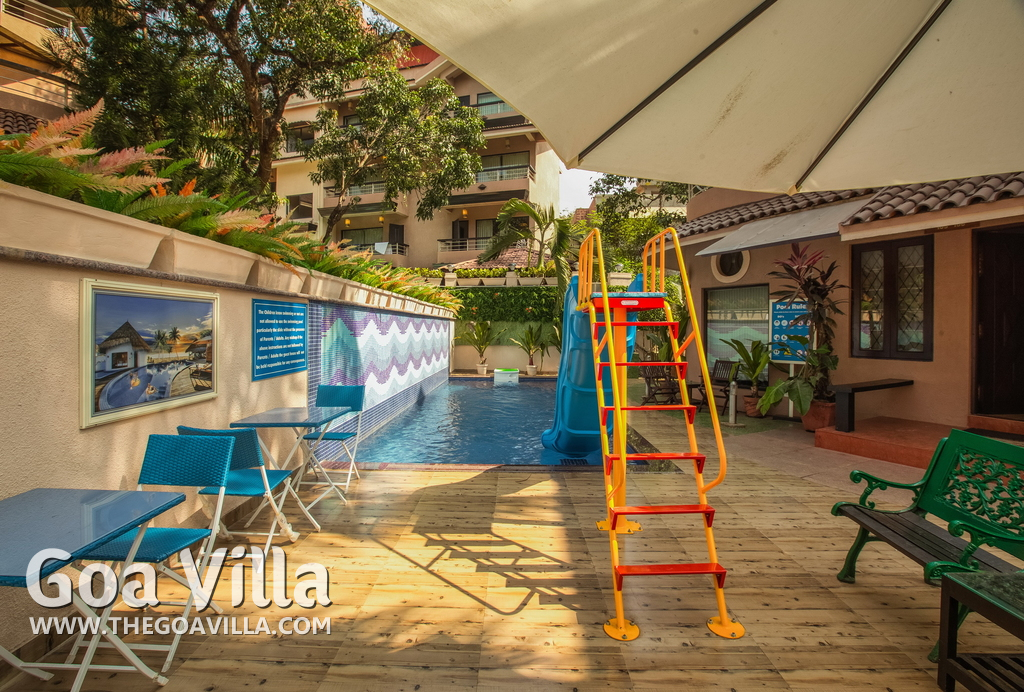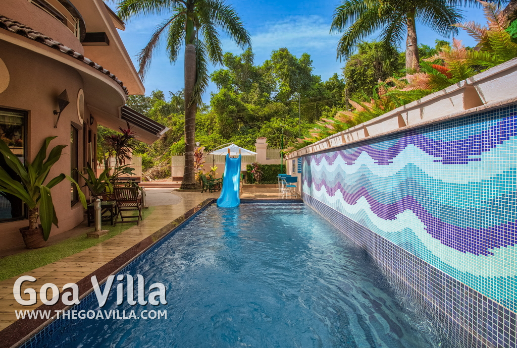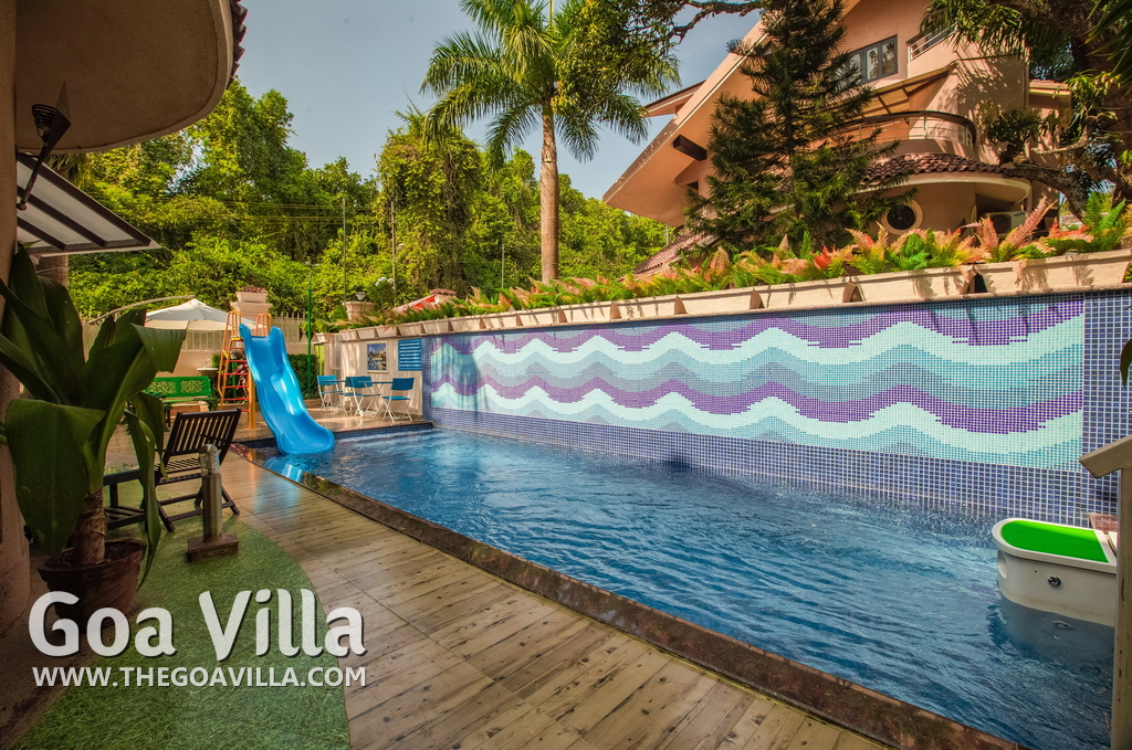 Swimming Pool – Stay in this villa and use its private swimming pool. The 32-feet pool has a shallow end with steps going into it gently. There is also a water slide that the kids will love. Garden benches with umbrellas are placed on the sundeck. There are a few tables as well where you can enjoy snacks or drinks after a splash in the pool. There is a lot of greenery in this part of the villa.