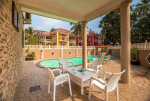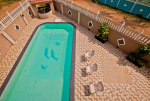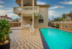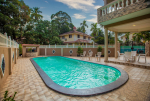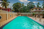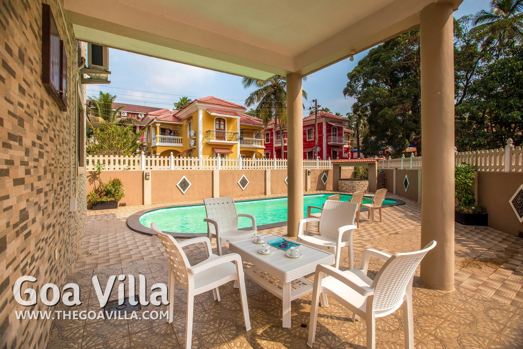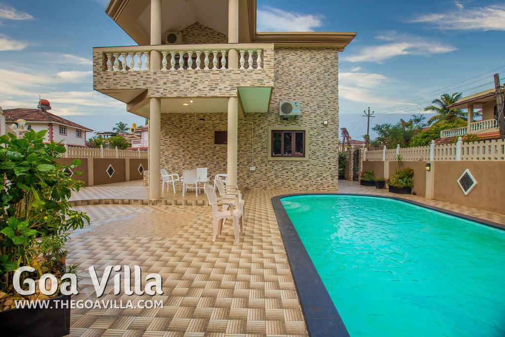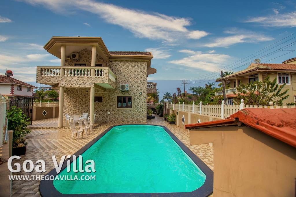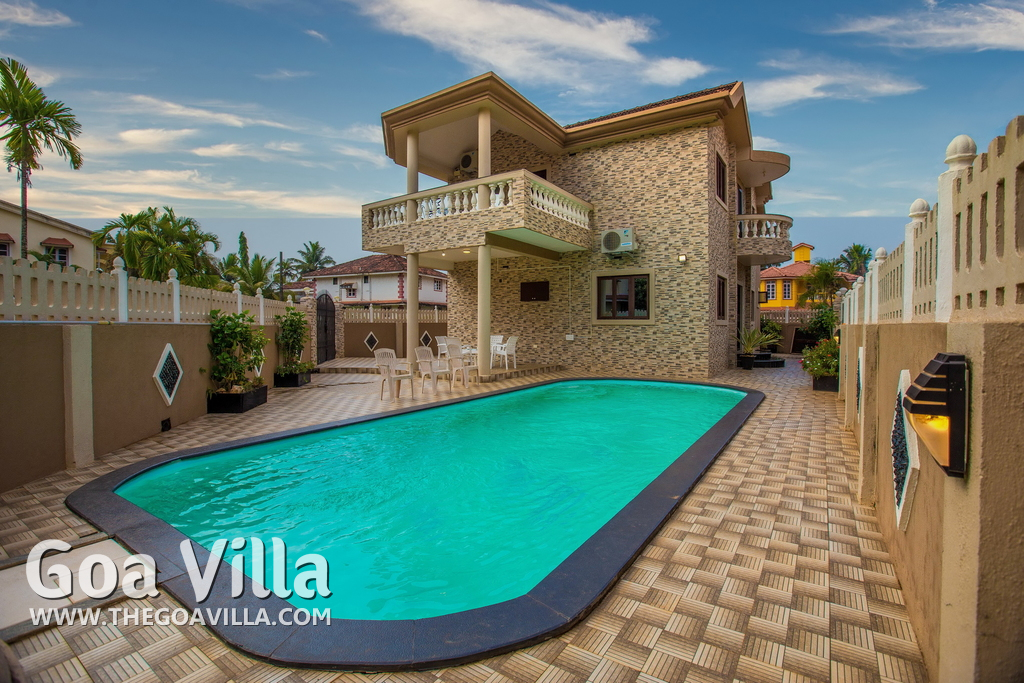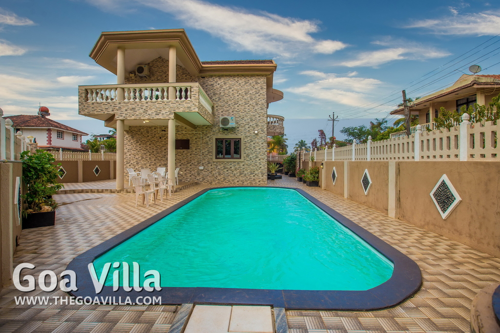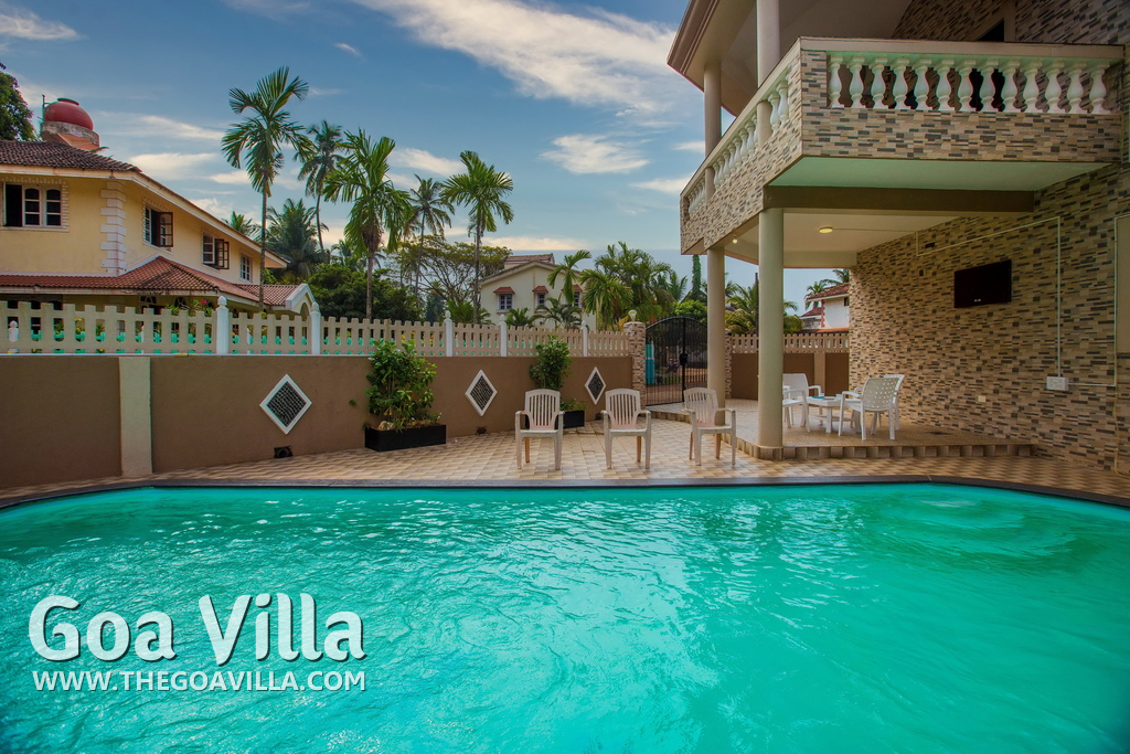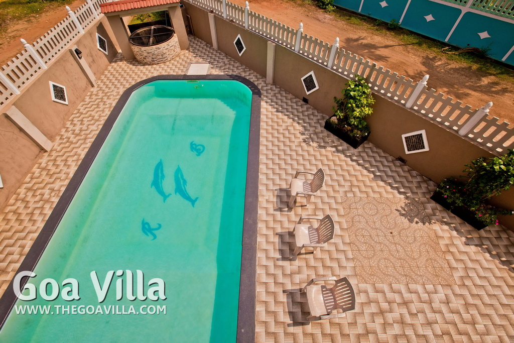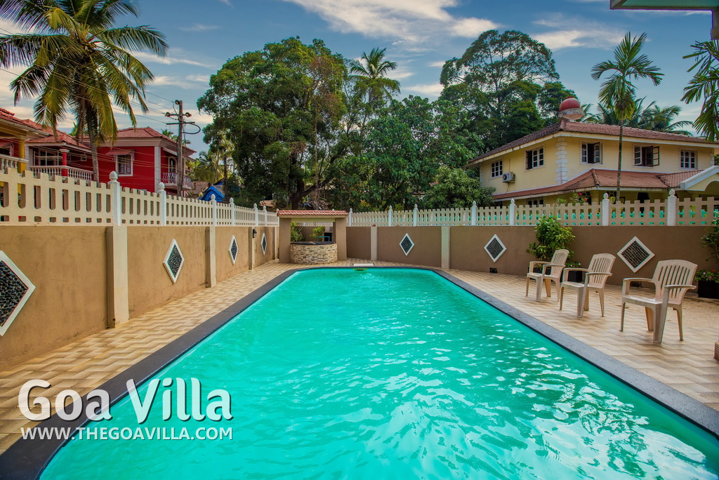 Swimming Pool — Betalbatim Villa has a large private swimming pool. It is on the right side as you enter the property. Potted plants and chairs are placed beside the pool.
