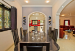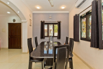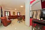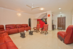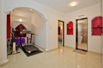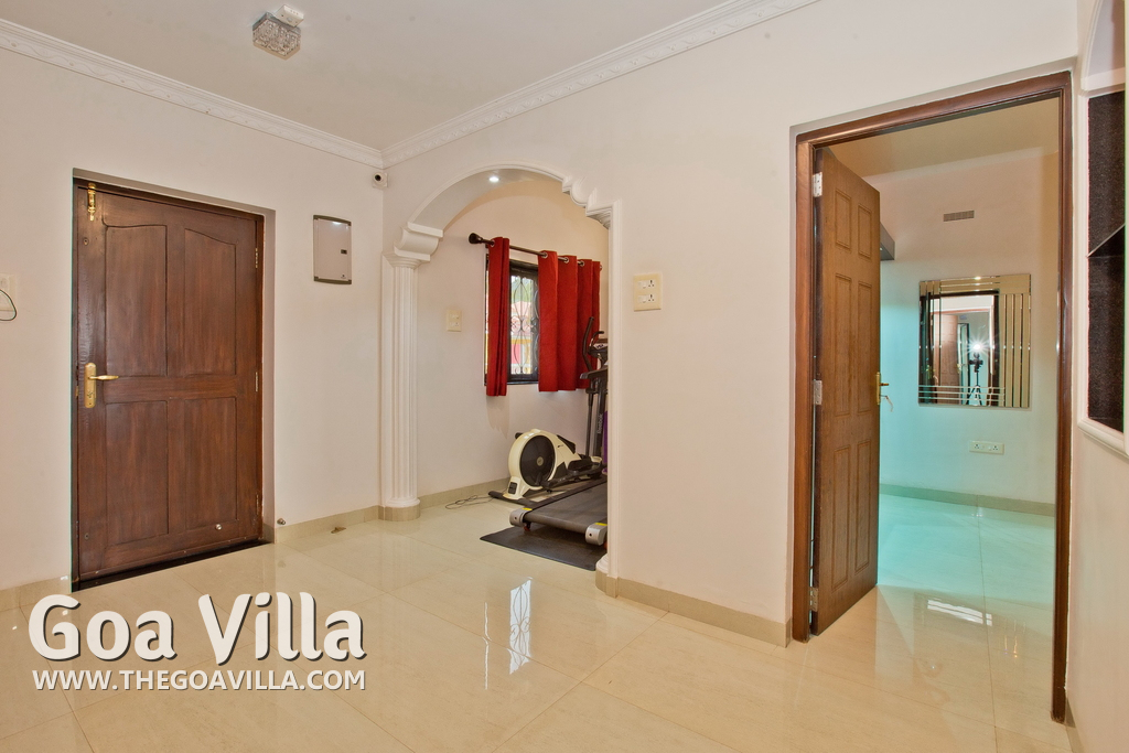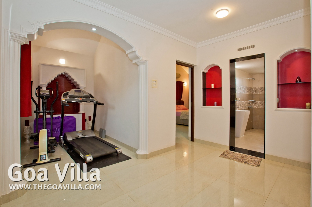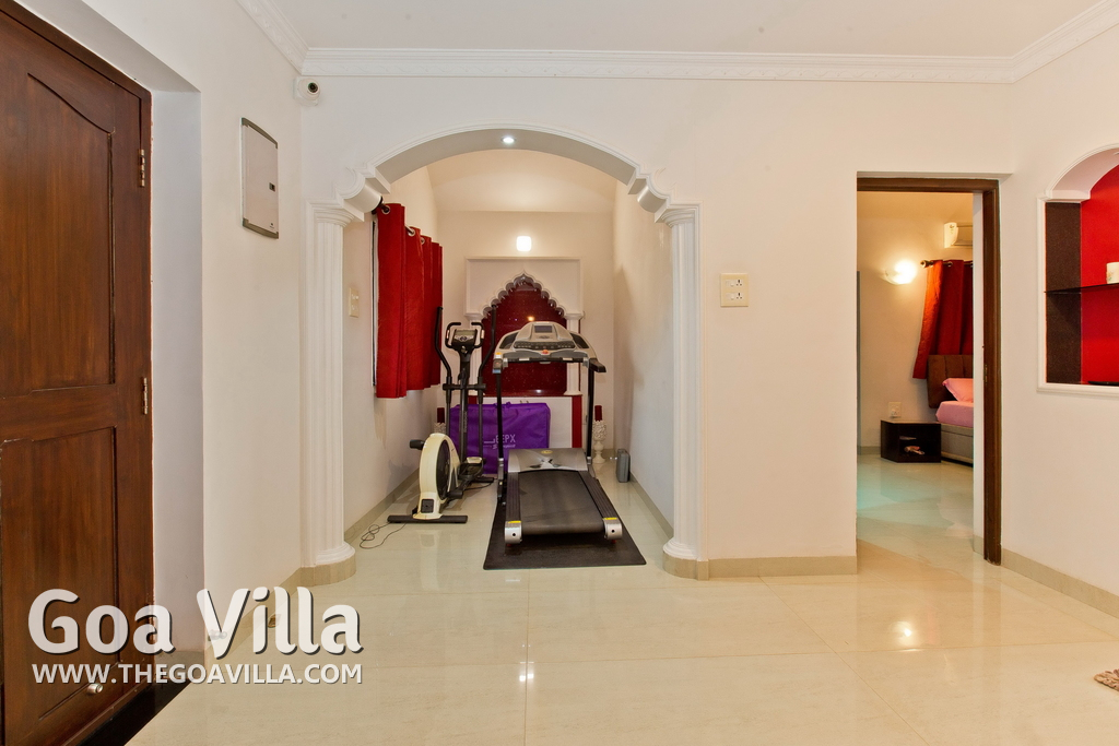 Living Room – The ground floor living room is huge and spacious. There is a luxury sofa, chairs, recliners, and a center table. There is a large satellite television. The living room is also air-conditioned. Staircase leads to the first floor from one side. You can also use the small gym in this villa. There is an elliptical and rowing machine.