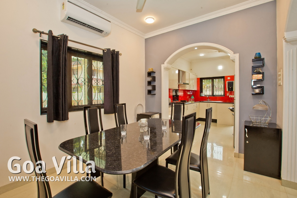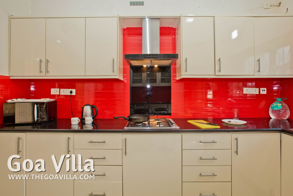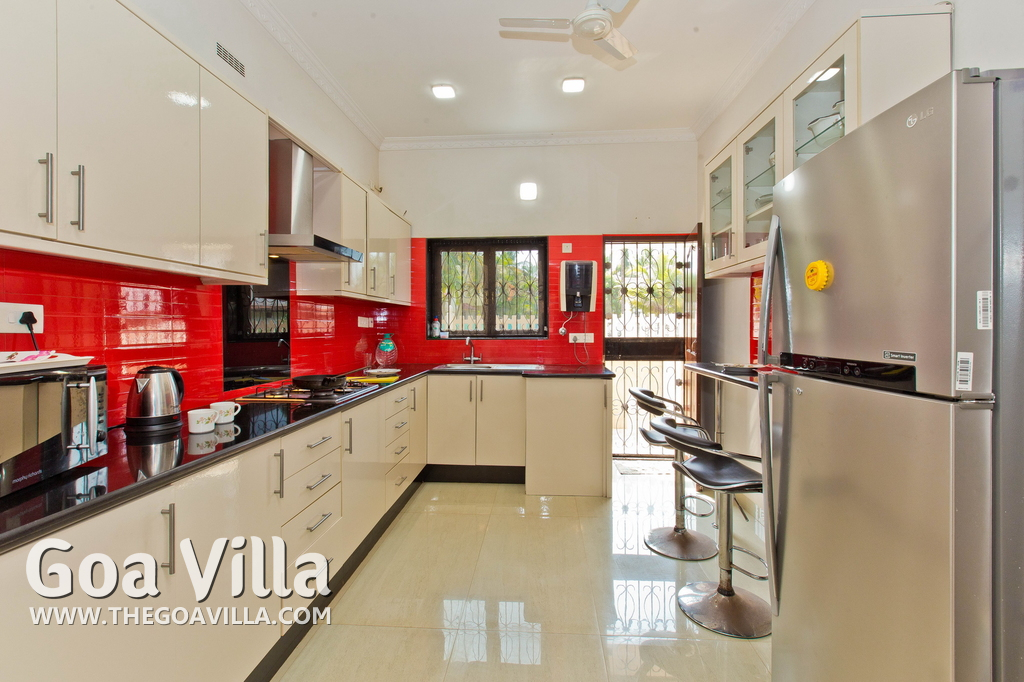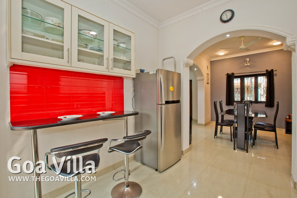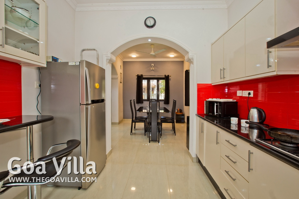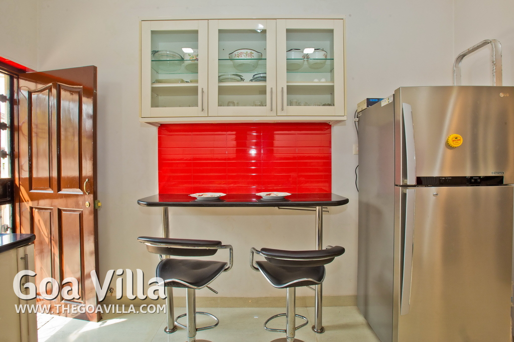 Kitchen, Dining – The dining area is at one side of the living room. A glass-top table with sitting for 6 guests. There is a mini fridge next to the table. The villa’s fully equipped kitchen is next door. It has a large double-door refrigerator, cooking station, chimney, water purifier, microwave, and kettle. There is a small table space in the kitchen where you can have a quick bite.