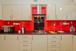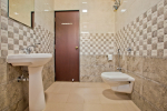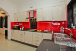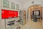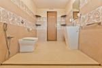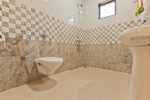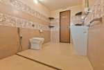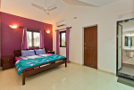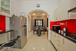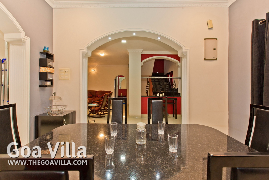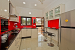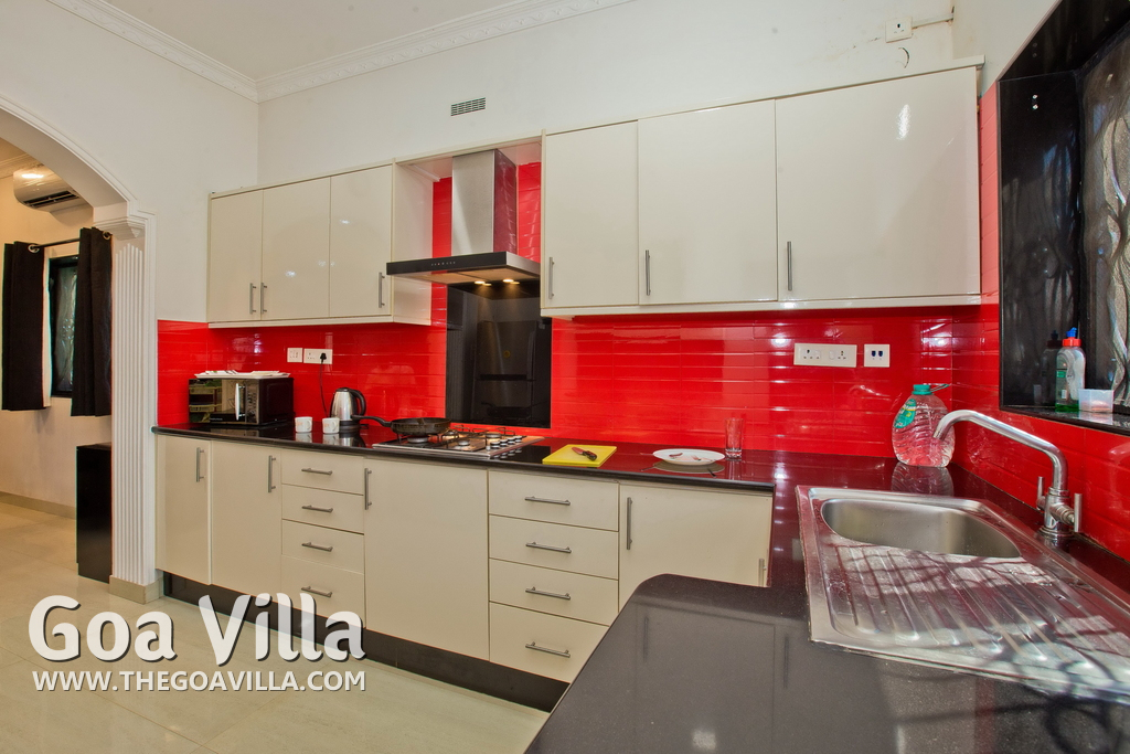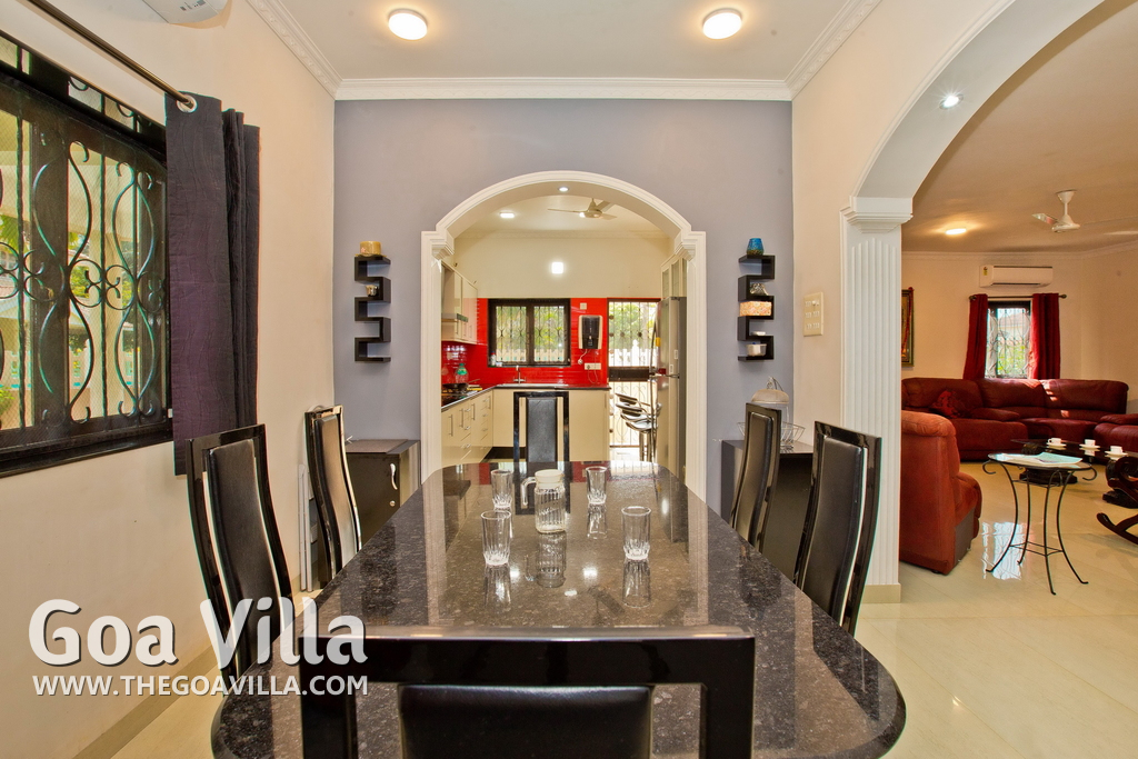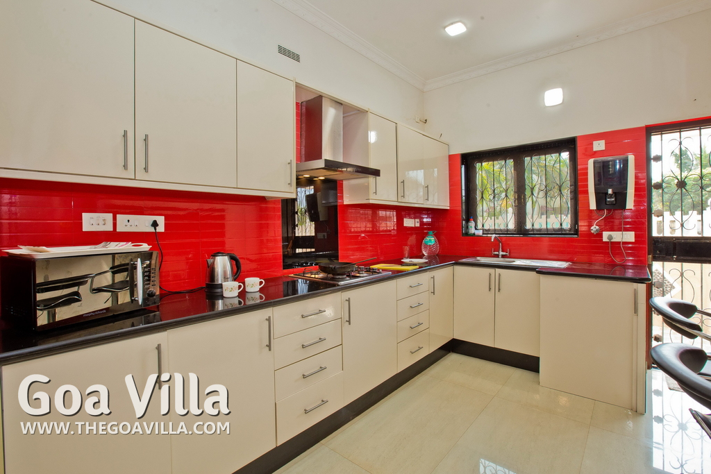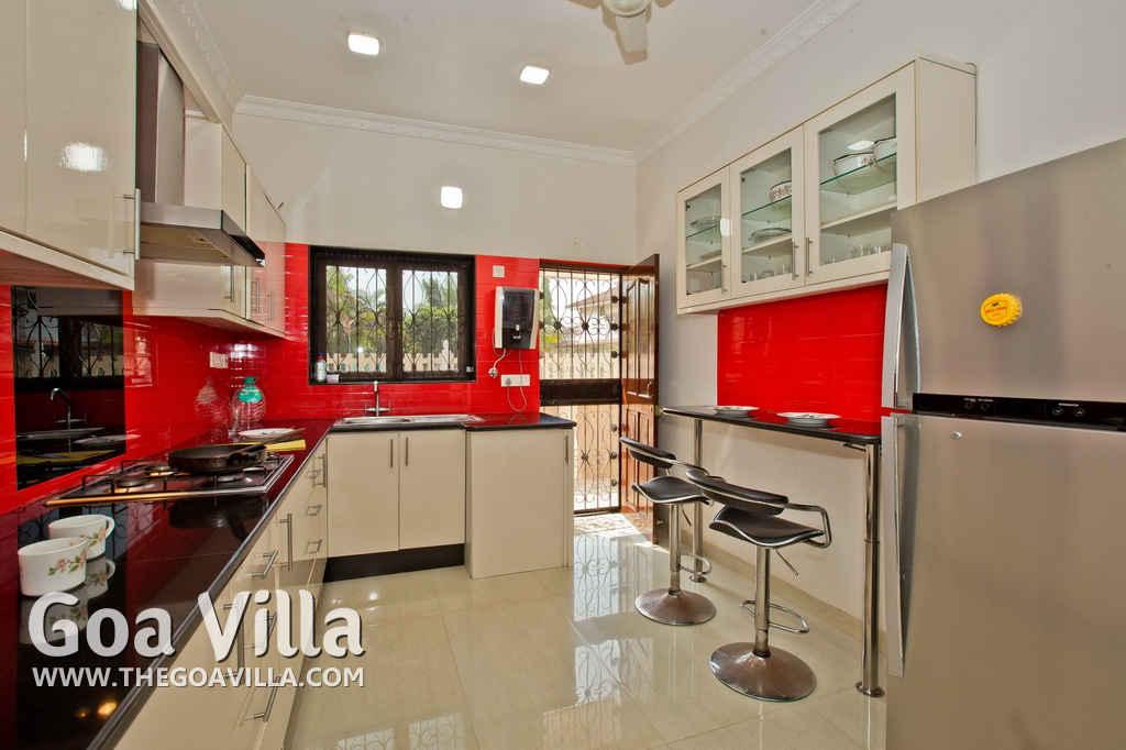 Kitchen, Dining – The dining area is at one side of the living room. A glass-top table with sitting for 6 guests. There is a mini fridge next to the table. The villa’s fully equipped kitchen is next door. It has a large double-door refrigerator, cooking station, chimney, water purifier, microwave, and kettle. There is a small table space in the kitchen where you can have a quick bite.