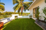 Nice deck with sitting arrangements by large L-shape infinity pool overlooking paddy field.