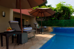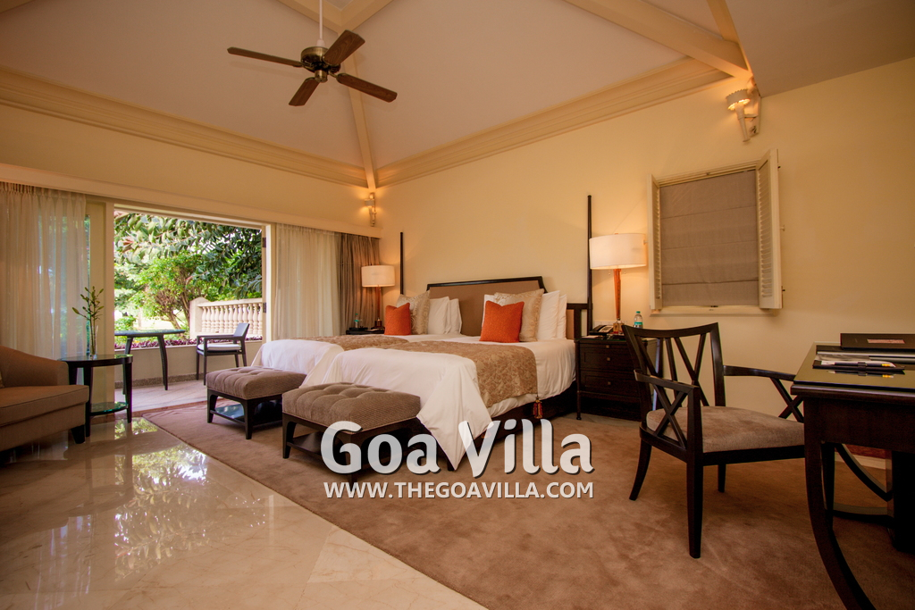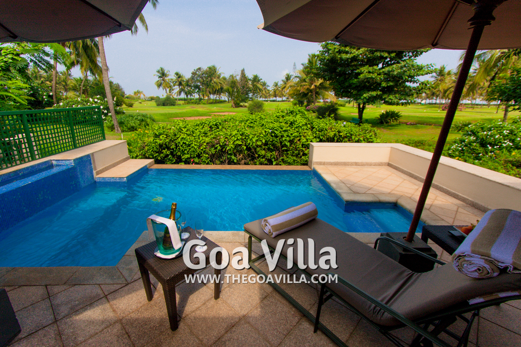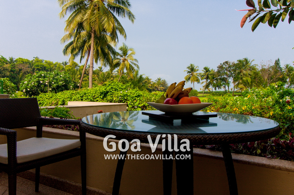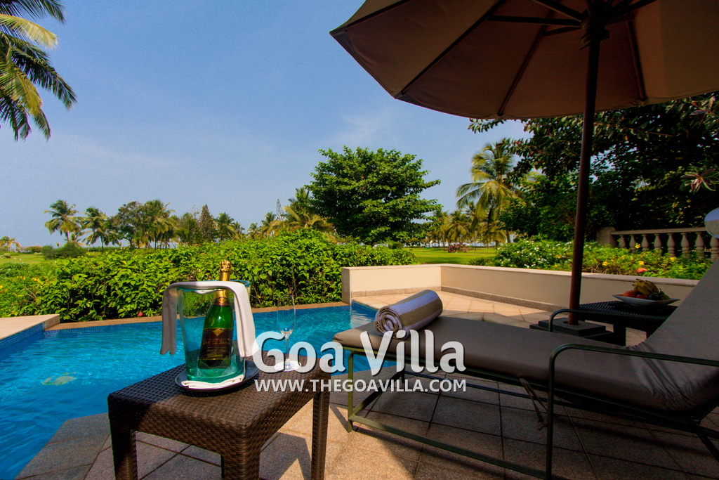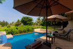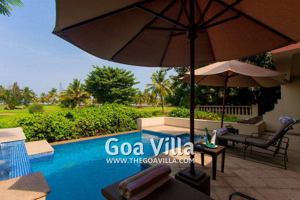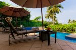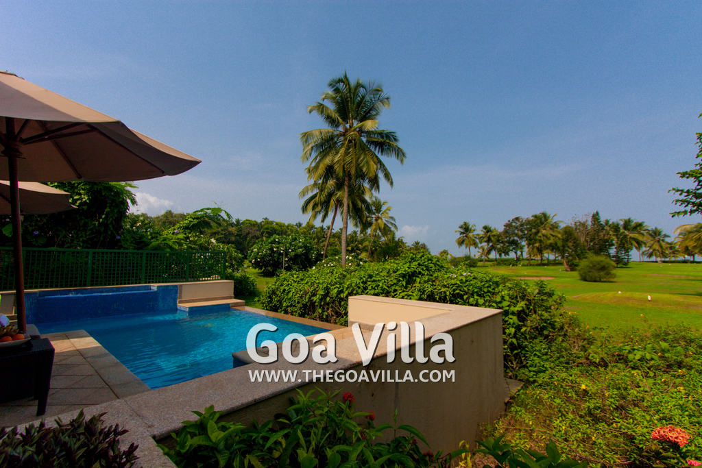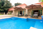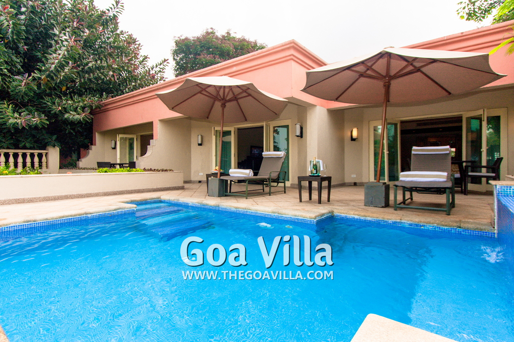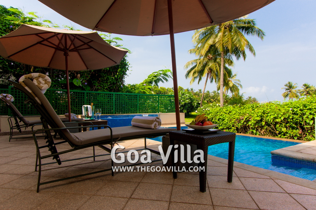 Swimming Pool – This plush holiday home in Goa has a private swimming pool overlooking the landscaped garden and trees. There are sun loungers and umbrellas where guests can relax. The living room and 2 bedrooms all open to the swimming pool.