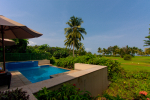 Cinema Villa is an elegant 2-bedroom property at Cavelossim in South Goa. This luxury goa villa has single storied construction, modern interiors, huge bathrooms with modern faucets, big luxurious living room, and a private swimming pool. It opens to the vast green field. There are recliners beside the pool where guests can relax or have a drink and snacks. Both the bedrooms are en-suite and have air-conditioning.