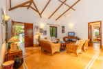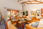Living Room – Comfortable living room with traditional cane furniture, glass-top center table, carpet, television, entertainment console with stereo system, and DVD player. There are also paintings, and artifacts. It opens to a wrap around balcony.