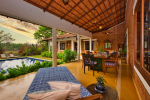 Kitchen, Dining – Family Villa has a fully equipped kitchen with a large refrigerator, water purifier, crockery, cutlery, toaster, microwave, and cooking station. The dining area is outside in the balcony overlooking the fields and swimming pool. Table with seating for 8 guests.