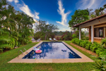 Swimming Pool – The private swimming pool is one of the highlights of the villa. There is a beautiful landscaped garden around the pool with sun loungers on one side and the balcony with dining on the other. There is also a separate sitting arrangement for guests to relax. Fields and tall trees all around.