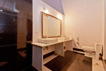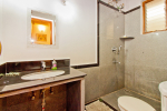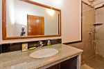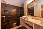 Bathrooms – Modern bathroom with shower area, sink, toiletries, towel rack, hot water, soap stand, mat, and large mirror.