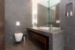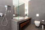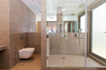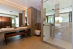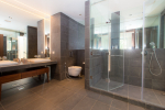 Bathrooms – Big modern bathrooms with single or double sinks, shower cubicle, towel rack, hand shower, and toiletries.