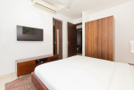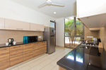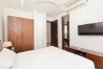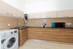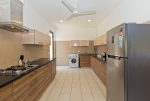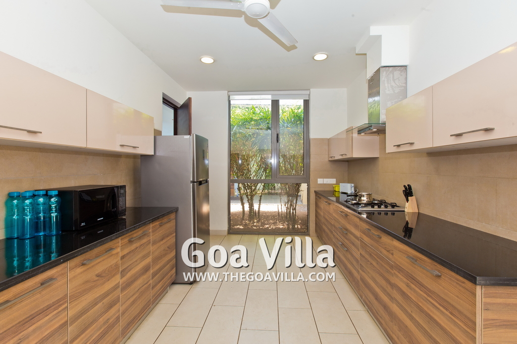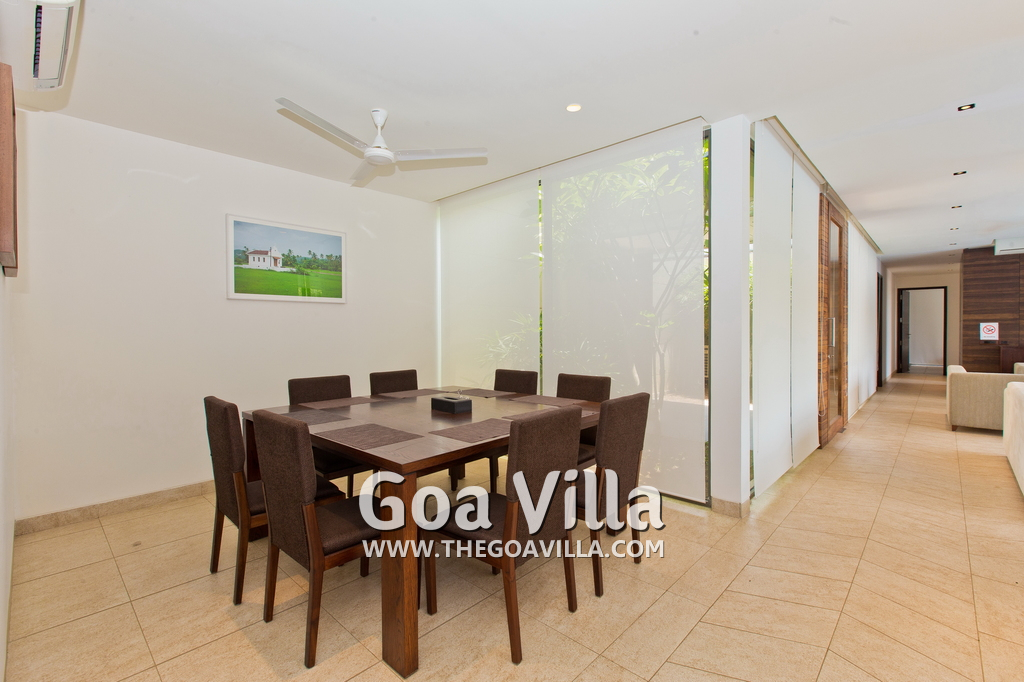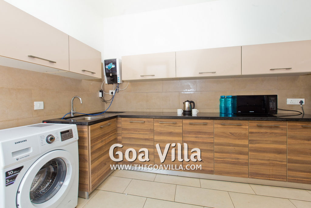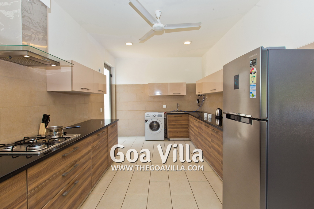 Kitchen, Dining – The kitchen is fully-equipped with a big refrigerator, cooking station, tea/coffee maker, water purifier, microwave, chimney, and a washing machine. Utensils are provided. The dining area has sitting for 8 guests. False roofing.