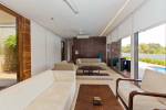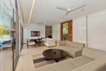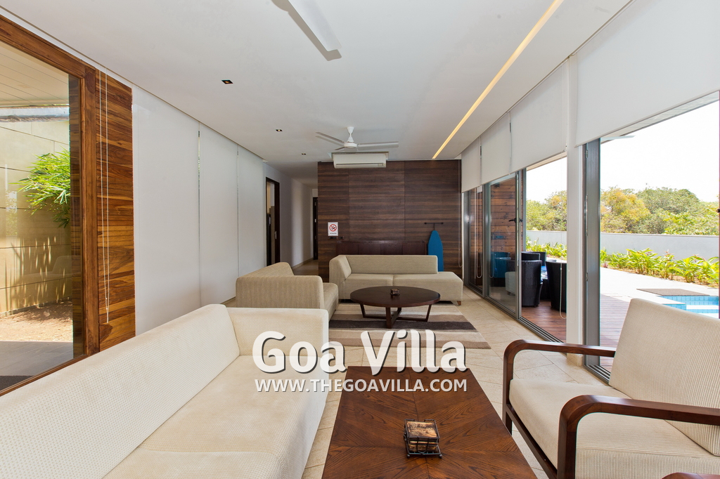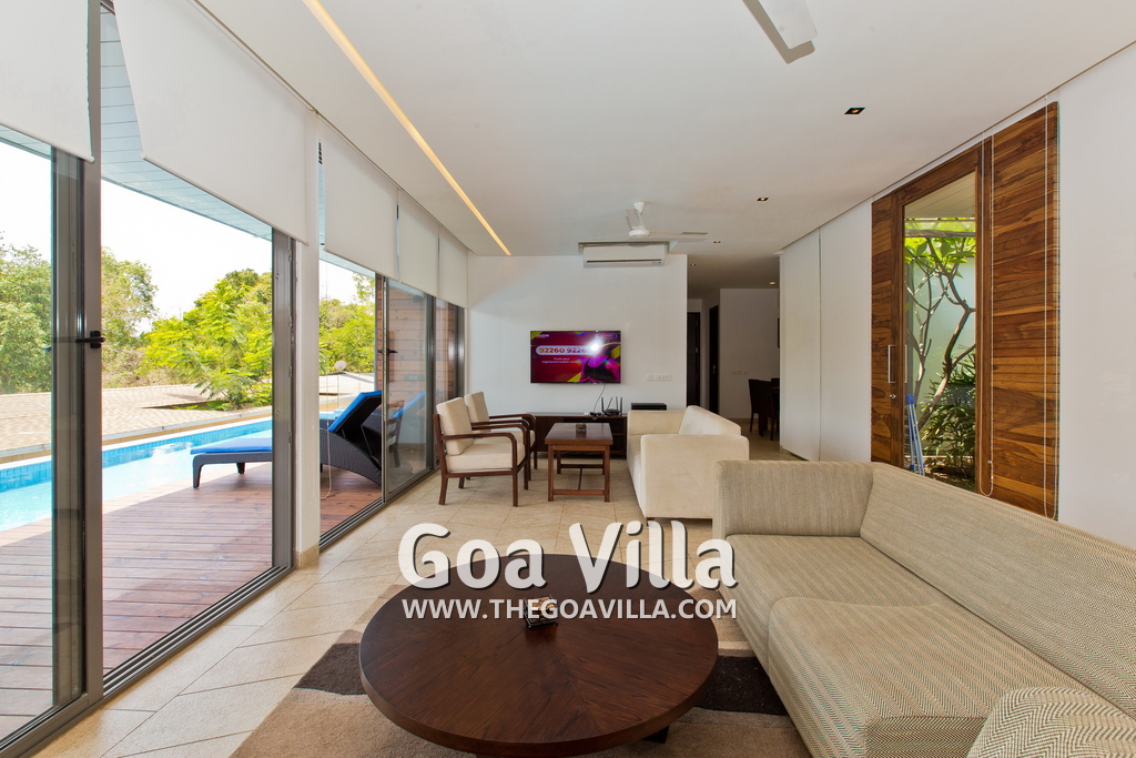 Living Area – It overlooks the swimming pool with a large French door leading outside. Comfortable sofa with center table, and carpet. It is air-conditioned.
