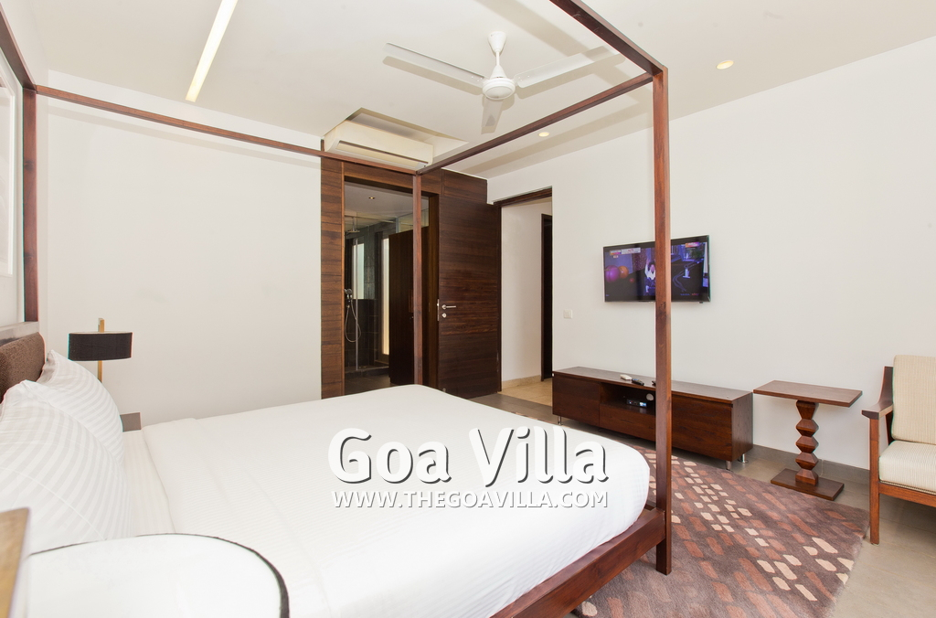 Bedrooms – En-suite and air-conditioned 4 bedrooms. They are all on the ground floor as Kingfisher is a single storied villa. Large doors open to the private swimming pool. Plush interiors with Queen beds, large pillows, lamp shade, side table, paintings, wardrobe, flat-screen television, and carpet. There is also a sitting area.