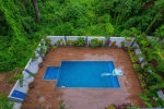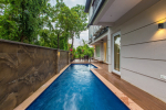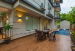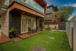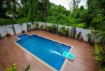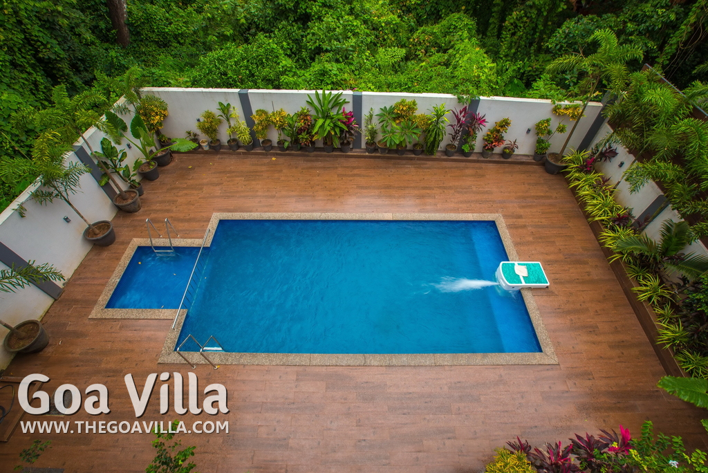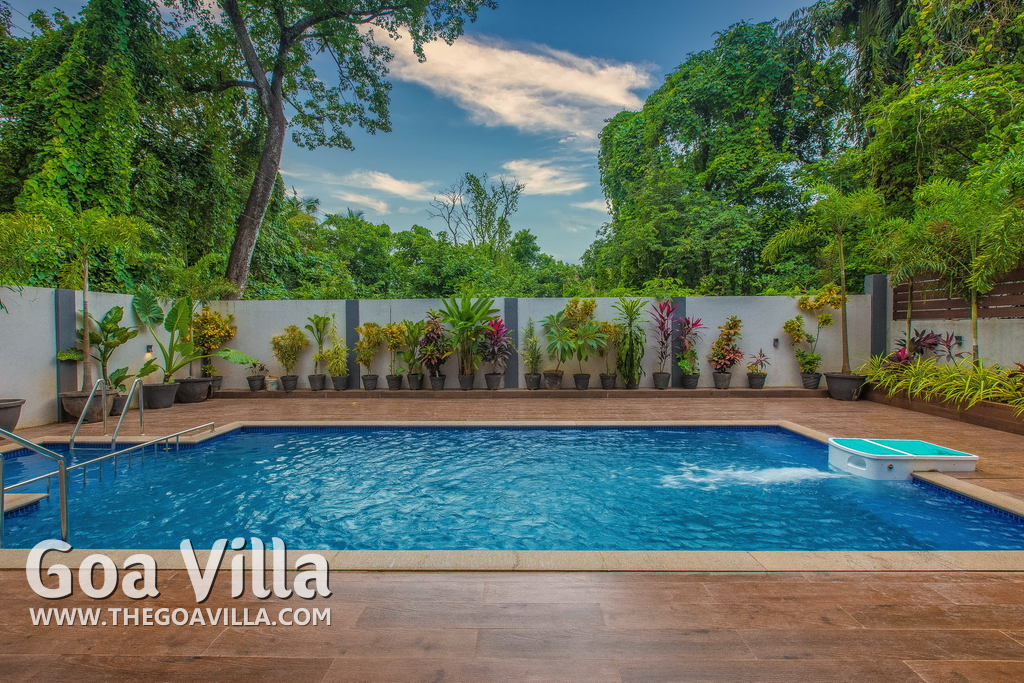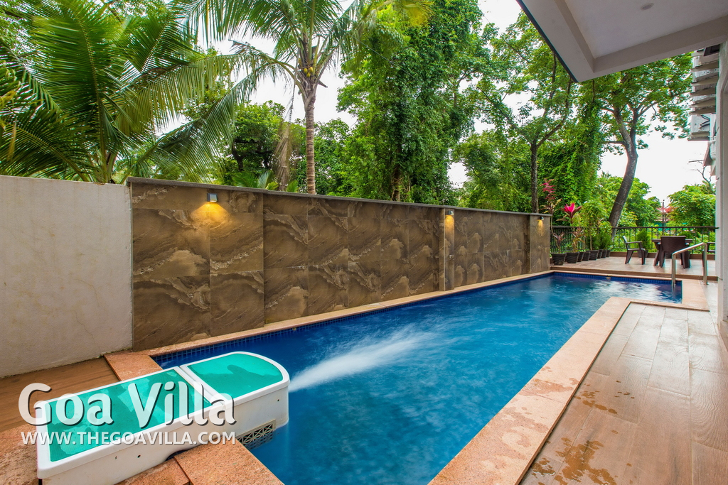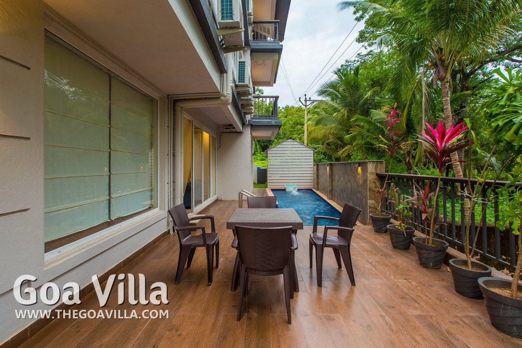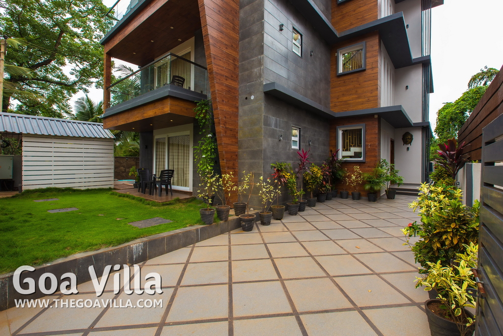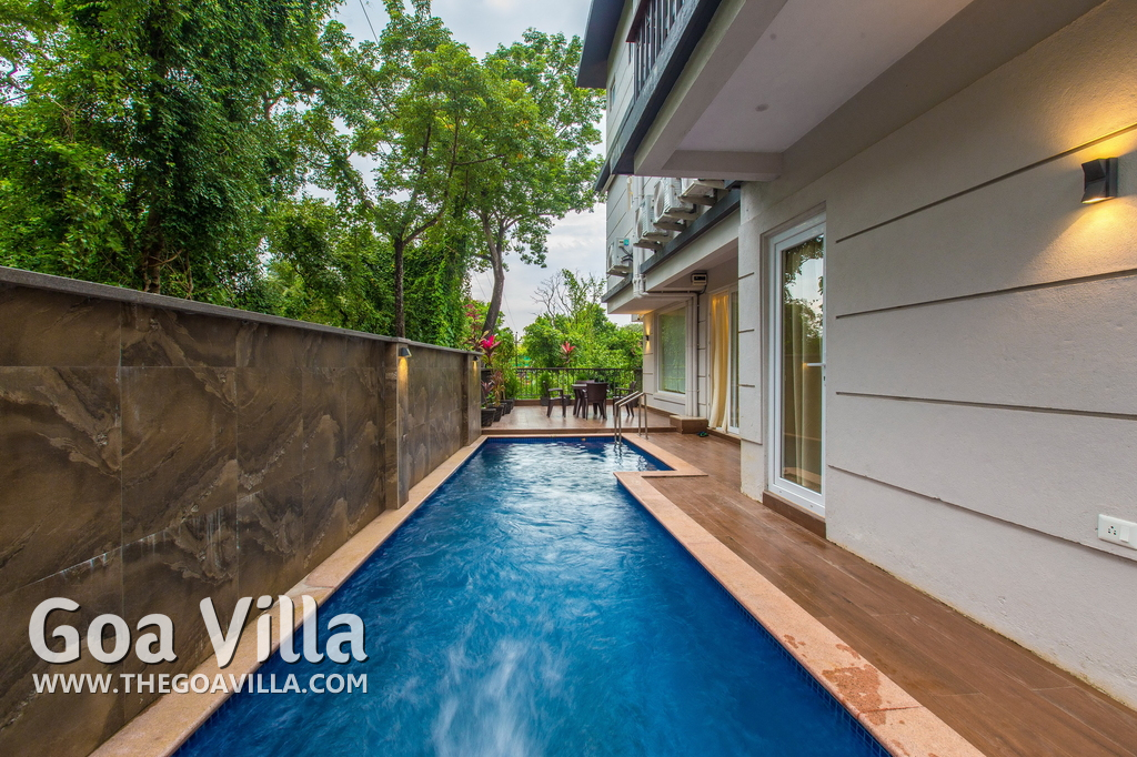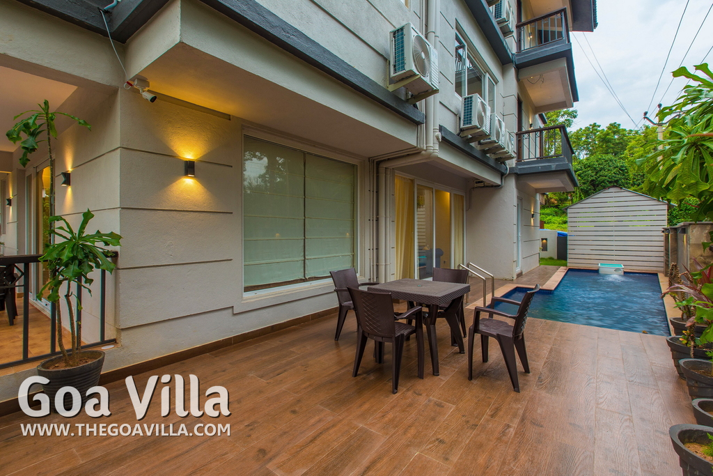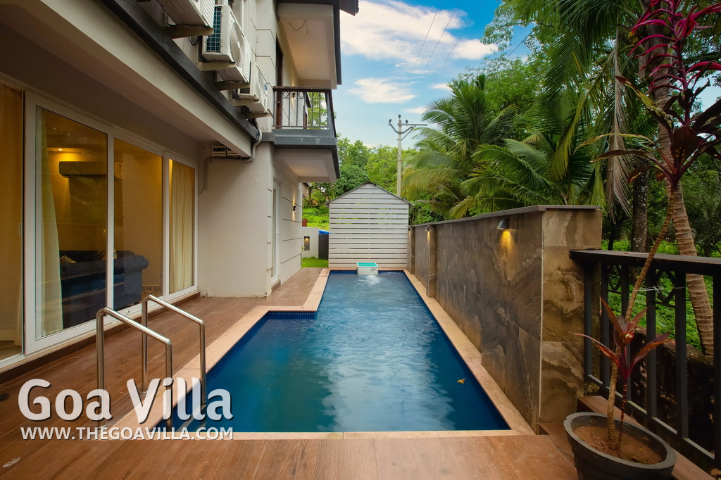 Swimming Pool – As you enter the villa, you will find a beautiful manicured lawn on the left side. The private swimming pool is just behind this. It has a shallow end where the kids can splash around safely while the adults enjoy their time. Potted plants and tall trees surround this area.