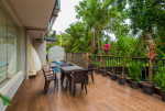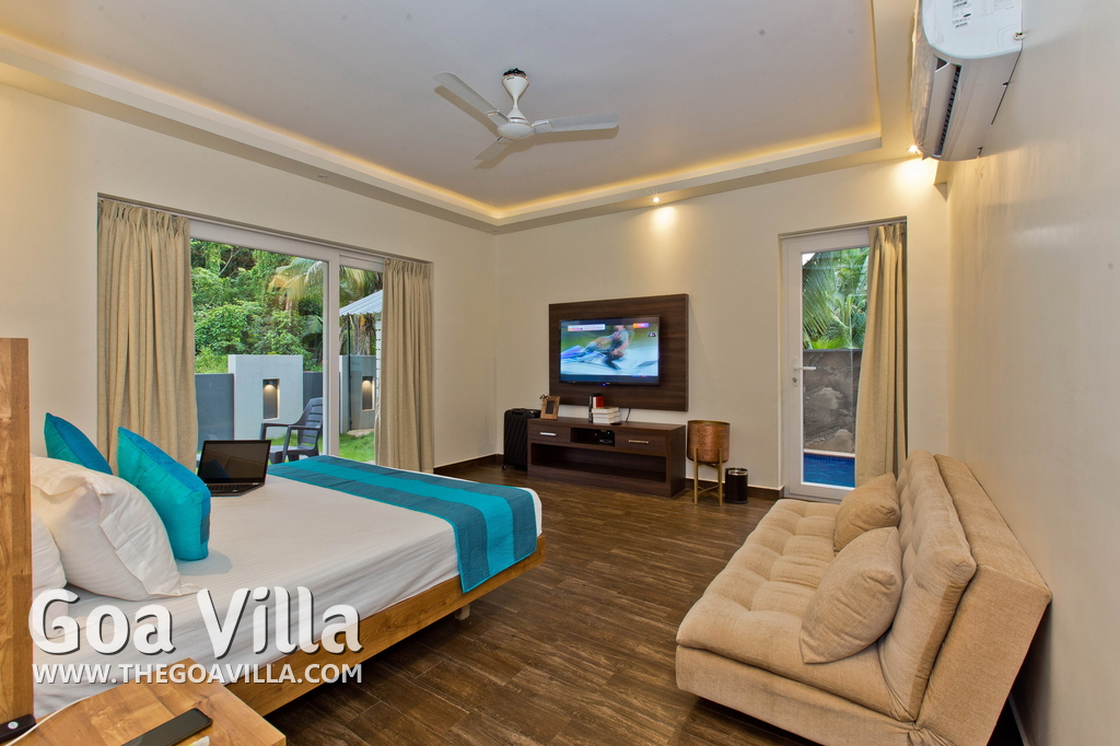 Bedrooms – The villa has 4 bedrooms, all en-suite and air-conditioned. The ground floor and top floor have 1 bedroom each, while the 2 others are located on the second floor. They all have private balconies with a sitting area. Large glass ceiling to floor doors open to the outdoors. Keep it closed for air-conditioning or open to enjoy the outdoors. The ground floor bedroom opens to the manicured lawn. The bedrooms have queen beds, side tables, wardrobe, deep-cushioned sofa, and a large flat-screen television. Hardwood flooring.