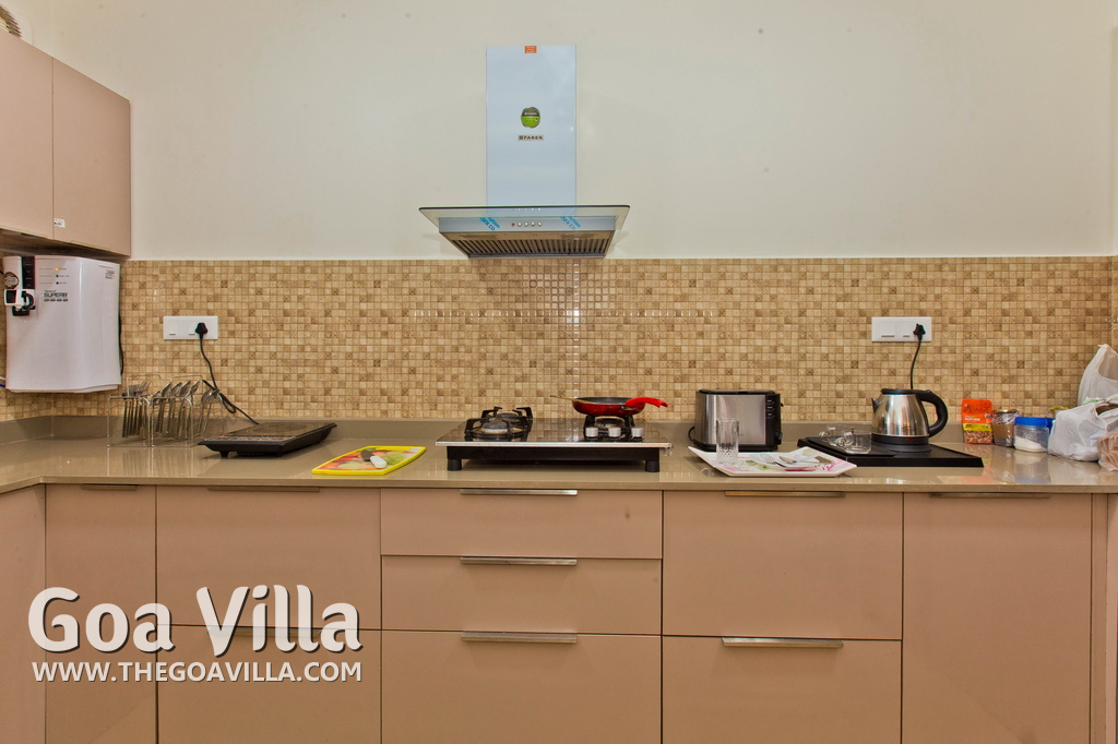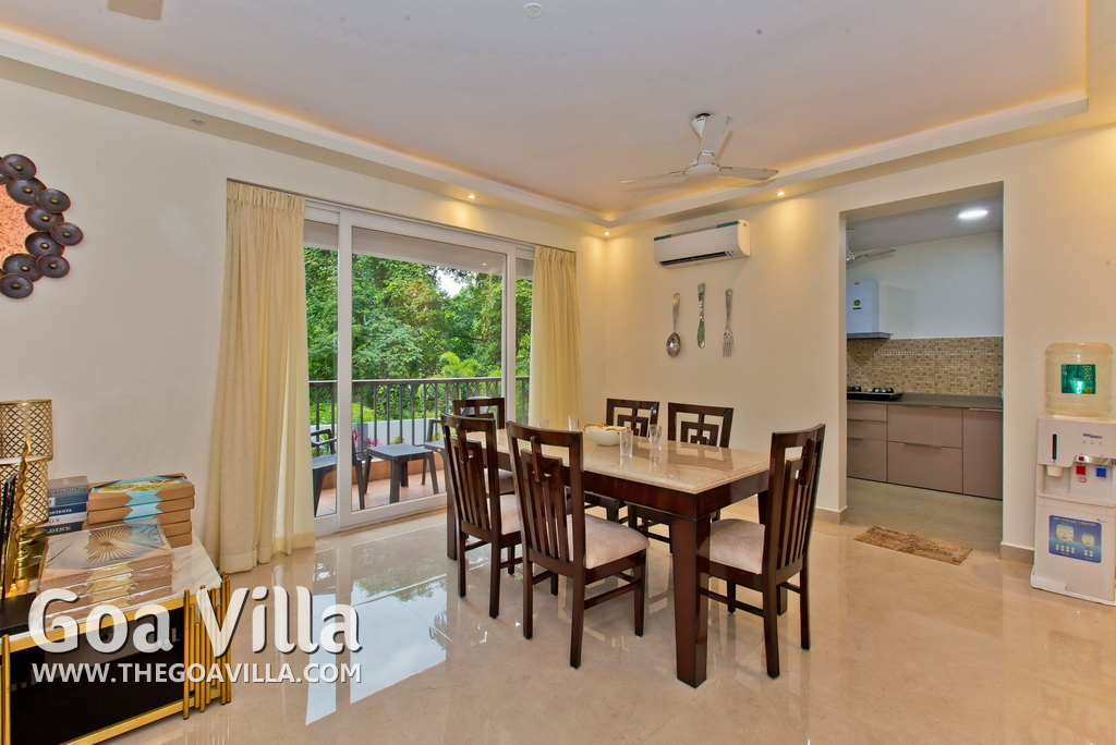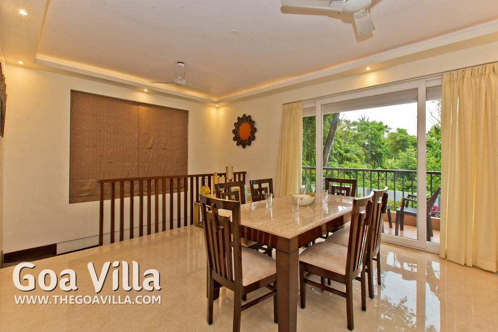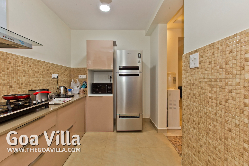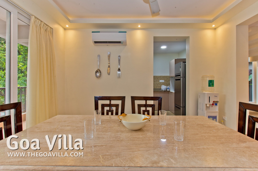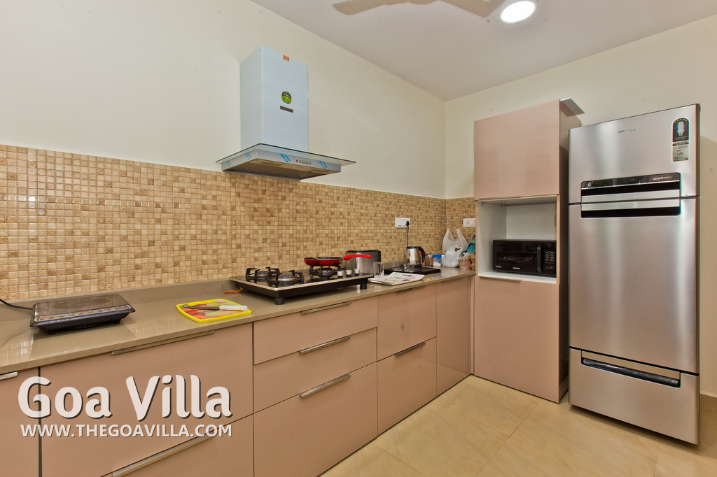 Kitchen, Dining – This North Goa rental property has a well-equipped kitchen where you can cook a meal or you can ask for cooking maid service. There is an oven, chimney, coffee maker, toaster, water purifier, microwave, induction cooker, and a large refrigerator. Utensils, tableware, and glassware are provided. The dining area is between the kitchen and living room. Table with sitting for 6 guests. Outside snack area on the sundeck beside the swimming pool.