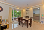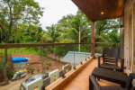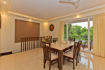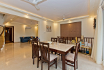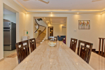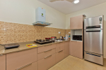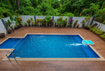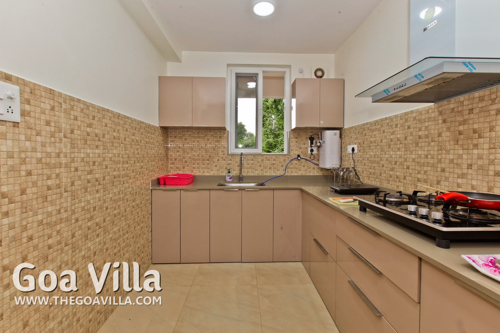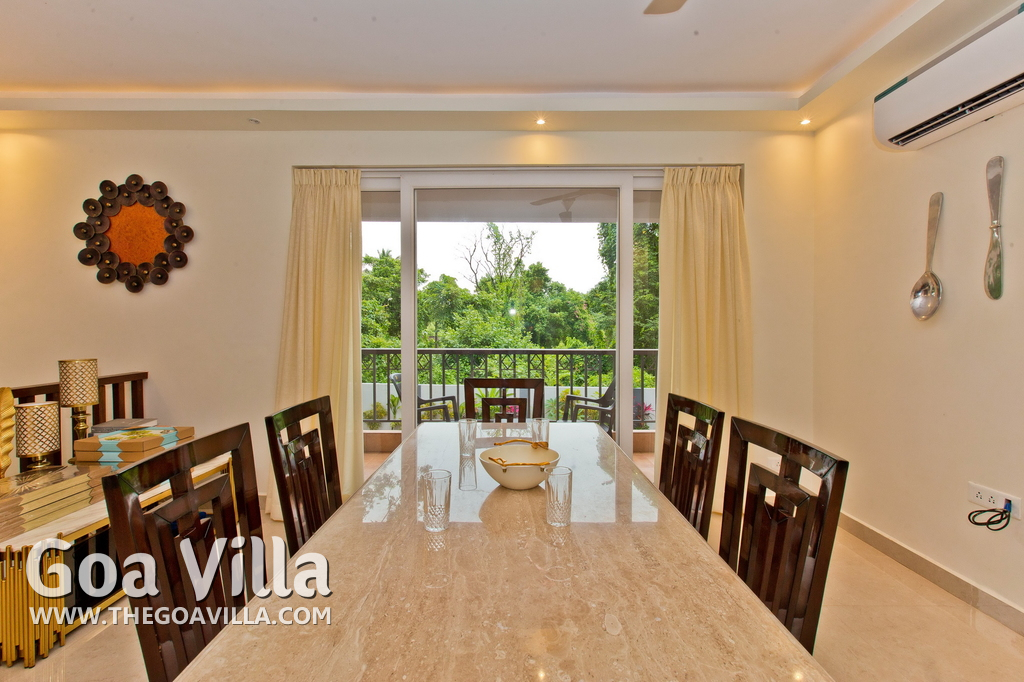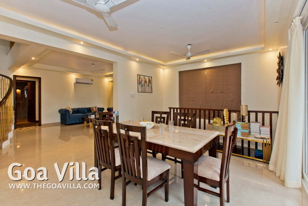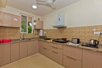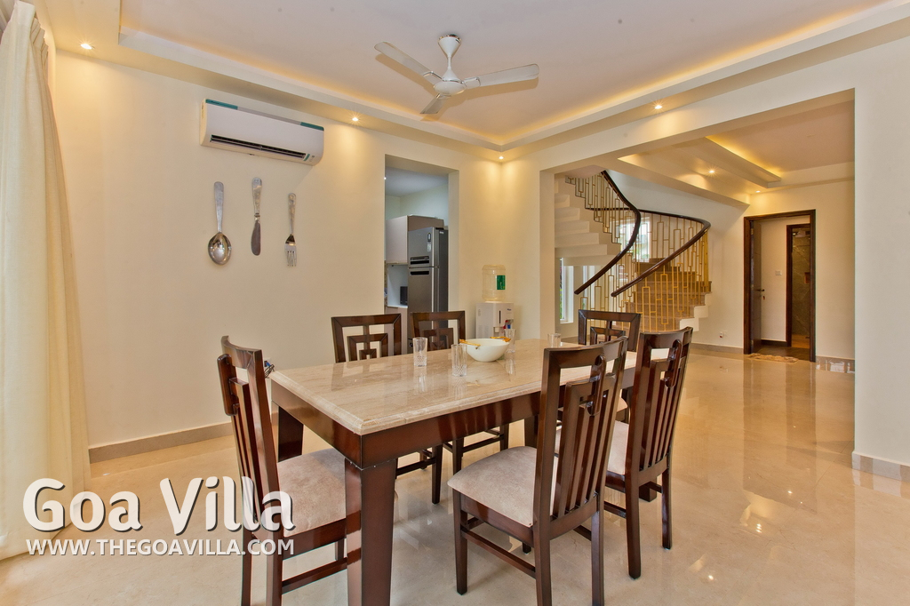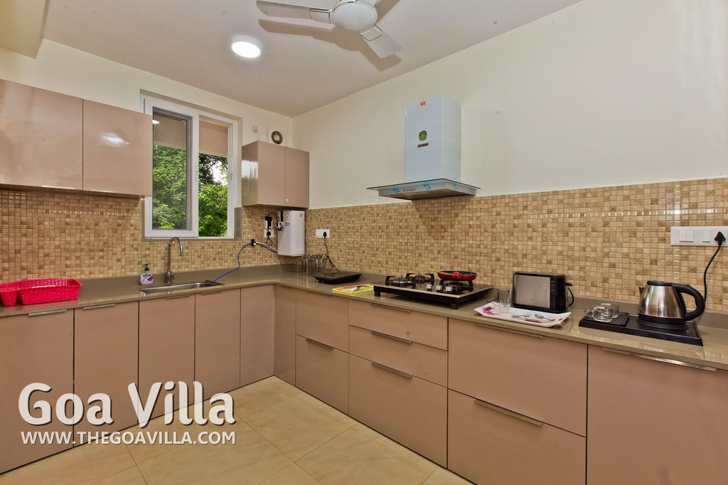 Kitchen, Dining – This North Goa rental property has a well-equipped kitchen where you can cook a meal or you can ask for cooking maid service. There is an oven, chimney, coffee maker, toaster, water purifier, microwave, induction cooker, and a large refrigerator. Utensils, tableware, and glassware are provided. The dining area is between the kitchen and living room. Table with sitting for 6 guests. Outside snack area on the sundeck beside the swimming pool.