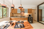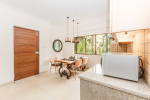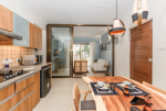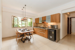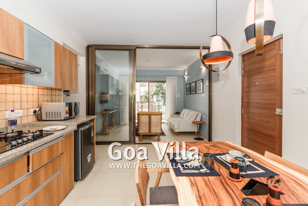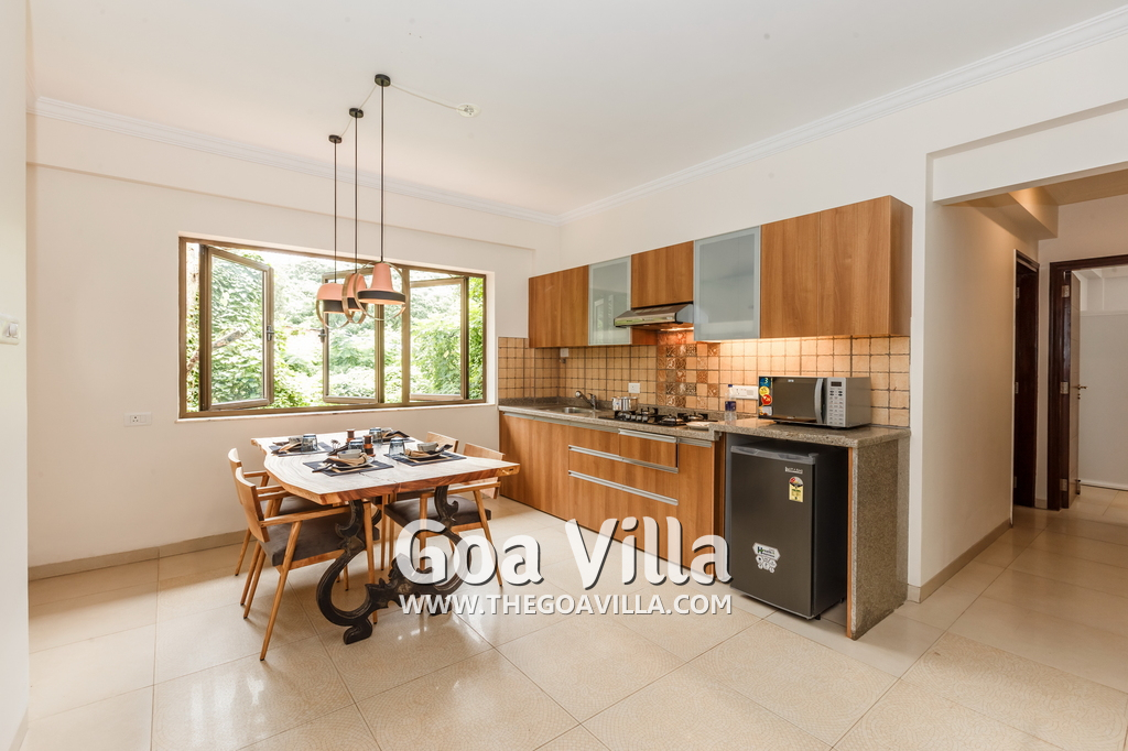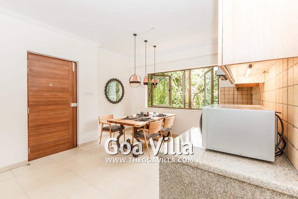 Kitchen, Dining – The apartment has a fully-equipped modular kitchen with a microwave, small refrigerator, small chimney, sink, and a cooking station. All utensils are provided. The dining area is at one side of the kitchen with seating for 4 people.