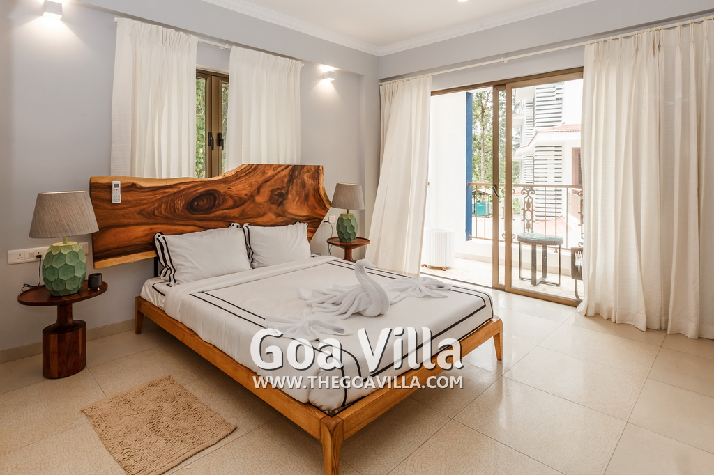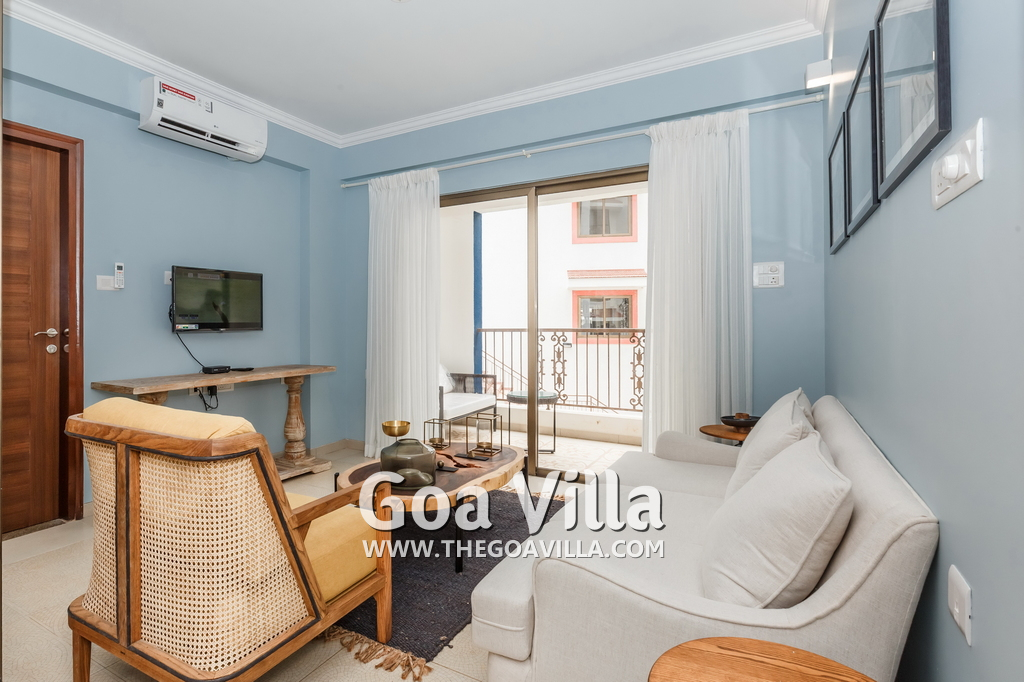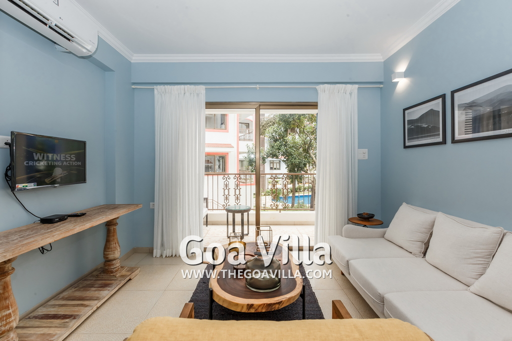 Living Room – Large living room with sofa, center table, rug, a flat-screen wall-mounted television with Tata Sky satellite channels, and paintings. The living room is also air-conditioned. It opens to a balcony with seating where you can relax and get swimming pool views. Aesthetic, soft furnishing.