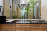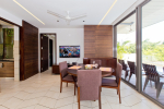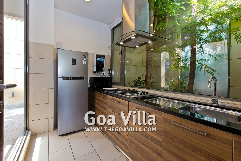 Kitchen, Dining – The dining area is at one side of the living room. There is a round table with sitting for 4 guests. Mayuri Villa has a fully equipped kitchen with a large refrigerator, gas stove, microwave, sink, chimney, and water purifier. All utensils and tableware is provided.
