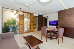 Small is beautiful! Stay in a small and cozy 2-bedroom holiday home for rent at Arpora in North Goa. Mayuri Villa is a modern property with a huge garden, tall trees, outdoor sitting areas, private swimming pool, living room, and a fully equipped kitchen. Fully furnished, the interiors are modern too. Both the bedrooms are en-suite and air-conditioned. Guests will find all comforts and amenities. 24/7 security provides privacy. The villa has free internet, power back up, chef service, and housekeeping.
