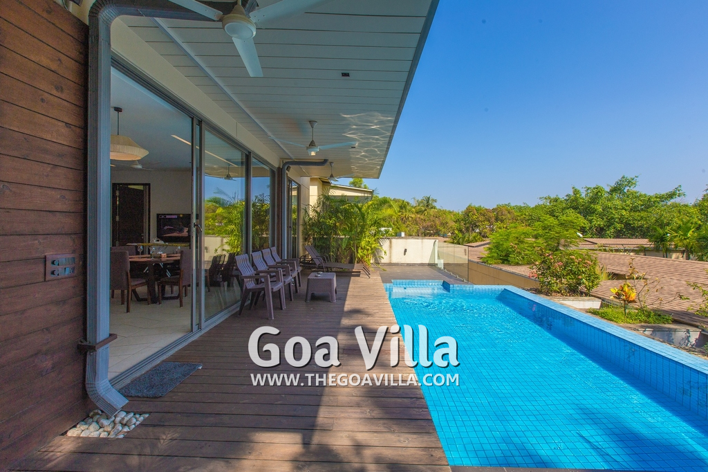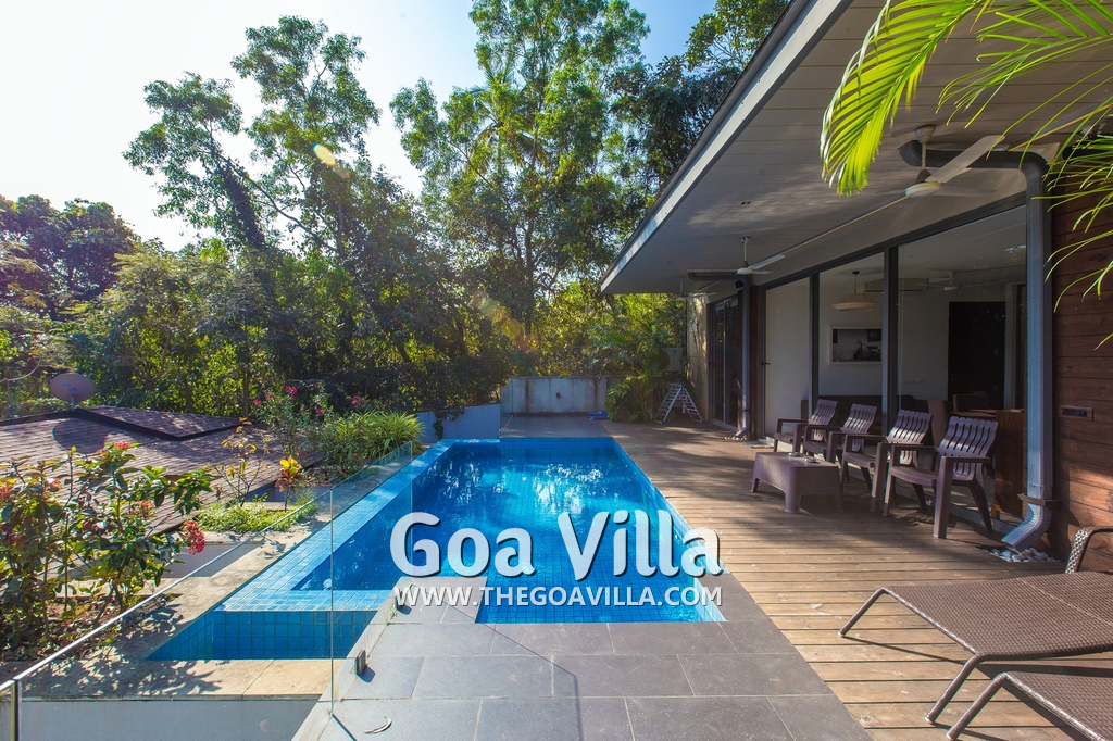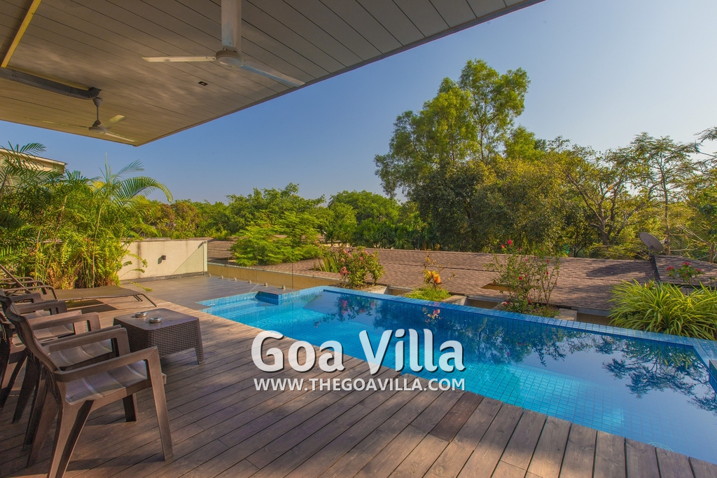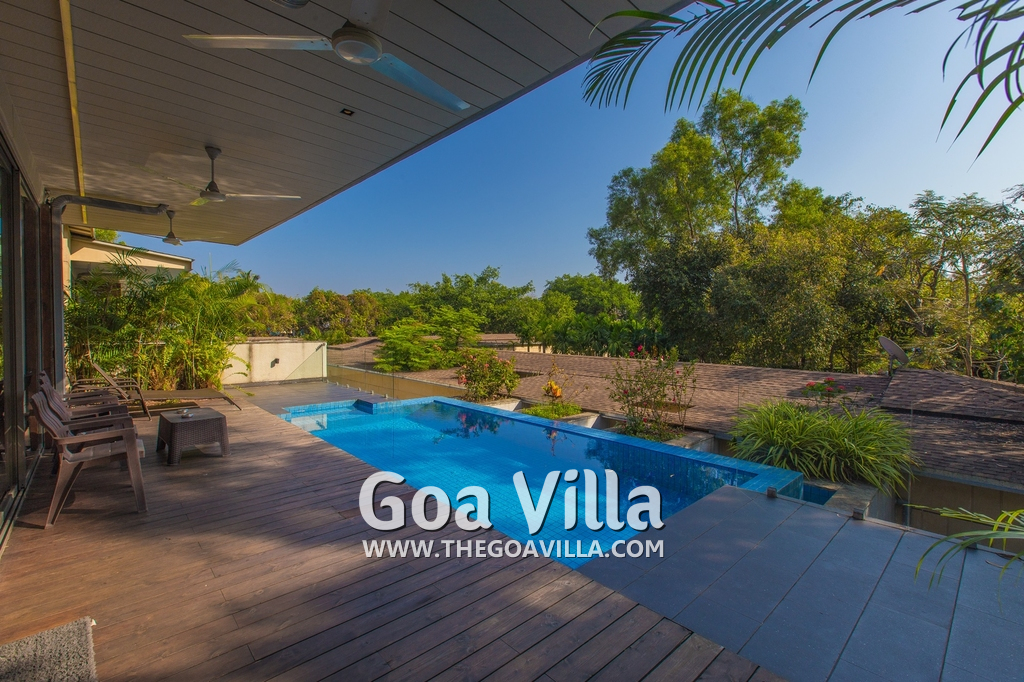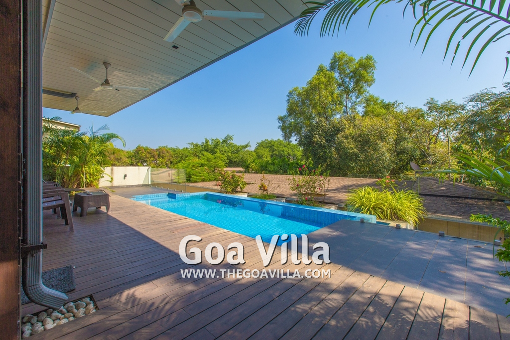 Swimming Pool – This holiday villa for rent has a beautiful private swimming pool overlooking the small Parra Hills. The pool has a shallow end for the kids. There is lush greenery all around. Chairs and table on the pool deck where you can relax after taking a dip and can even have some snacks. There are sun beds too.
