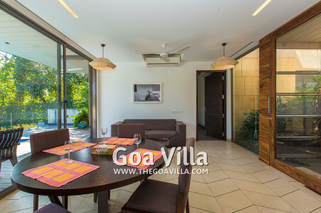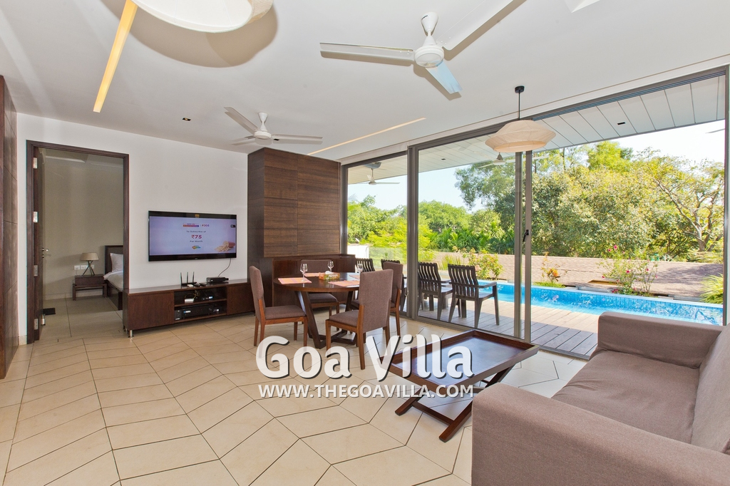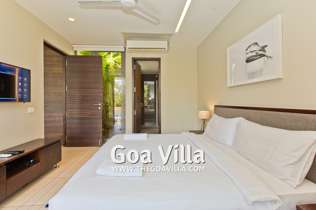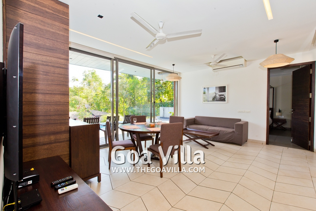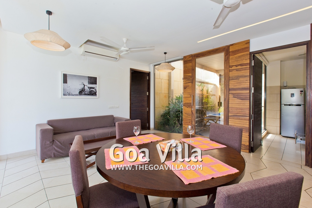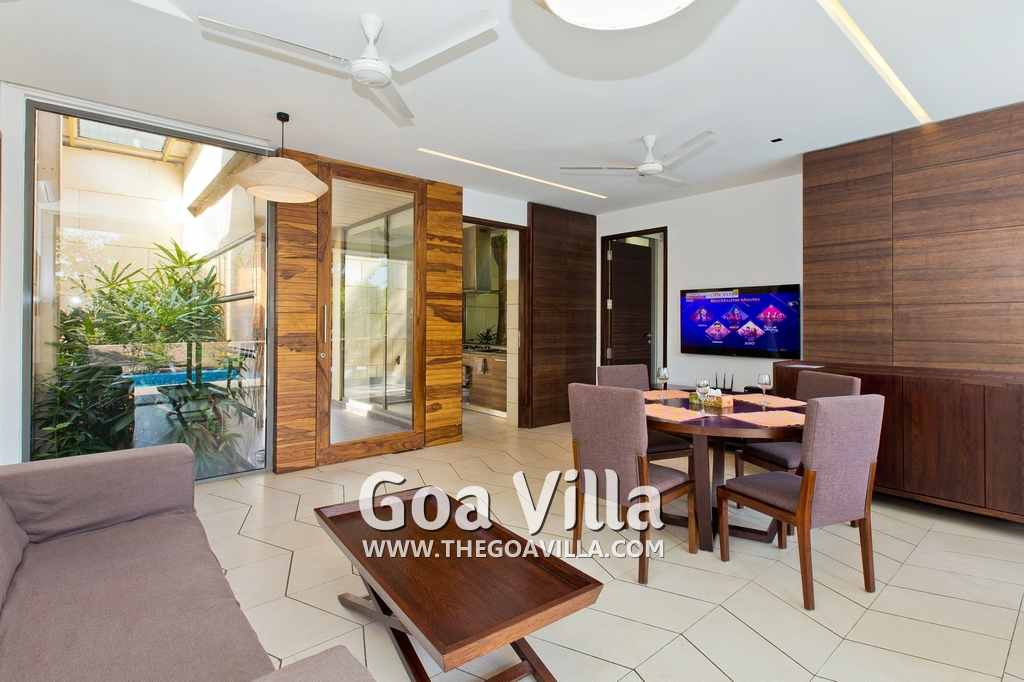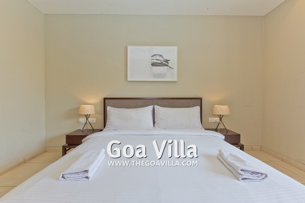 Bedrooms – This villa for rent in Arpora has 2 bedrooms, both en-suite and air-conditioned. They are on both sides of a central living room. Private balconies open to the swimming pool. The bedrooms have a large King bed, side table, lamp shades, floor mat, wall-mounted satellite television, sitting area, table, wardrobe, and paintings on the wall. Minimalistic furniture with aesthetic décor. Daily housekeeping. Extra mattress is provided if needed.