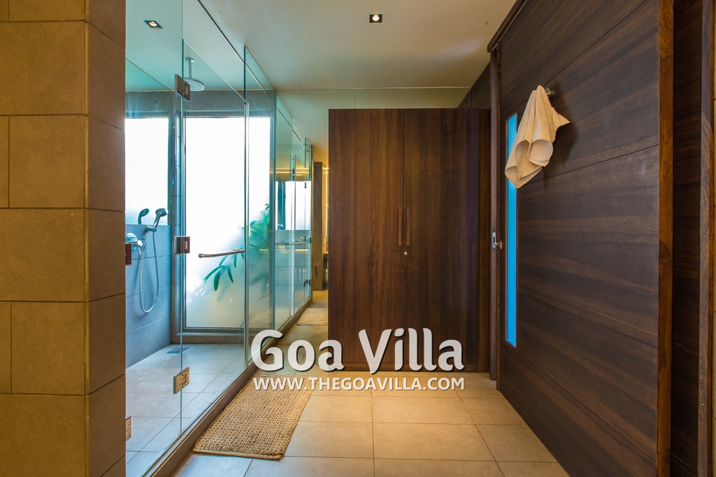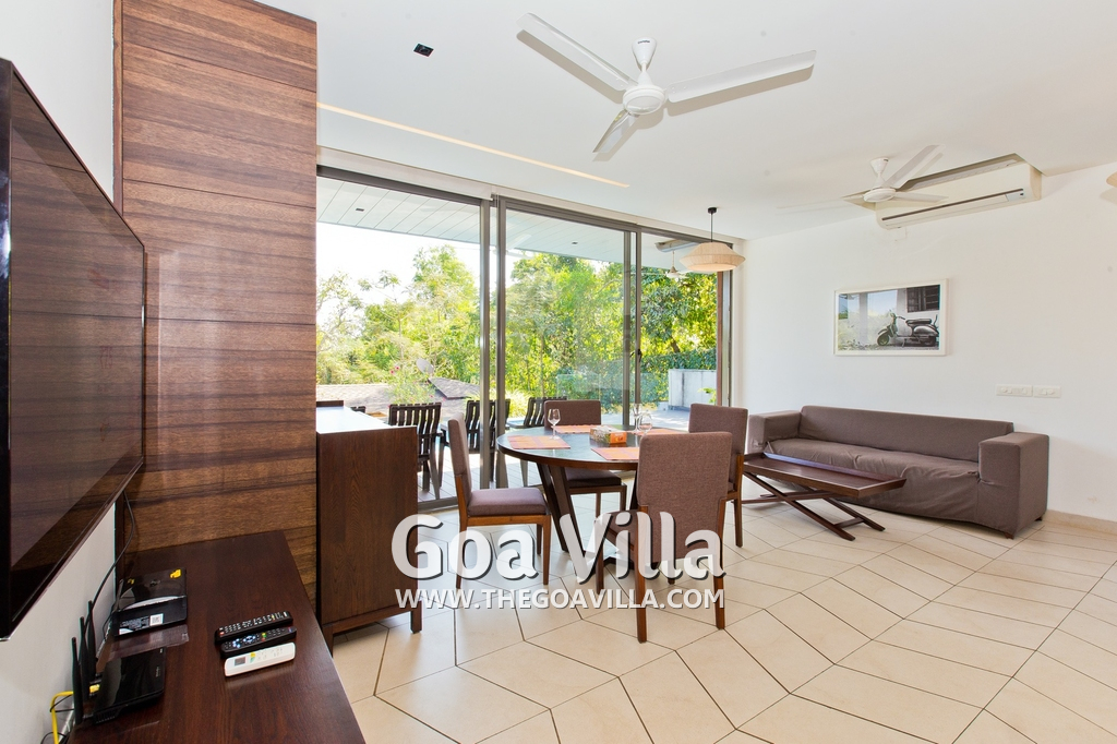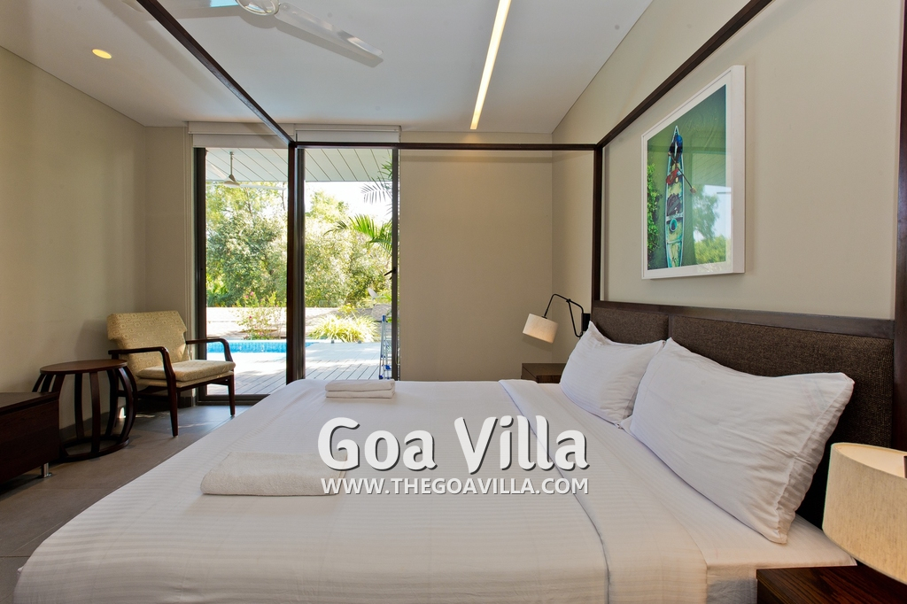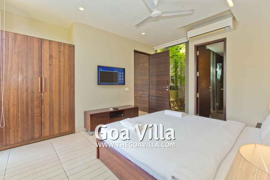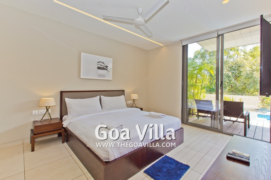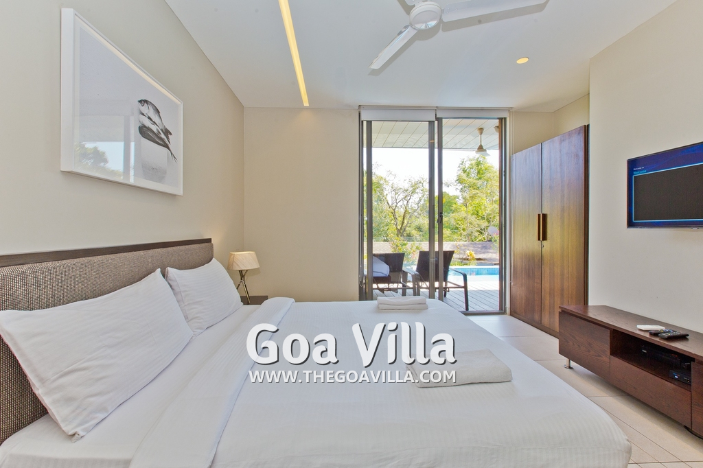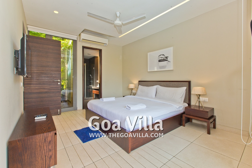 Bedrooms – This villa for rent in Arpora has 2 bedrooms, both en-suite and air-conditioned. They are on both sides of a central living room. Private balconies open to the swimming pool. The bedrooms have a large King bed, side table, lamp shades, floor mat, wall-mounted satellite television, sitting area, table, wardrobe, and paintings on the wall. Minimalistic furniture with aesthetic décor. Daily housekeeping. Extra mattress is provided if needed.
