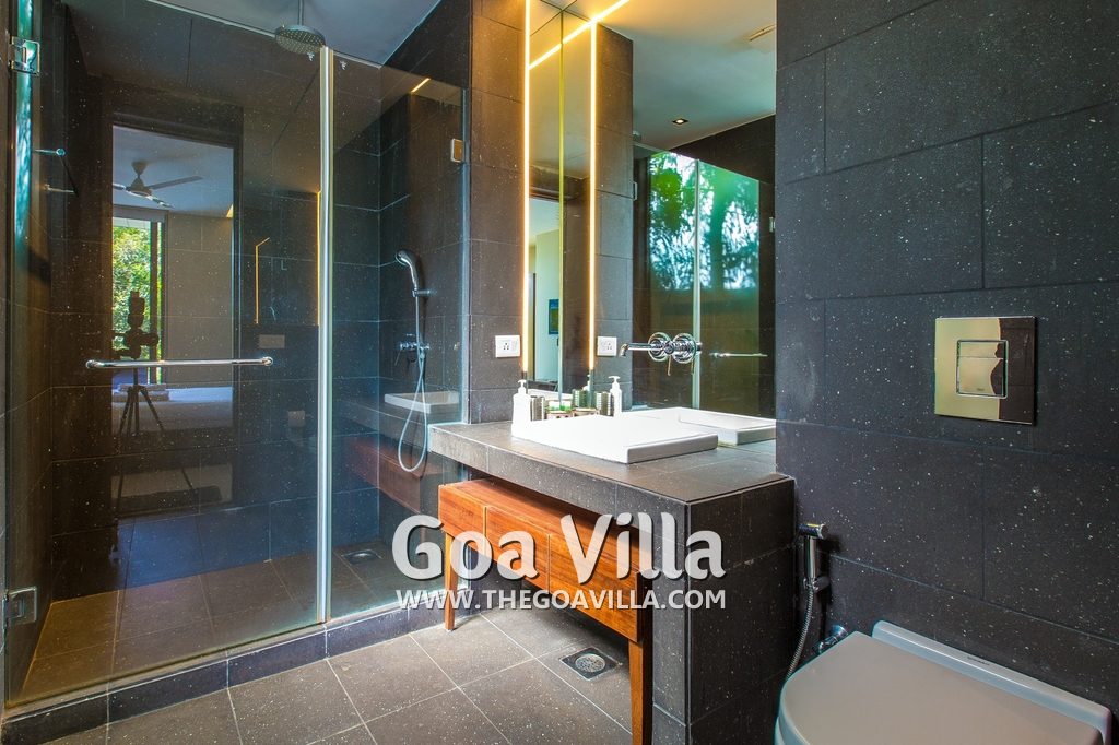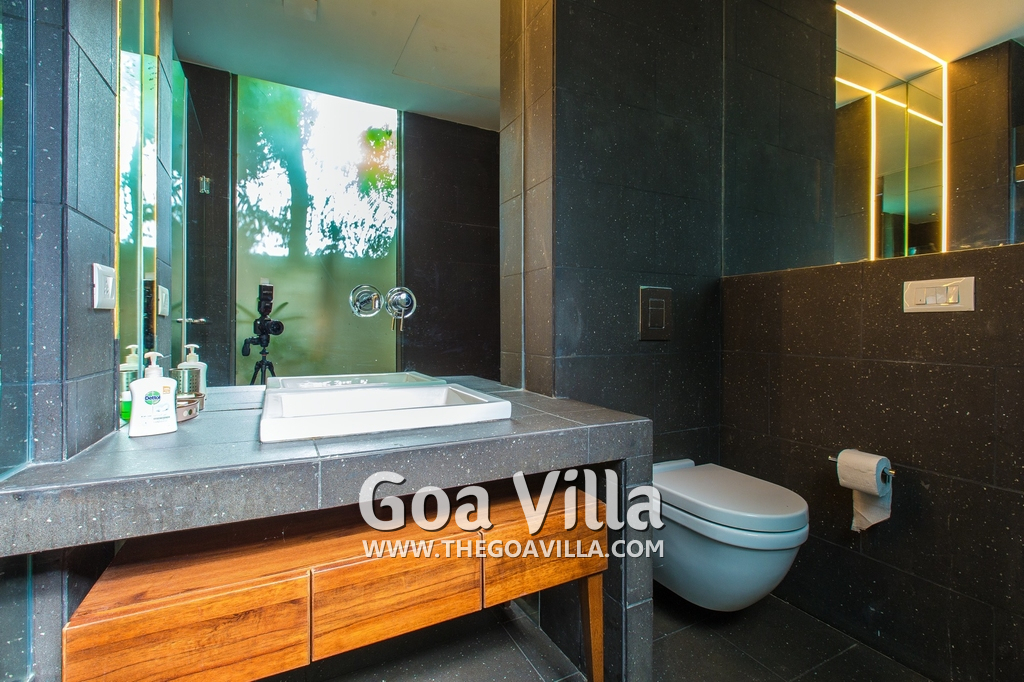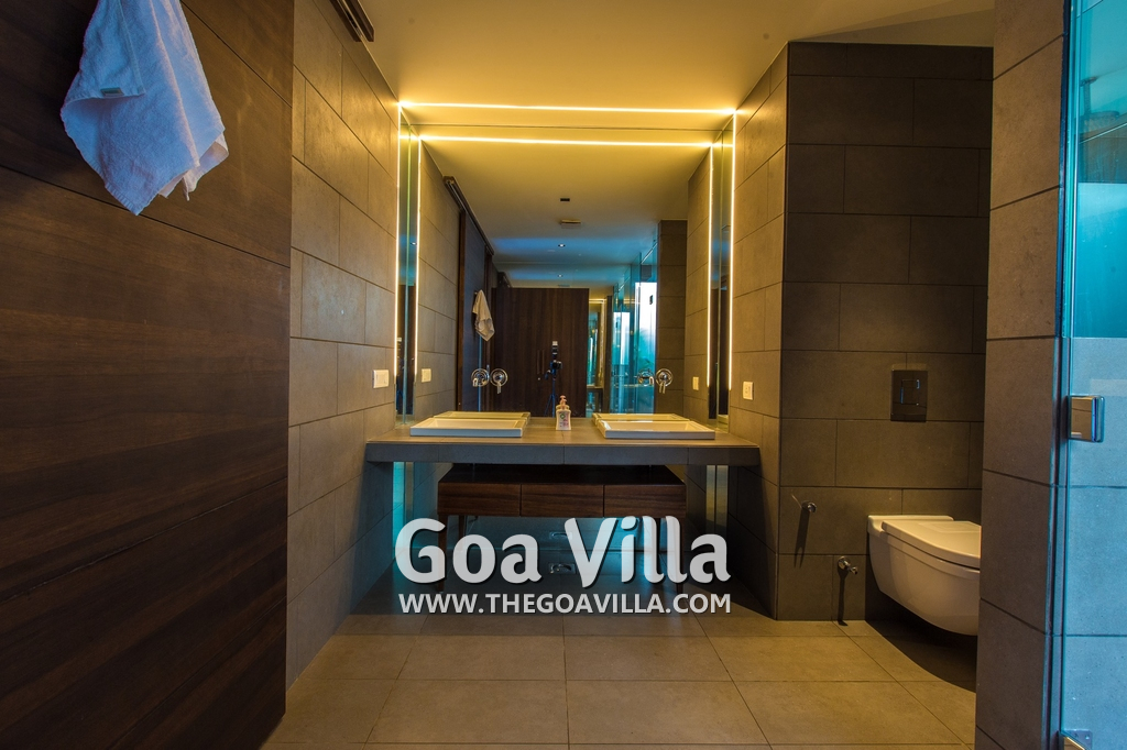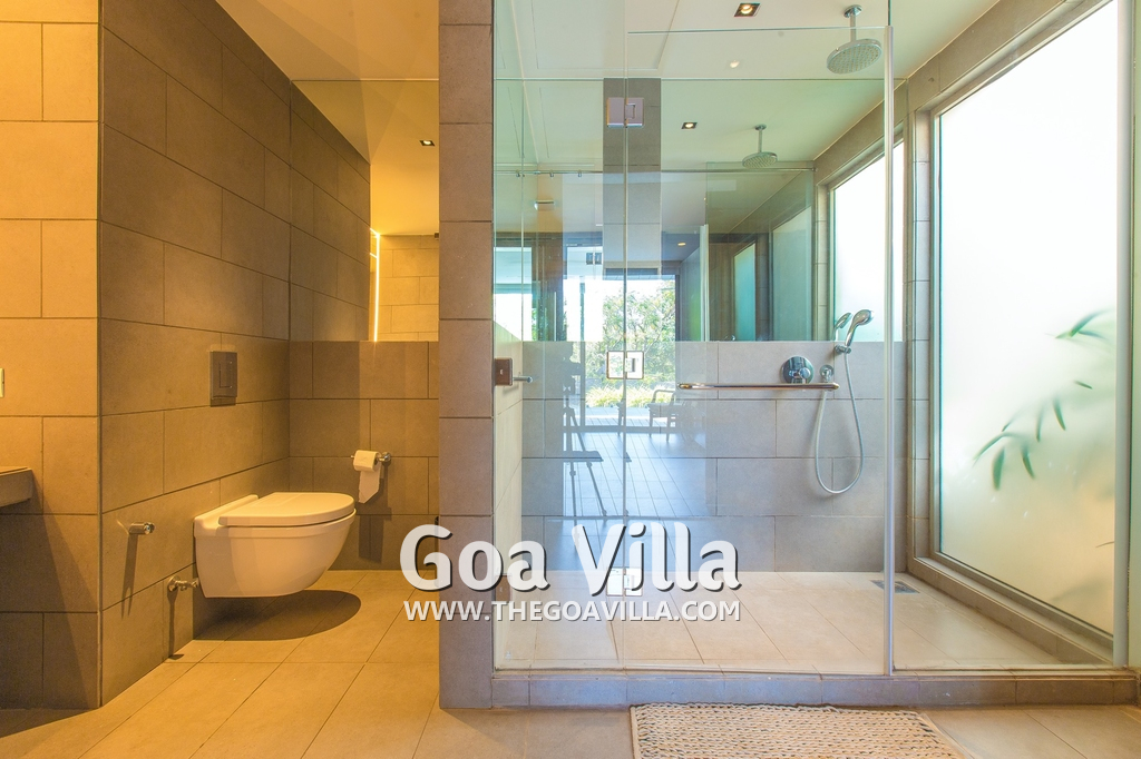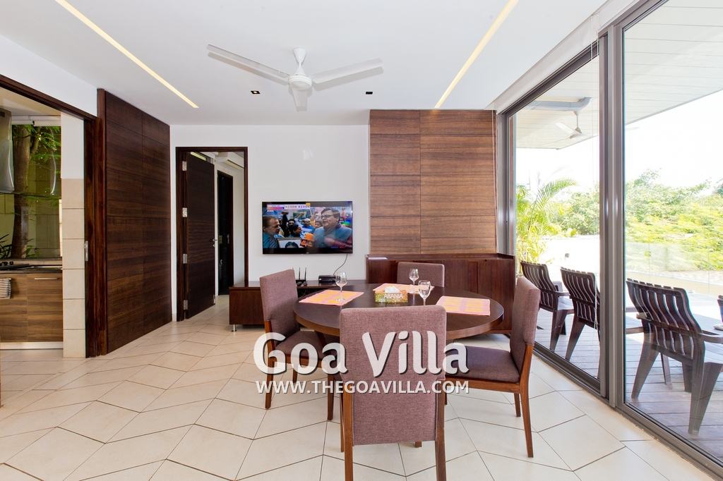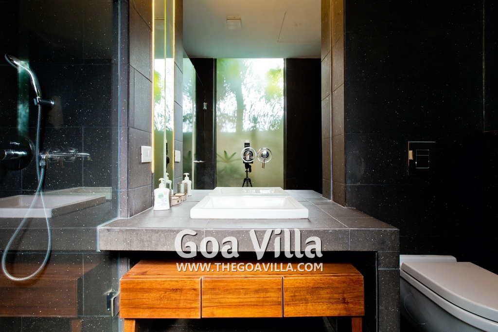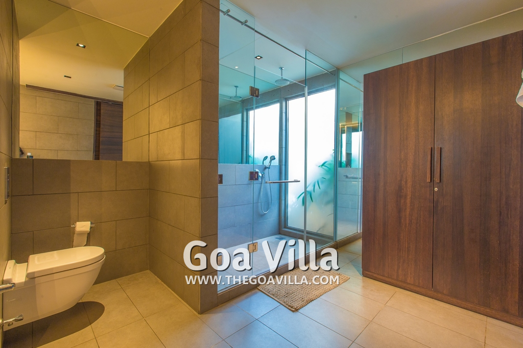 Bedrooms – This villa for rent in Arpora has 2 bedrooms, both en-suite and air-conditioned. They are on both sides of a central living room. Private balconies open to the swimming pool. The bedrooms have a large King bed, side table, lamp shades, floor mat, wall-mounted satellite television, sitting area, table, wardrobe, and paintings on the wall. Minimalistic furniture with aesthetic décor. Daily housekeeping. Extra mattress is provided if needed.