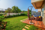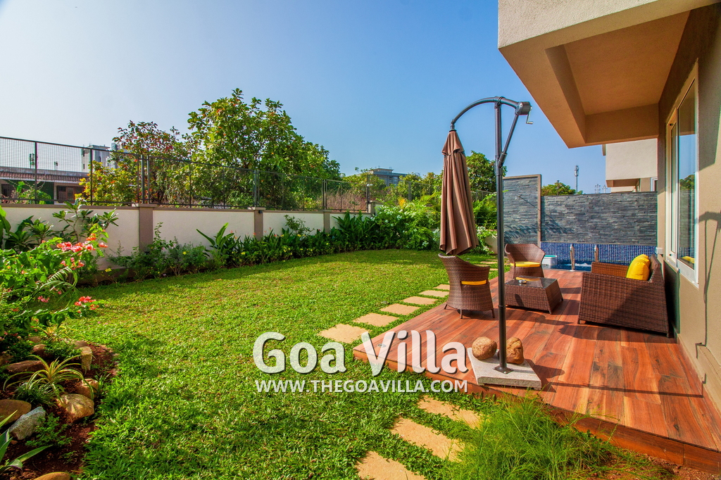 Swimming Pool – There is a private swimming pool and a sun deck with recliners and sun beds where guests can relax after a dip in the pool. There is also a patio with sitting and a table for outdoor snacks. A beautifully landscaped lawn and rock garden provides a nice soothing touch.