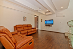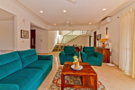 Living Room – There is a beautiful living room in this plush house with a colorful 2+2 sofa, wooden center table, and carpet. It faces the landscaped lawn. There are potted plants and several paintings on the wall. This is a very good place to spend a casual evening, socializing with friends or family. Staircase goes to the first floor from one side. On top of the staircase is an air-conditioned lounge area with a wall-mounted 43-inch satellite television.