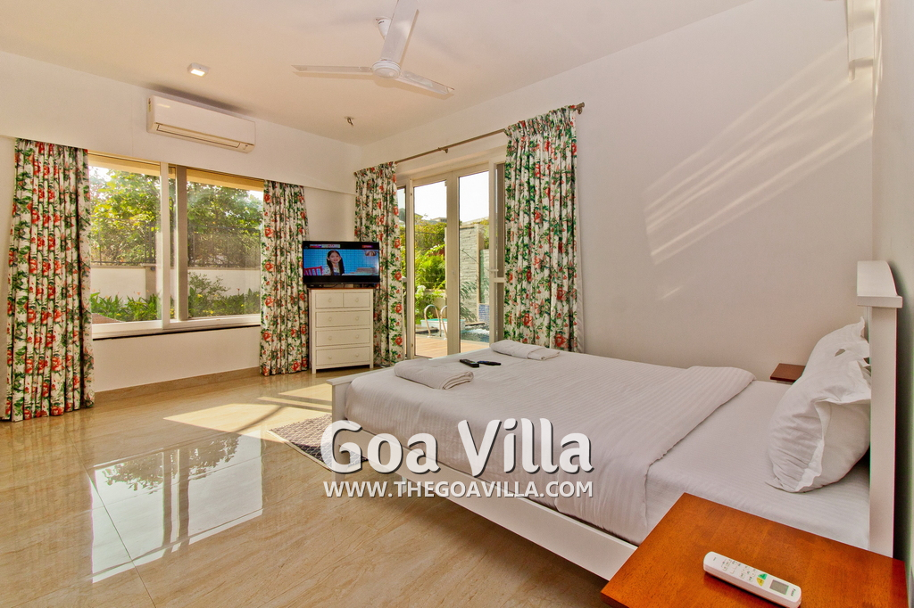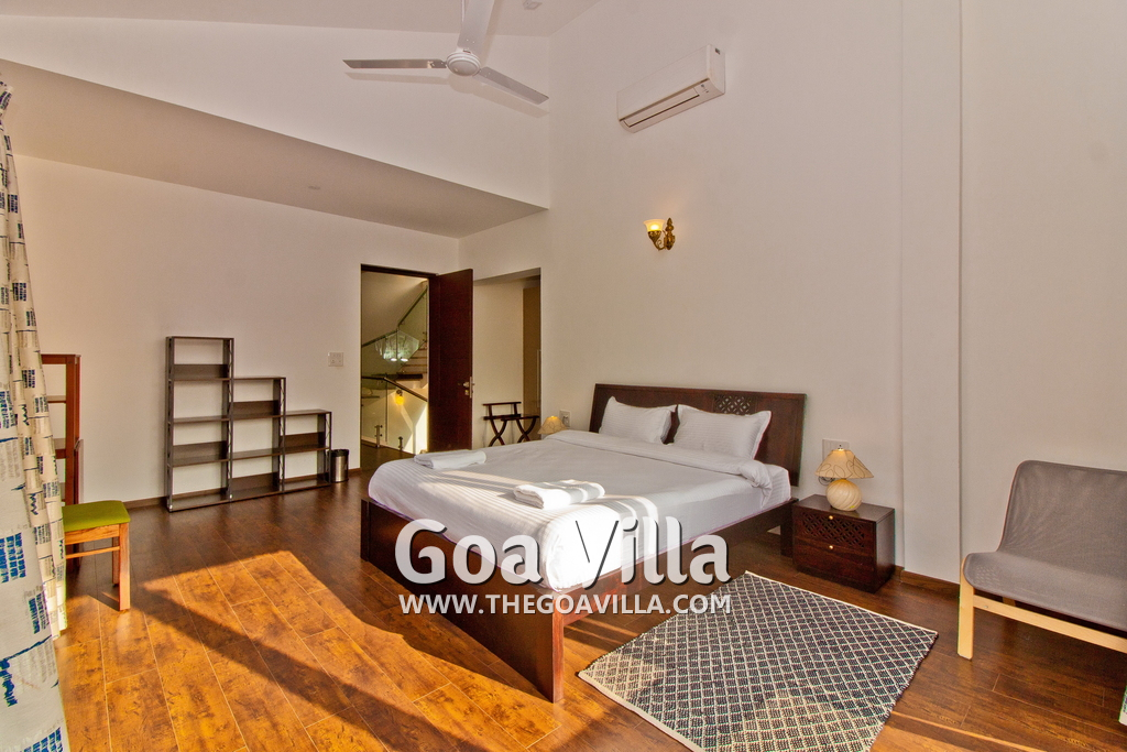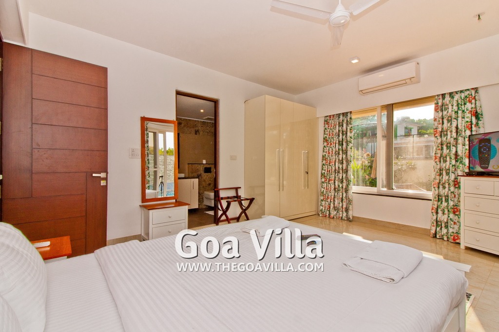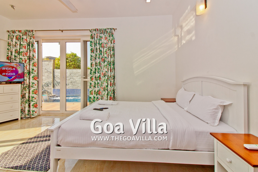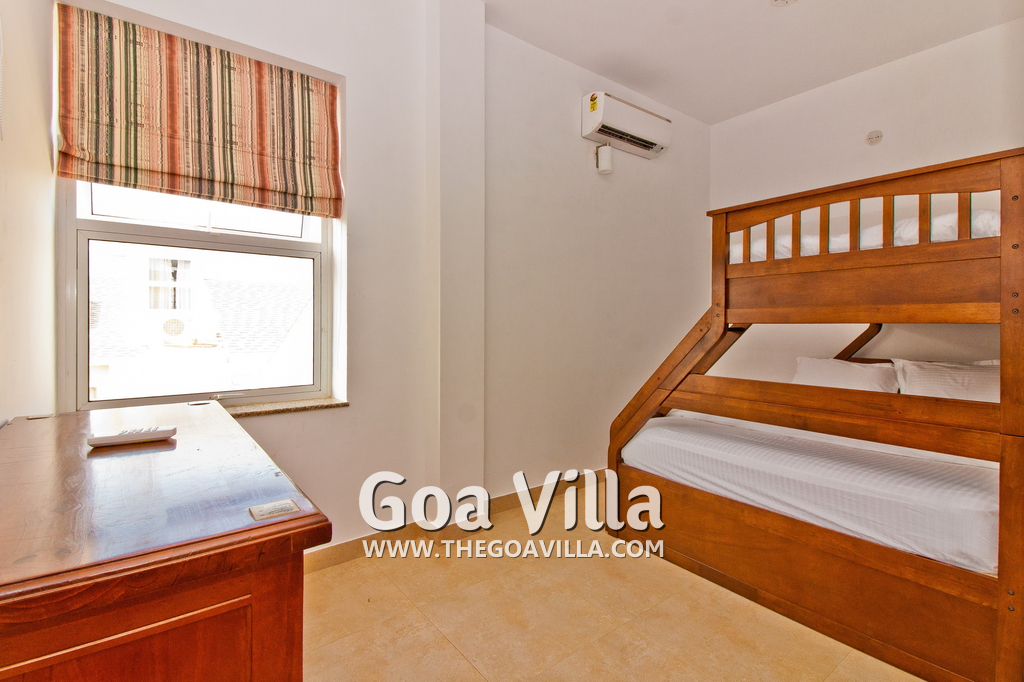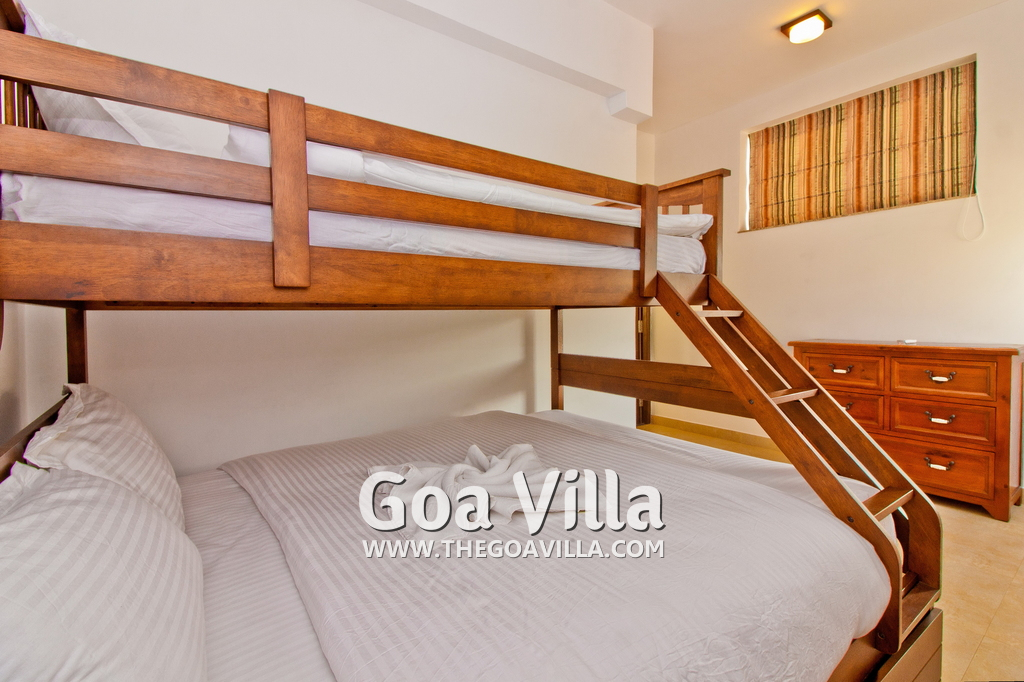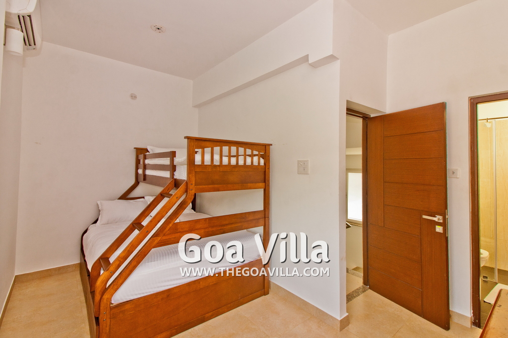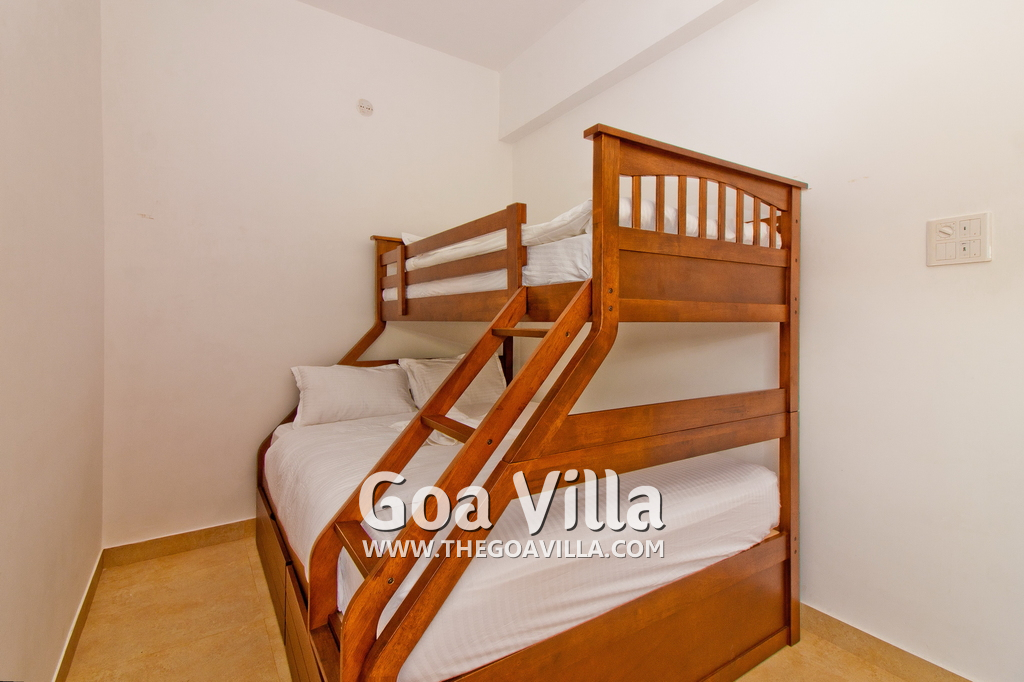Bedrooms – This holiday villa for rent in North Goa has 4 fully-furnished bedrooms. They are all air-conditioned with attached bathrooms. The pool-facing bedrooms have comfortable queen beds, side table, wardrobe, chest of drawers, dressing table, flat-screen satellite television, and floor mat. Large windows offer swimming pool and nature views. Whitewashed walls. The master bedroom is much bigger. Wooden flooring. Walk-in wardrobe. It has a private balcony facing the pool and the backyard. The 4th bedroom has a bunk bed, a good choice for the kids, and even adults.
