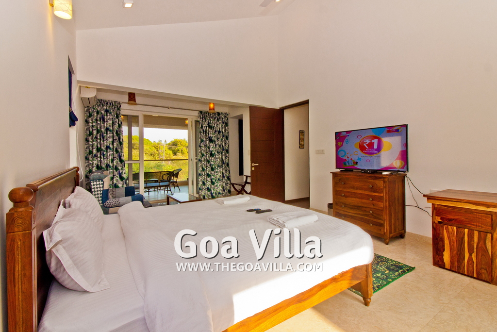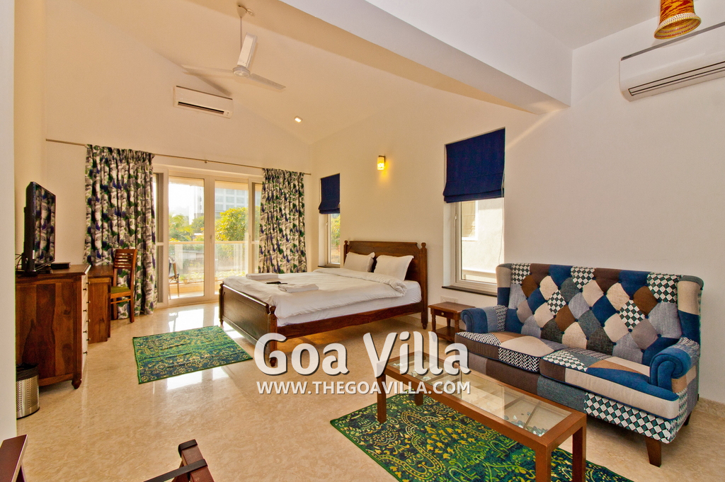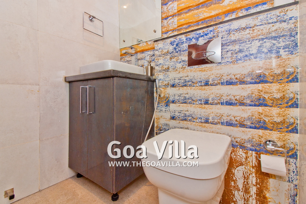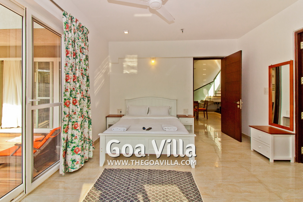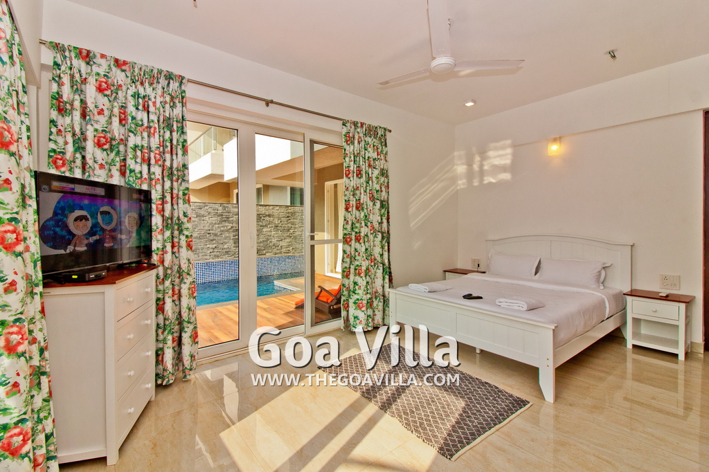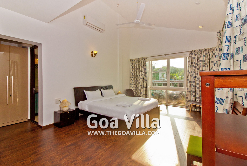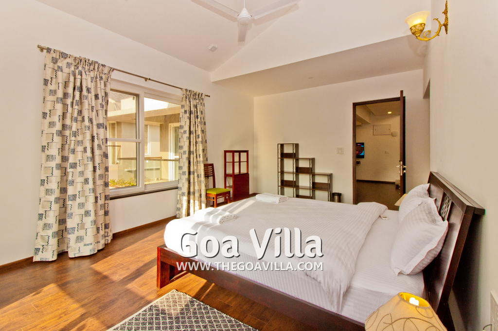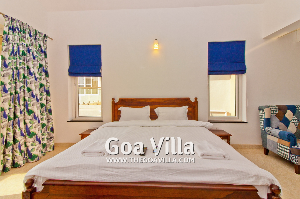 Bedrooms – This holiday villa for rent in North Goa has 4 fully-furnished bedrooms. They are all air-conditioned with attached bathrooms. The pool-facing bedrooms have comfortable queen beds, side table, wardrobe, chest of drawers, dressing table, flat-screen satellite television, and floor mat. Large windows offer swimming pool and nature views. Whitewashed walls. The master bedroom is much bigger. Wooden flooring. Walk-in wardrobe. It has a private balcony facing the pool and the backyard. The 4th bedroom has a bunk bed, a good choice for the kids, and even adults.