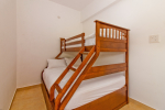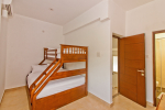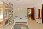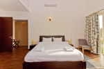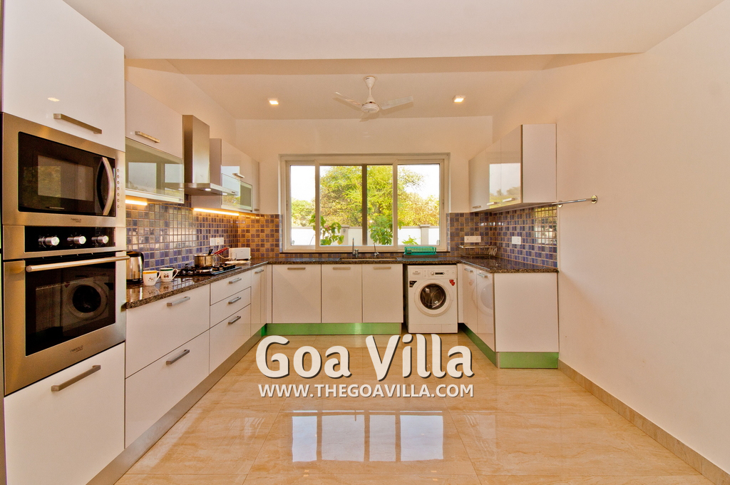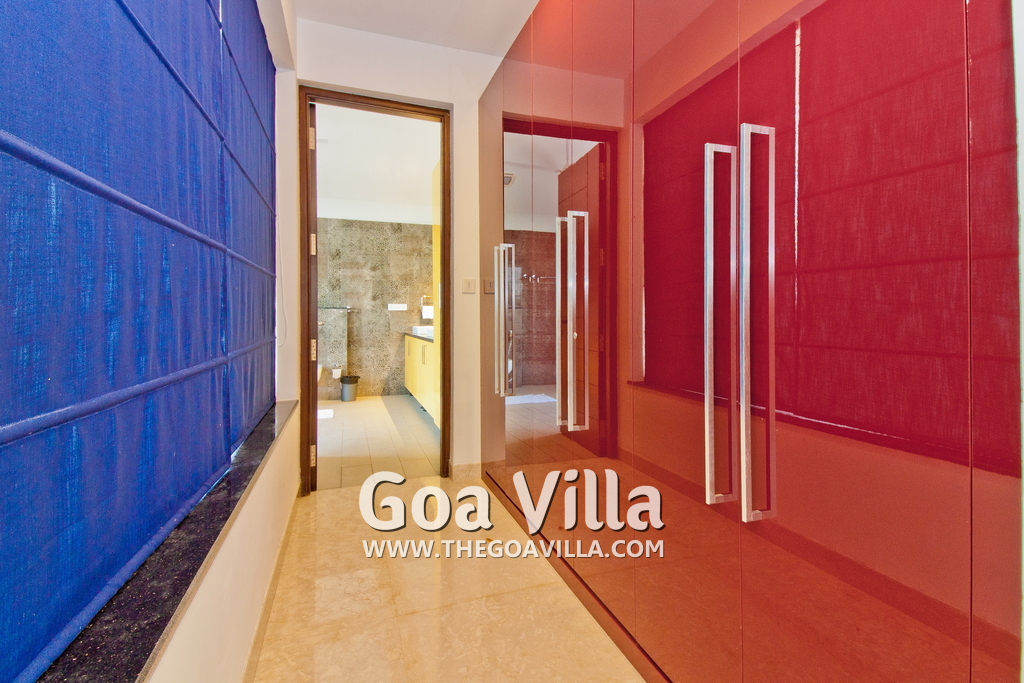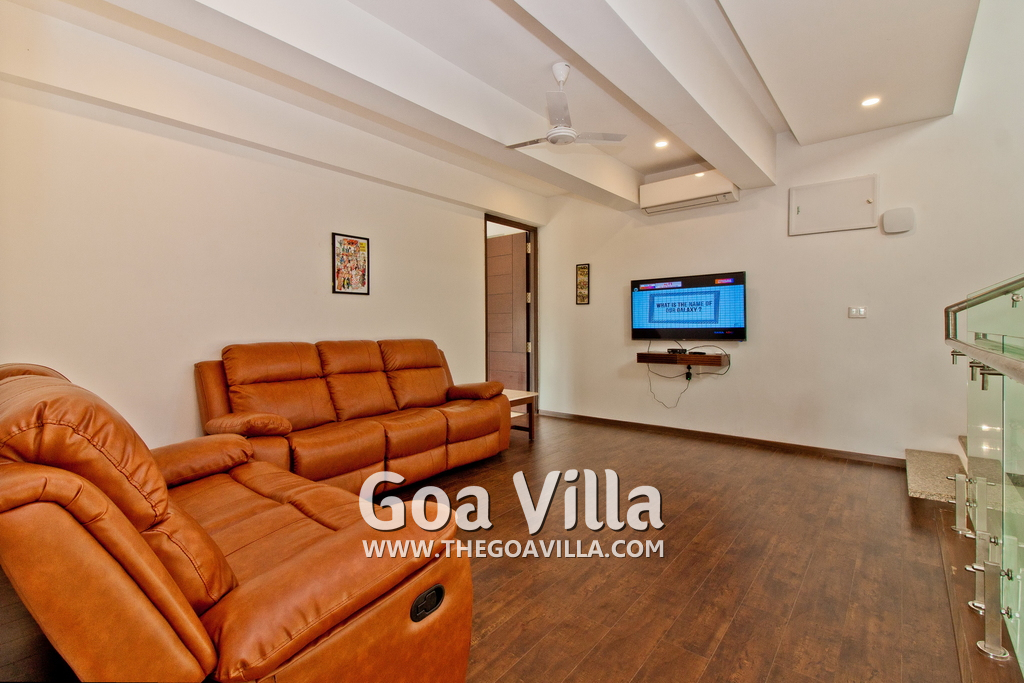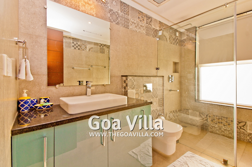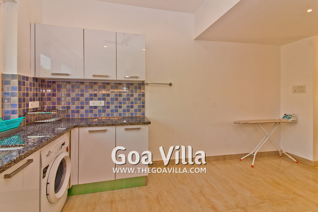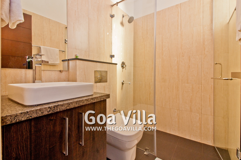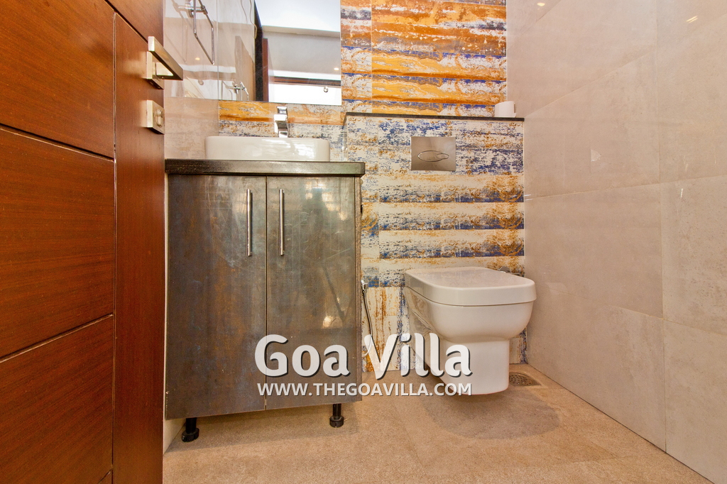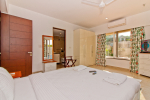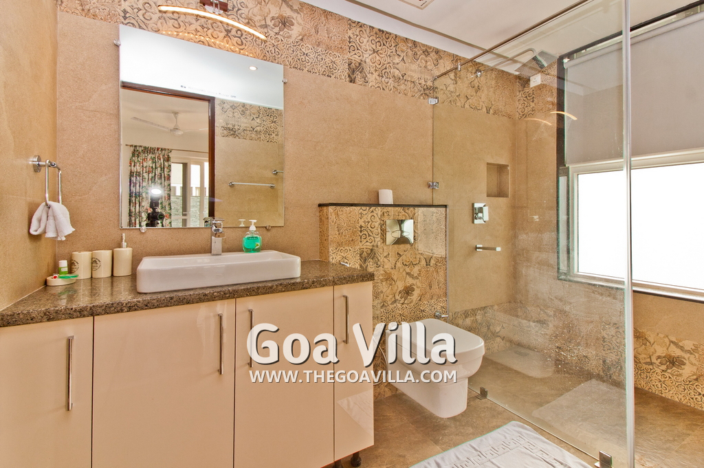 Bedrooms – This holiday villa for rent in North Goa has 4 fully-furnished bedrooms. They are all air-conditioned with attached bathrooms. The pool-facing bedrooms have comfortable queen beds, side table, wardrobe, chest of drawers, dressing table, flat-screen satellite television, and floor mat. Large windows offer swimming pool and nature views. Whitewashed walls. The master bedroom is much bigger. Wooden flooring. Walk-in wardrobe. It has a private balcony facing the pool and the backyard. The 4th bedroom has a bunk bed, a good choice for the kids, and even adults.
