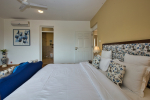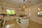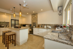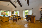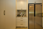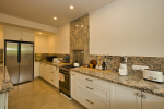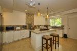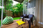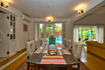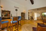 Kitchen, Dining – The dining area is located at one side of the living space. The glass-top center table offers sitting for 8 guests. Both the dining and living areas are air-conditioned and face the swimming pool. The kitchen is fully equipped. Guests can use cooking station, toaster, microwave, juicer, sink, and a large double-door refrigerator. There is also a small marble-top table with stools for a meal for quick snack.