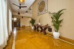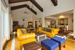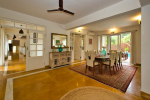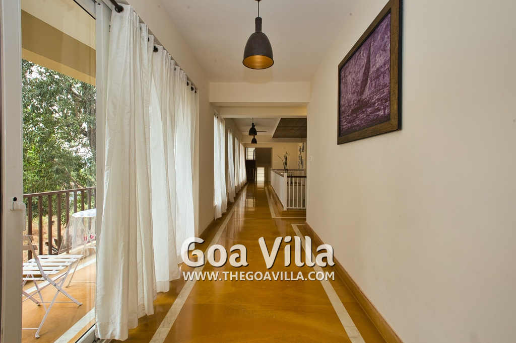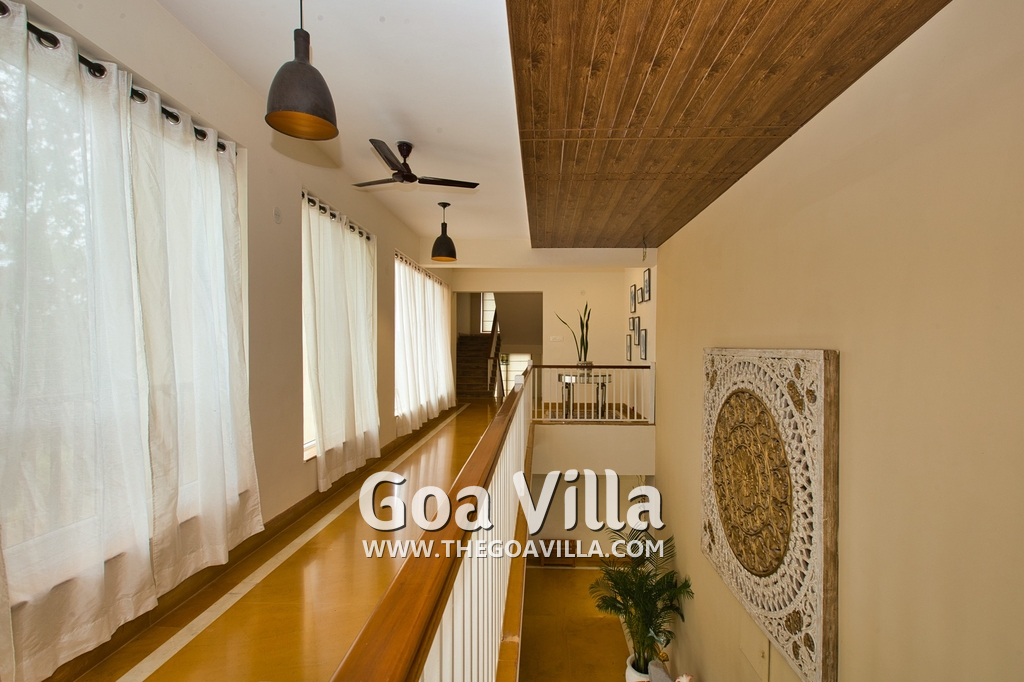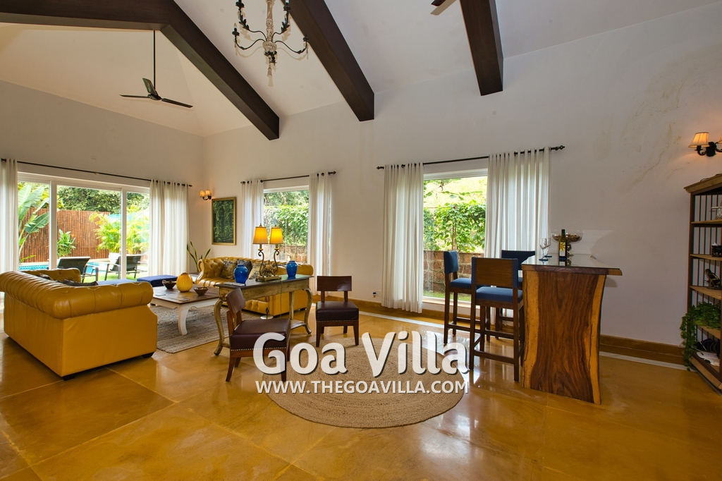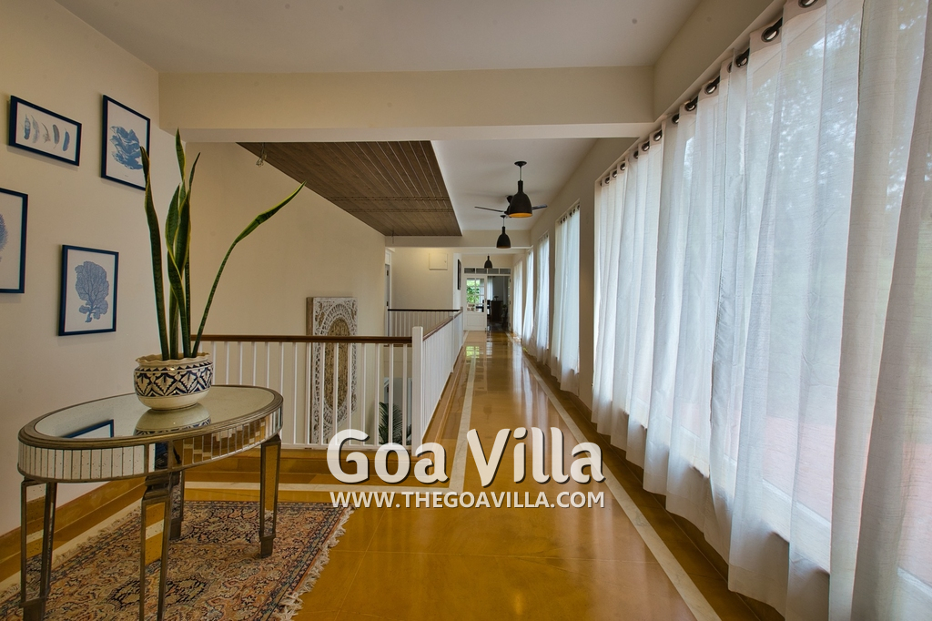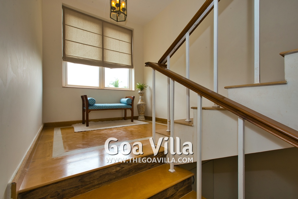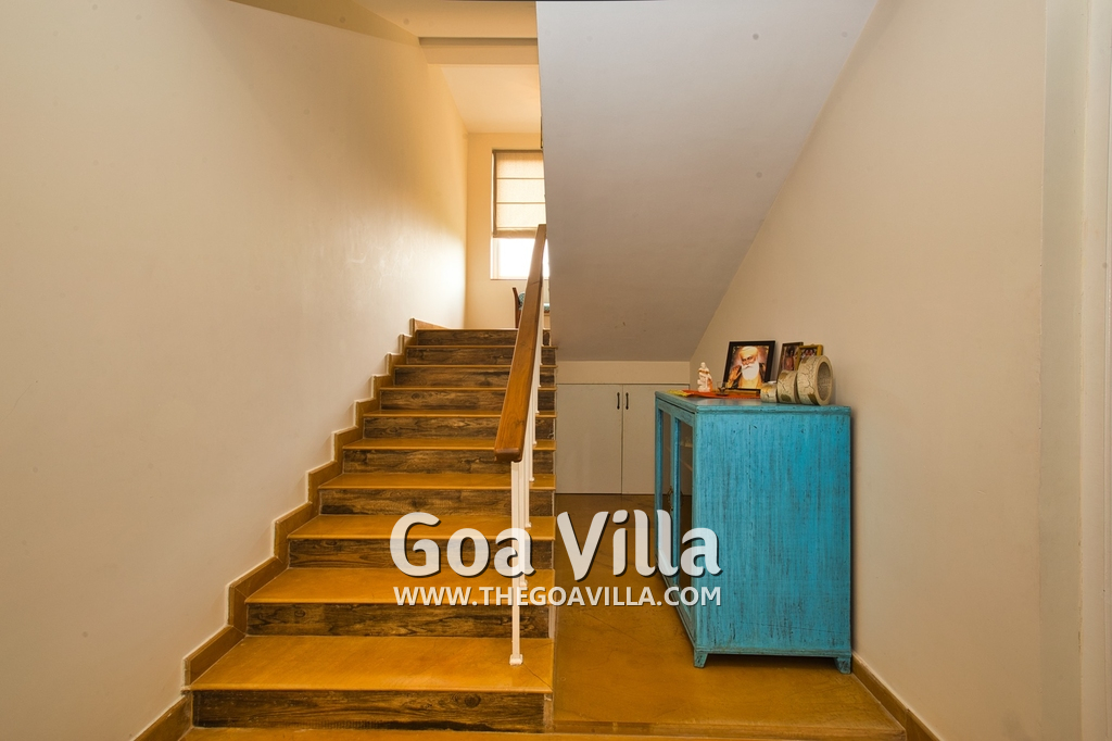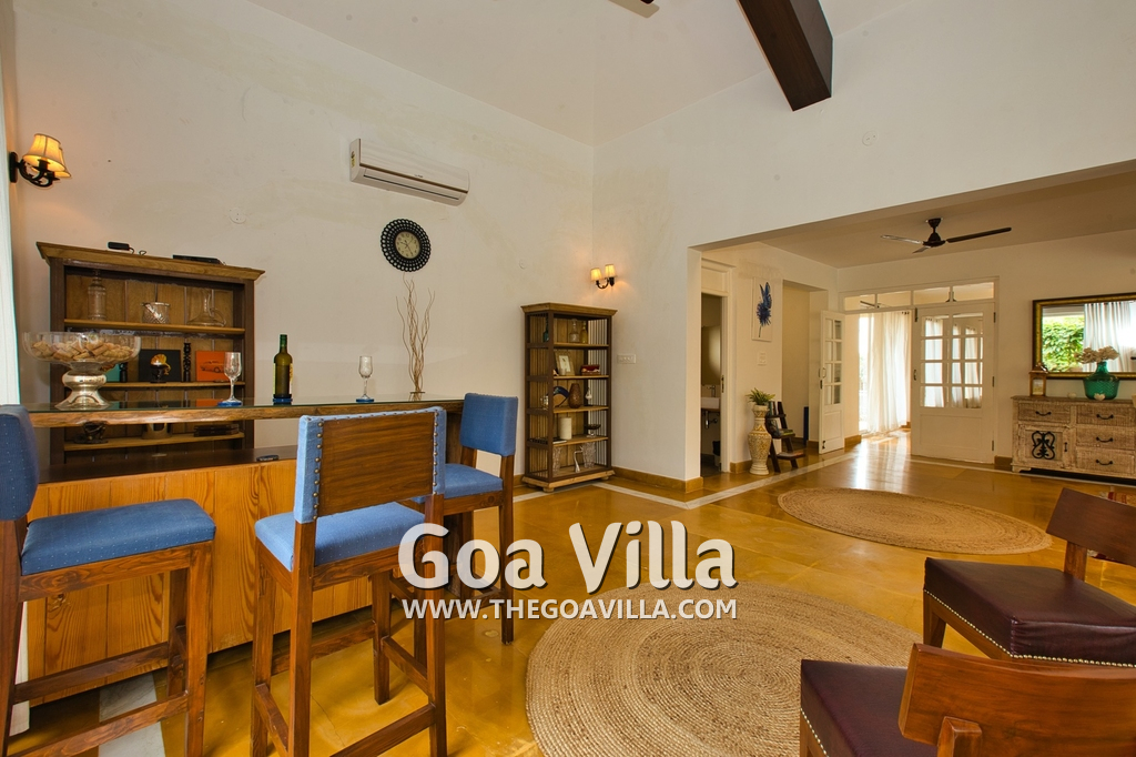 Living Room – There is a beautifully decorated living room in this North Goa holiday home. This room has vibrant colors. It has 2 large sofas, several chairs, center table, carpet, potted plants, and paintings. Wide windows and high ceiling allow plenty of air and sunlight. There is a small bar at one corner. Staircase leads to the first floor, where there is a wide verandah with many potted plants and objects of art.