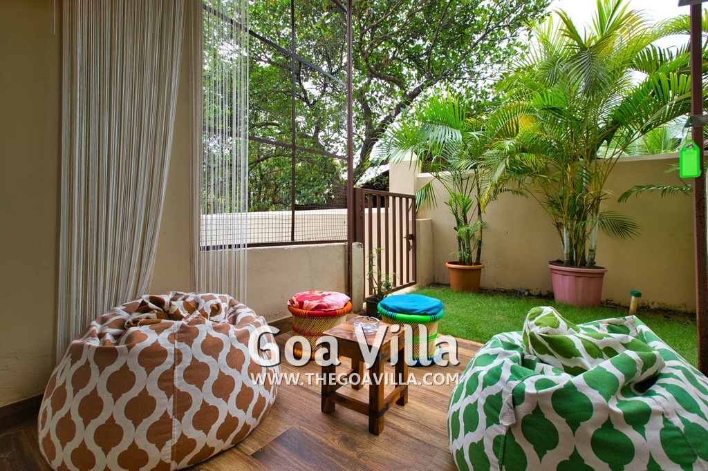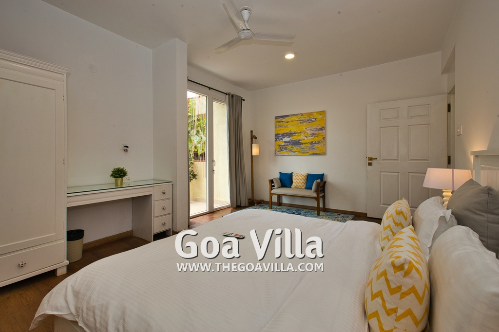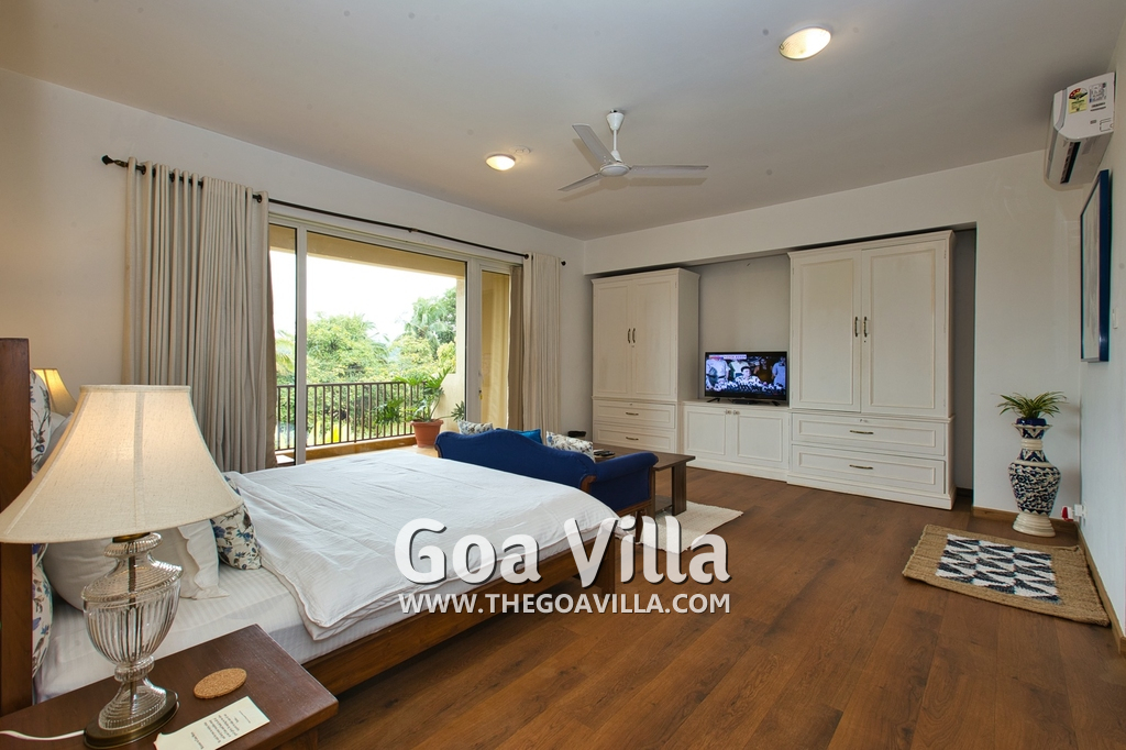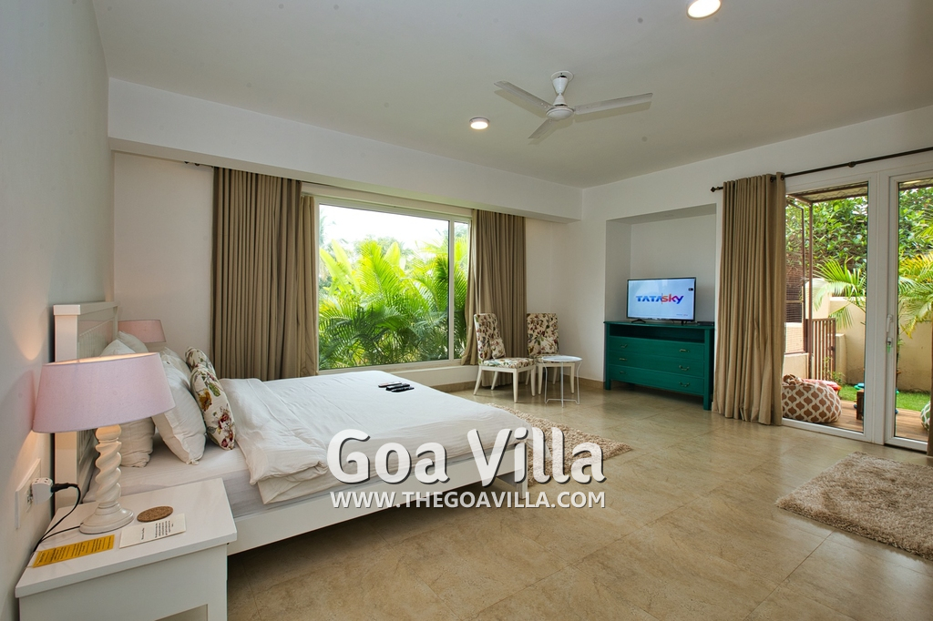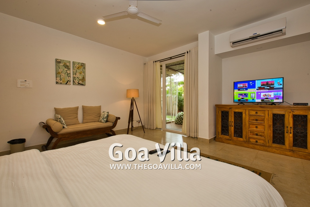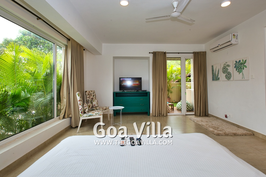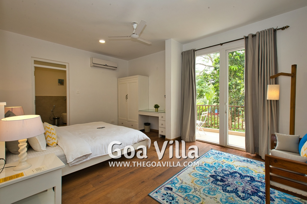 Bedrooms – Morjim Villa has 5 bedrooms, all en-suite and air-conditioned. Filly furnished, there is a large comfortable bed, extra pillows, side table with lamp shades, wardrobe, study table, flat-screen television, sofa, carpet, potted plants, and paintings on the wall. French ceiling-to-wall doors open to the balcony providing views of tall trees and nature. Whitewashed walls calm the mind helping our guests relax. The balcony is wide with a sitting area. Ground floor bedrooms have an outdoor sitting area that extends to the lawn.