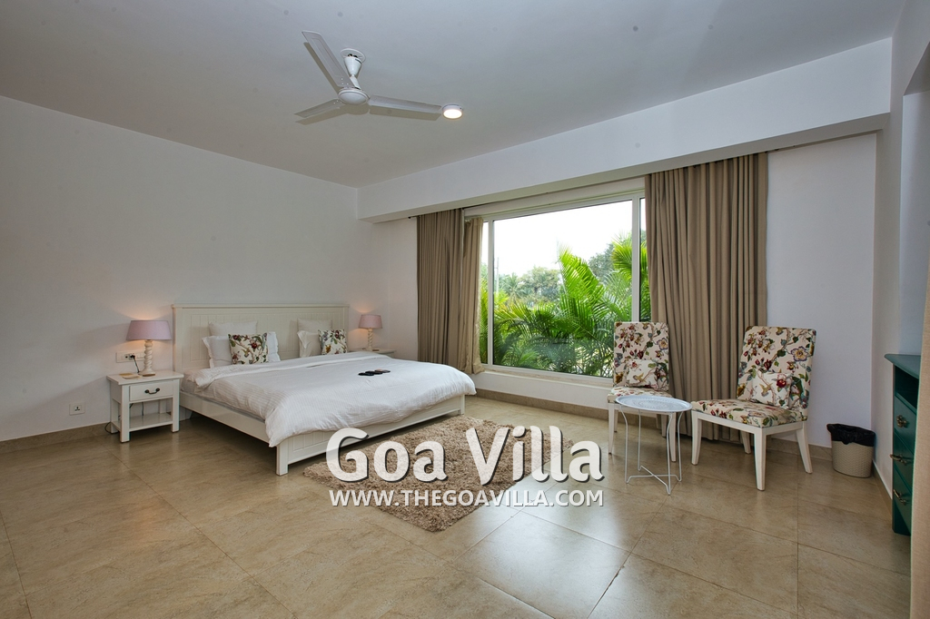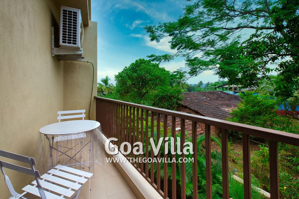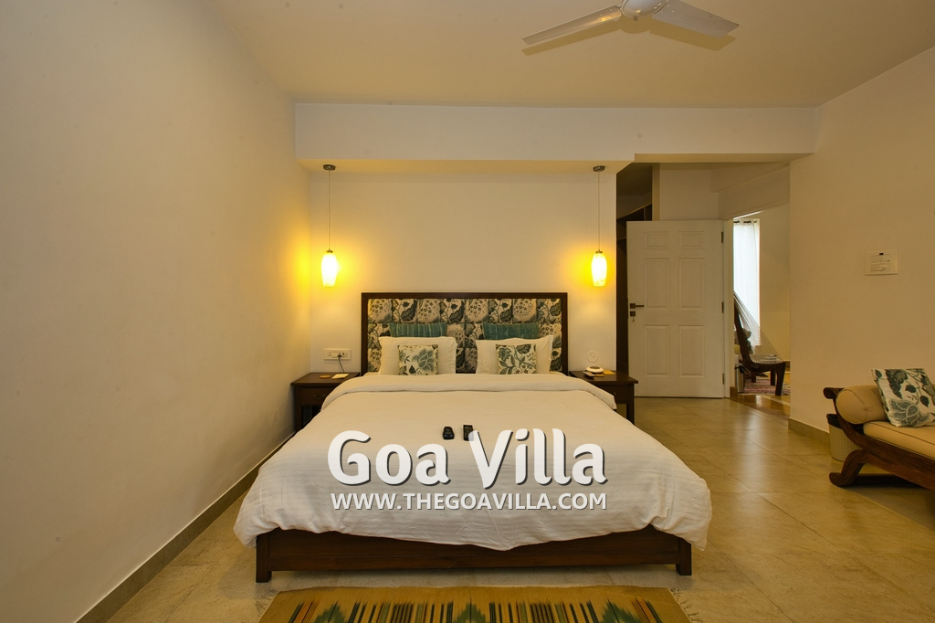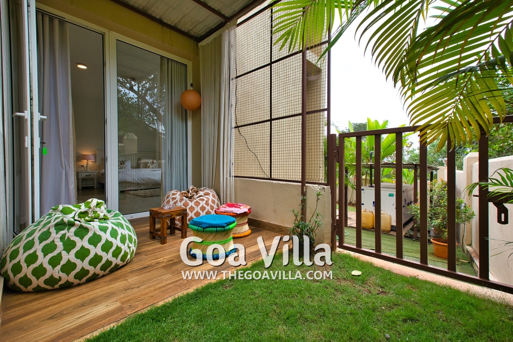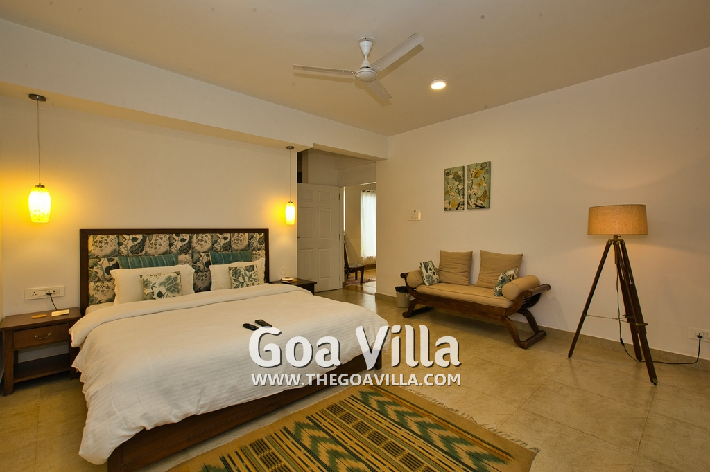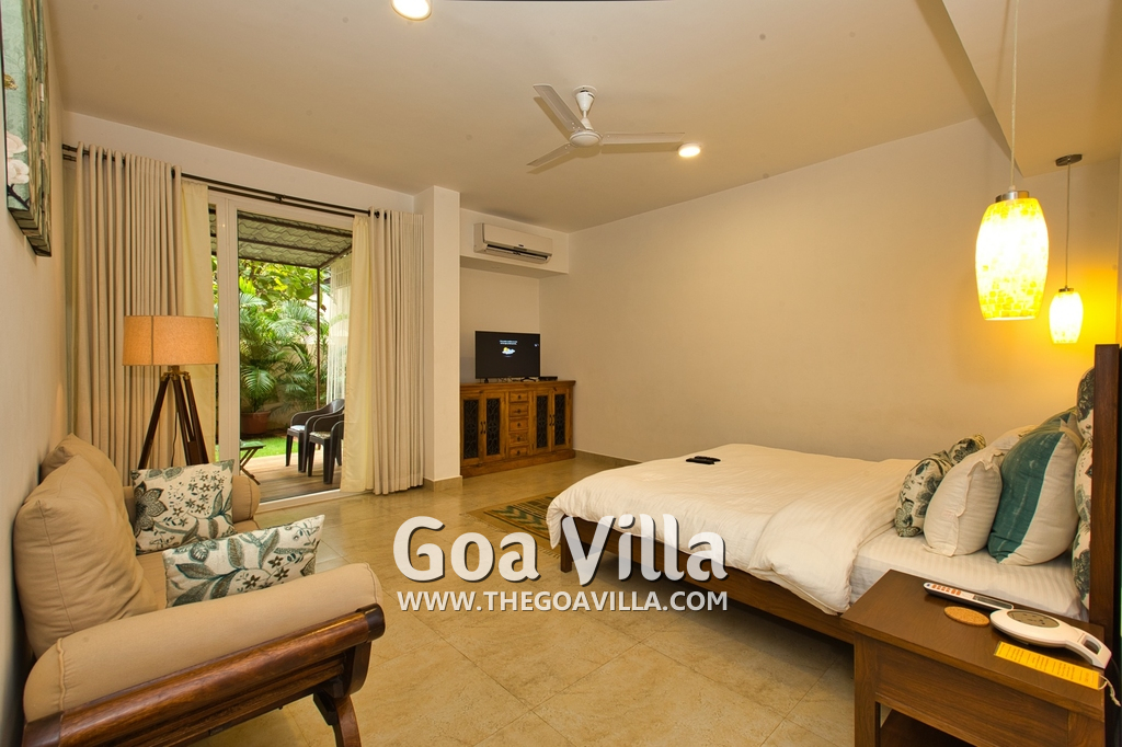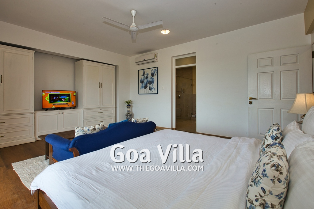 Bedrooms – Morjim Villa has 5 bedrooms, all en-suite and air-conditioned. Filly furnished, there is a large comfortable bed, extra pillows, side table with lamp shades, wardrobe, study table, flat-screen television, sofa, carpet, potted plants, and paintings on the wall. French ceiling-to-wall doors open to the balcony providing views of tall trees and nature. Whitewashed walls calm the mind helping our guests relax. The balcony is wide with a sitting area. Ground floor bedrooms have an outdoor sitting area that extends to the lawn.