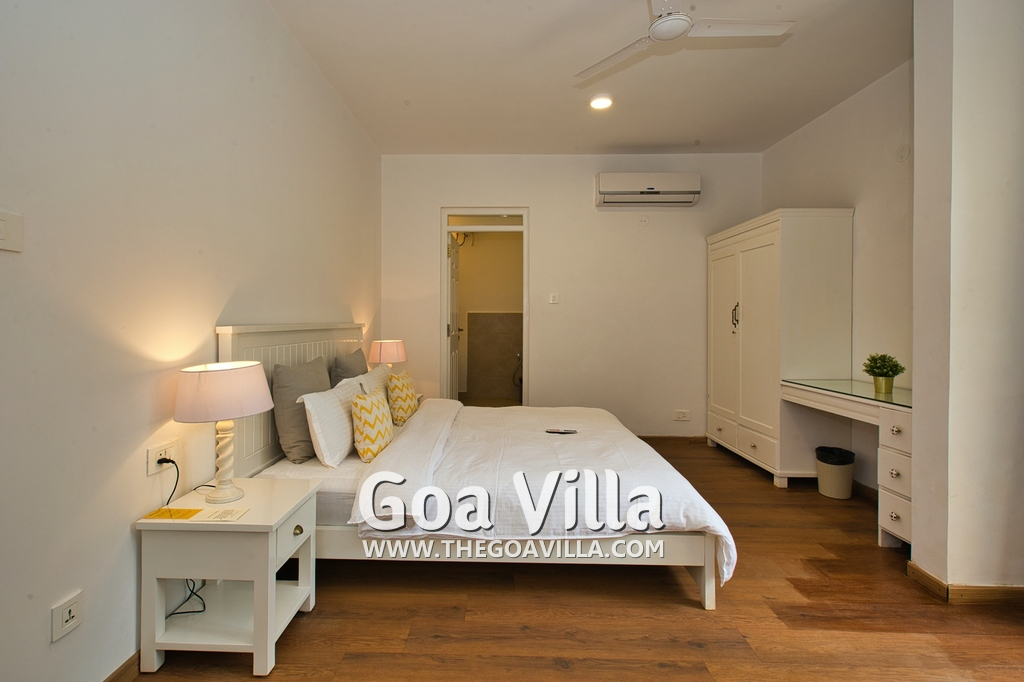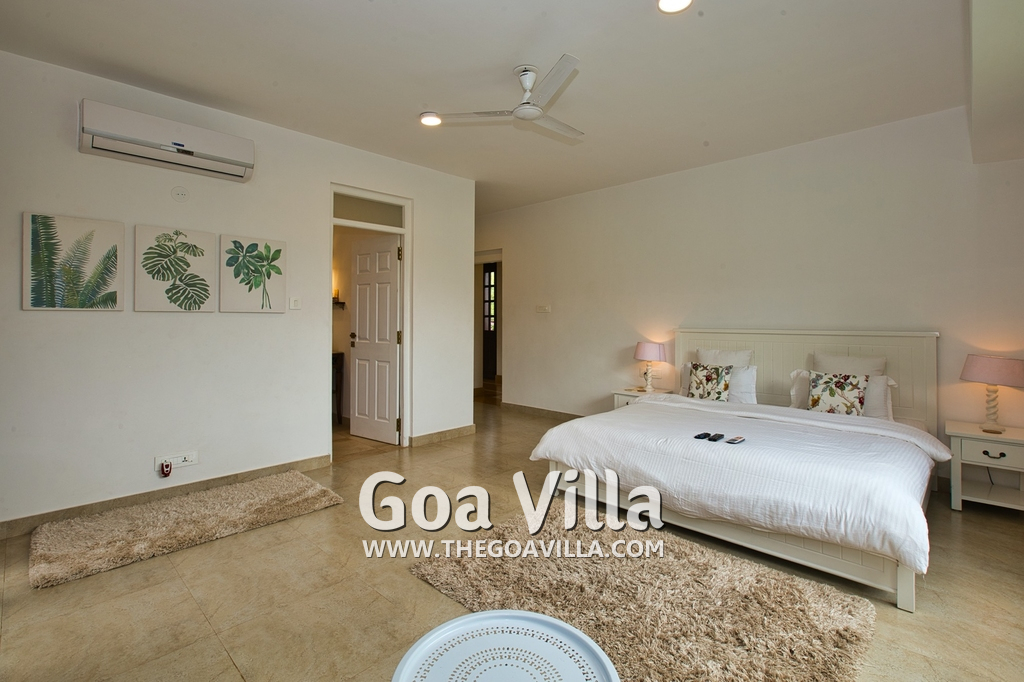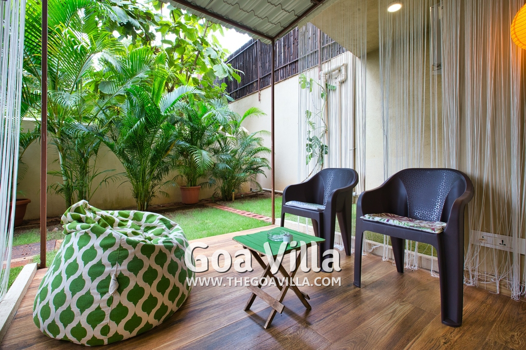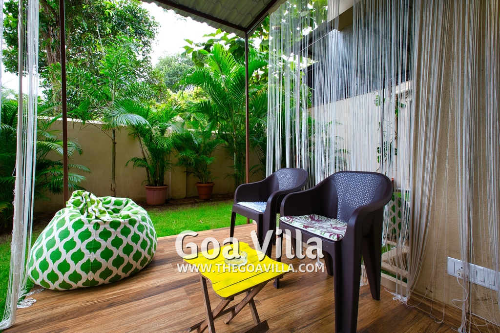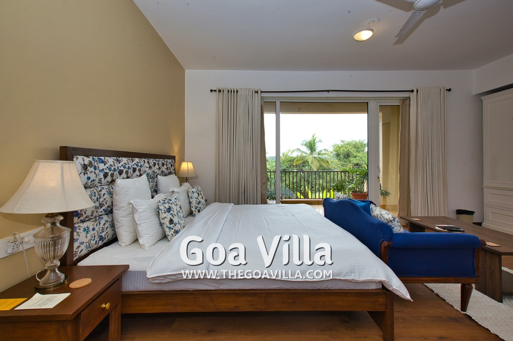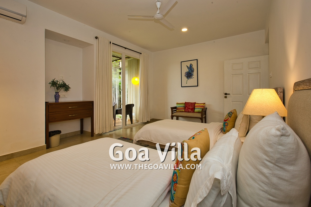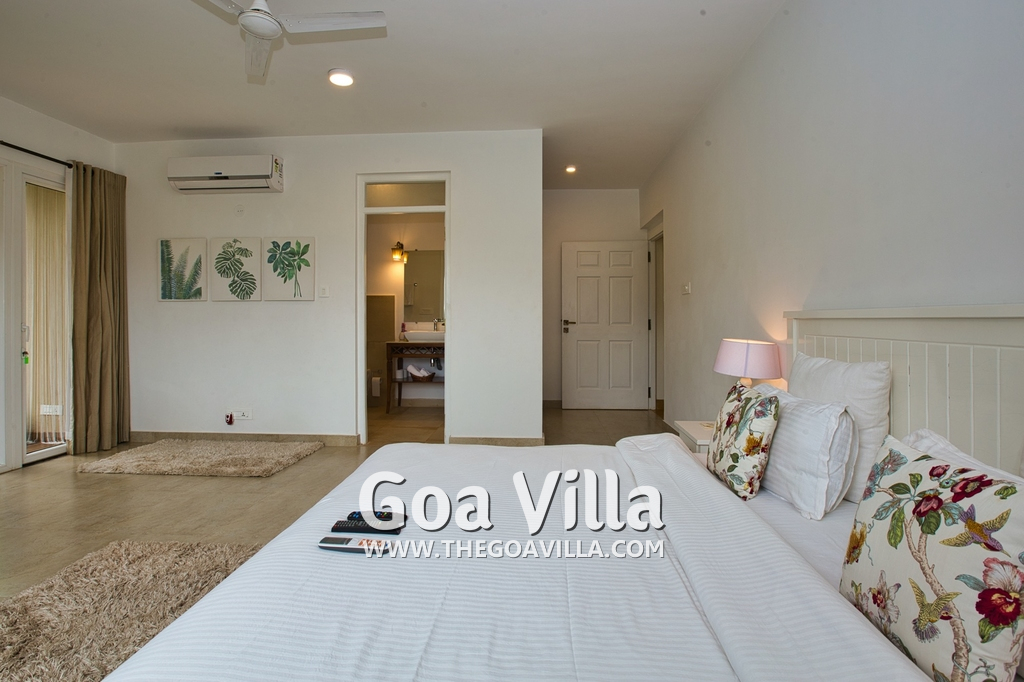 Bedrooms – Morjim Villa has 5 bedrooms, all en-suite and air-conditioned. Filly furnished, there is a large comfortable bed, extra pillows, side table with lamp shades, wardrobe, study table, flat-screen television, sofa, carpet, potted plants, and paintings on the wall. French ceiling-to-wall doors open to the balcony providing views of tall trees and nature. Whitewashed walls calm the mind helping our guests relax. The balcony is wide with a sitting area. Ground floor bedrooms have an outdoor sitting area that extends to the lawn.