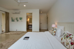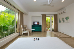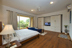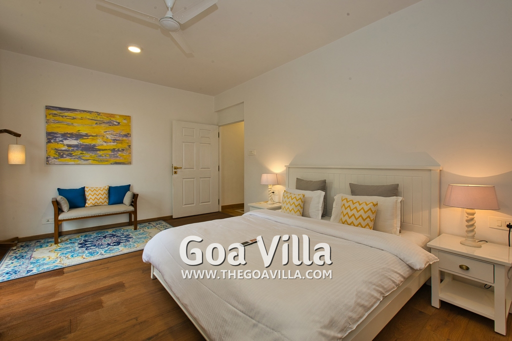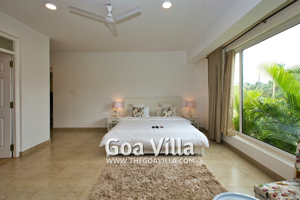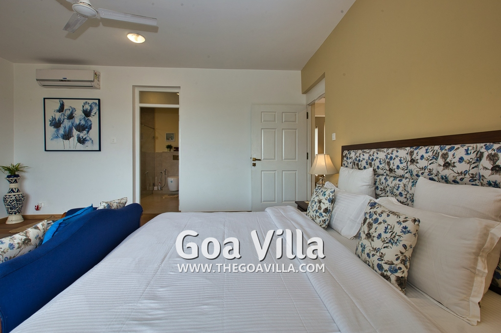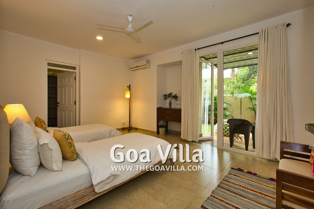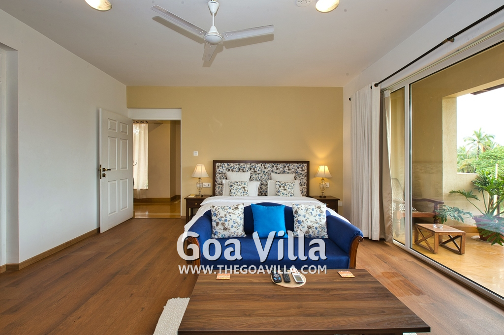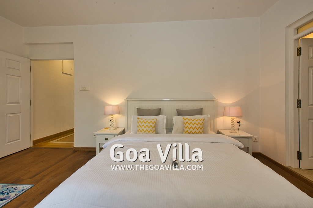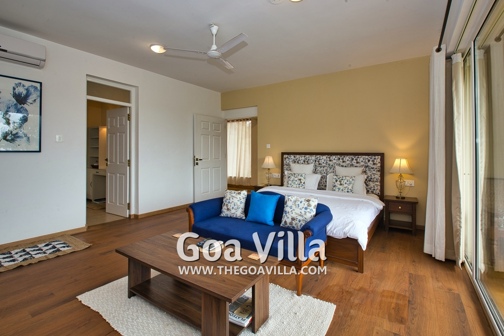 Bedrooms – Morjim Villa has 5 bedrooms, all en-suite and air-conditioned. Filly furnished, there is a large comfortable bed, extra pillows, side table with lamp shades, wardrobe, study table, flat-screen television, sofa, carpet, potted plants, and paintings on the wall. French ceiling-to-wall doors open to the balcony providing views of tall trees and nature. Whitewashed walls calm the mind helping our guests relax. The balcony is wide with a sitting area. Ground floor bedrooms have an outdoor sitting area that extends to the lawn.