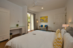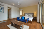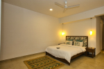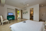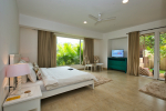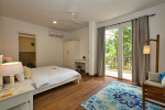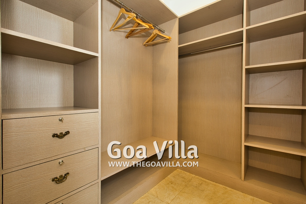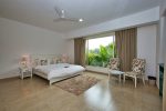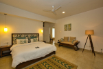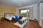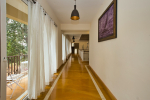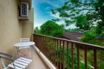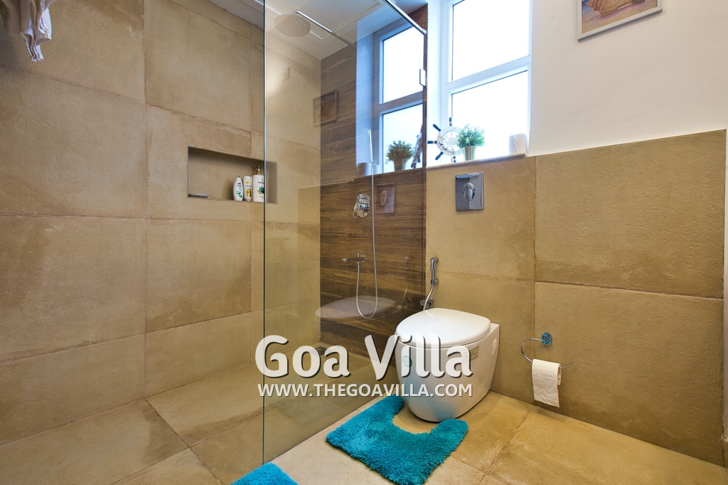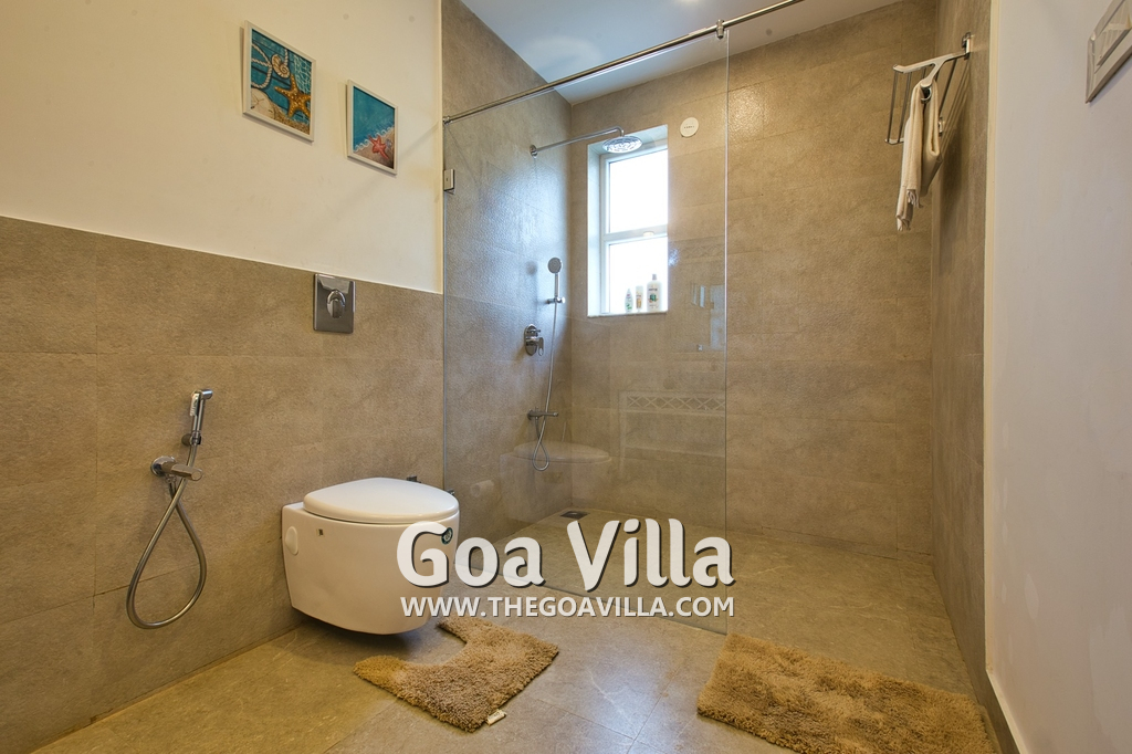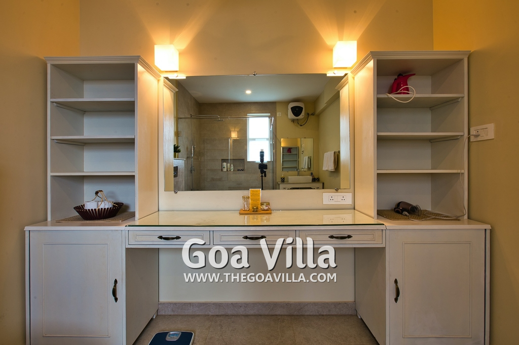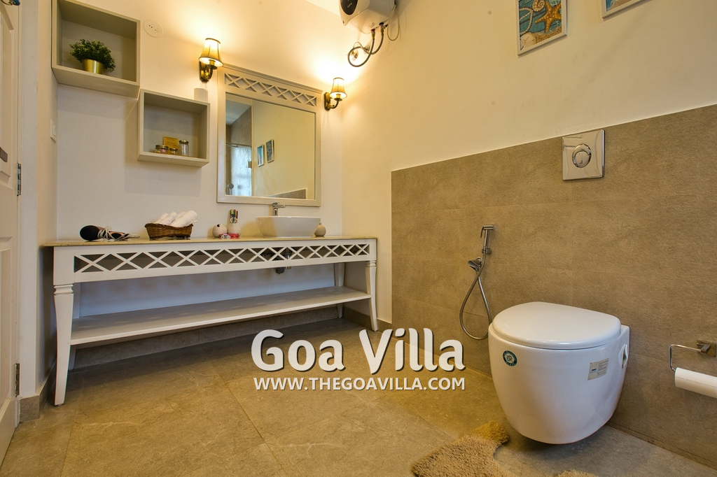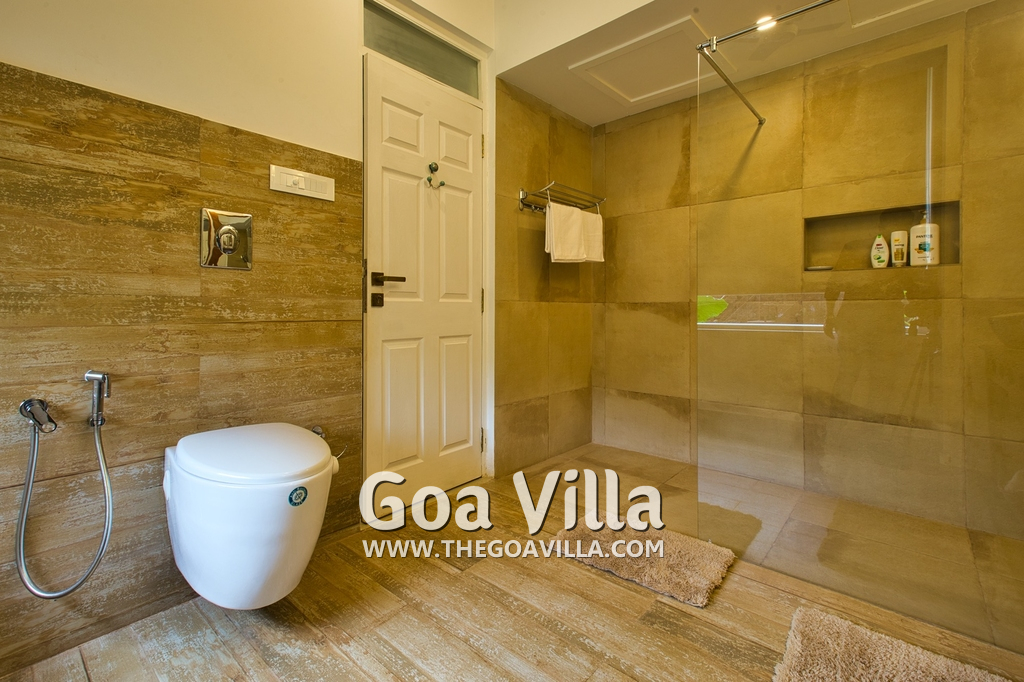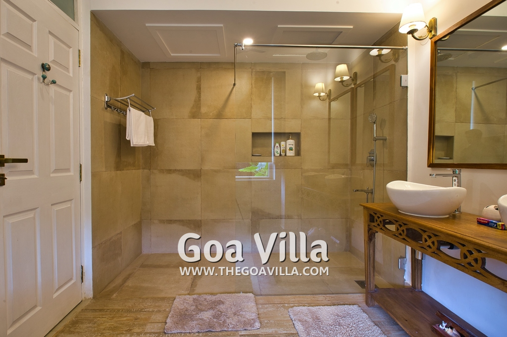 Bedrooms – Morjim Villa has 5 bedrooms, all en-suite and air-conditioned. Filly furnished, there is a large comfortable bed, extra pillows, side table with lamp shades, wardrobe, study table, flat-screen television, sofa, carpet, potted plants, and paintings on the wall. French ceiling-to-wall doors open to the balcony providing views of tall trees and nature. Whitewashed walls calm the mind helping our guests relax. The balcony is wide with a sitting area. Ground floor bedrooms have an outdoor sitting area that extends to the lawn.