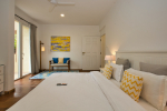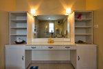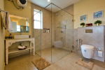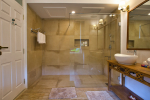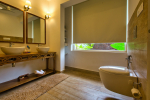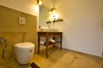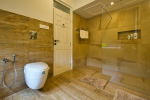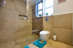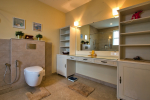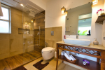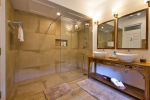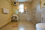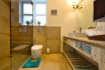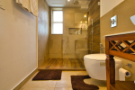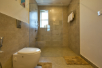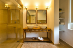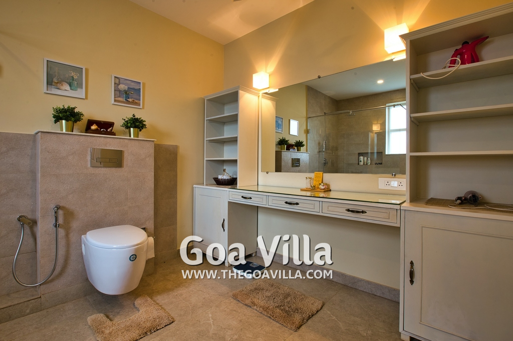 Bathrooms – They are huge and beautiful, full of modern faucets. There is a sink, towel rack, cabinets, mirror, mats, and shower cubicle with rainwater shower. Towels and toiletries are provided.